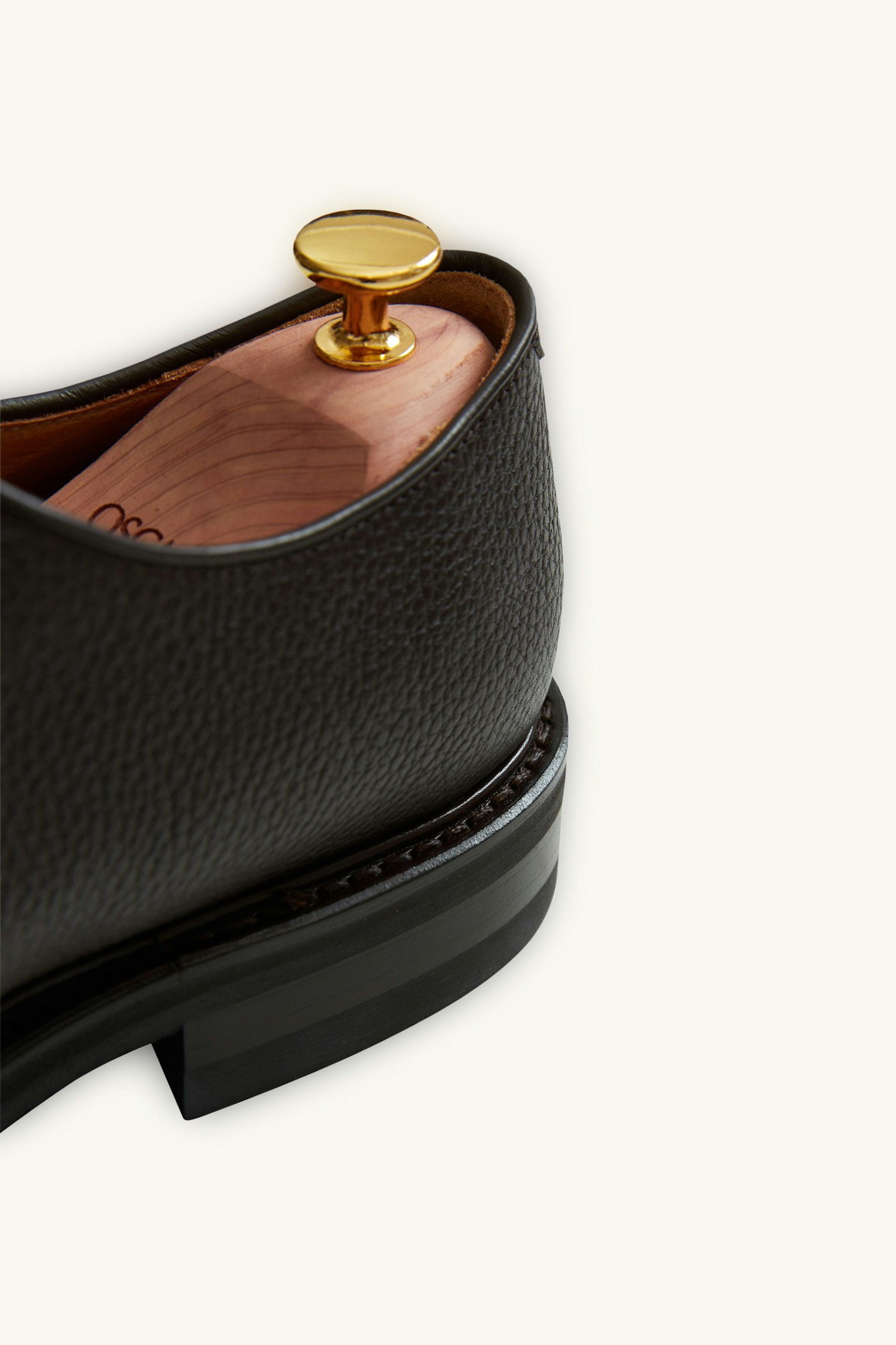 Goodyear-syede Derbysko i spansk vegetabilsk garvet læder med kornstruktur, som tilpasser sig fodens form. Håndlavet i Spanien. Dobbeltsidet gummisål for bedre greb, slidstyrke og vandtæthed i udfordrende vejrforhold. Sålen er fastgjort med en Storm Welt rundt om kanten af sålen for at beskytte konstruktionen bedre mod fugt. Blød støddæmpende indersål i memory foam, der former sig efter foden. Konstruktionen muliggør fremtidig udskiftning af sålen, så du kan have skoene i lang tid, og med vores nye læderbundssål kan skoene tåle endnu flere såludskiftninger.