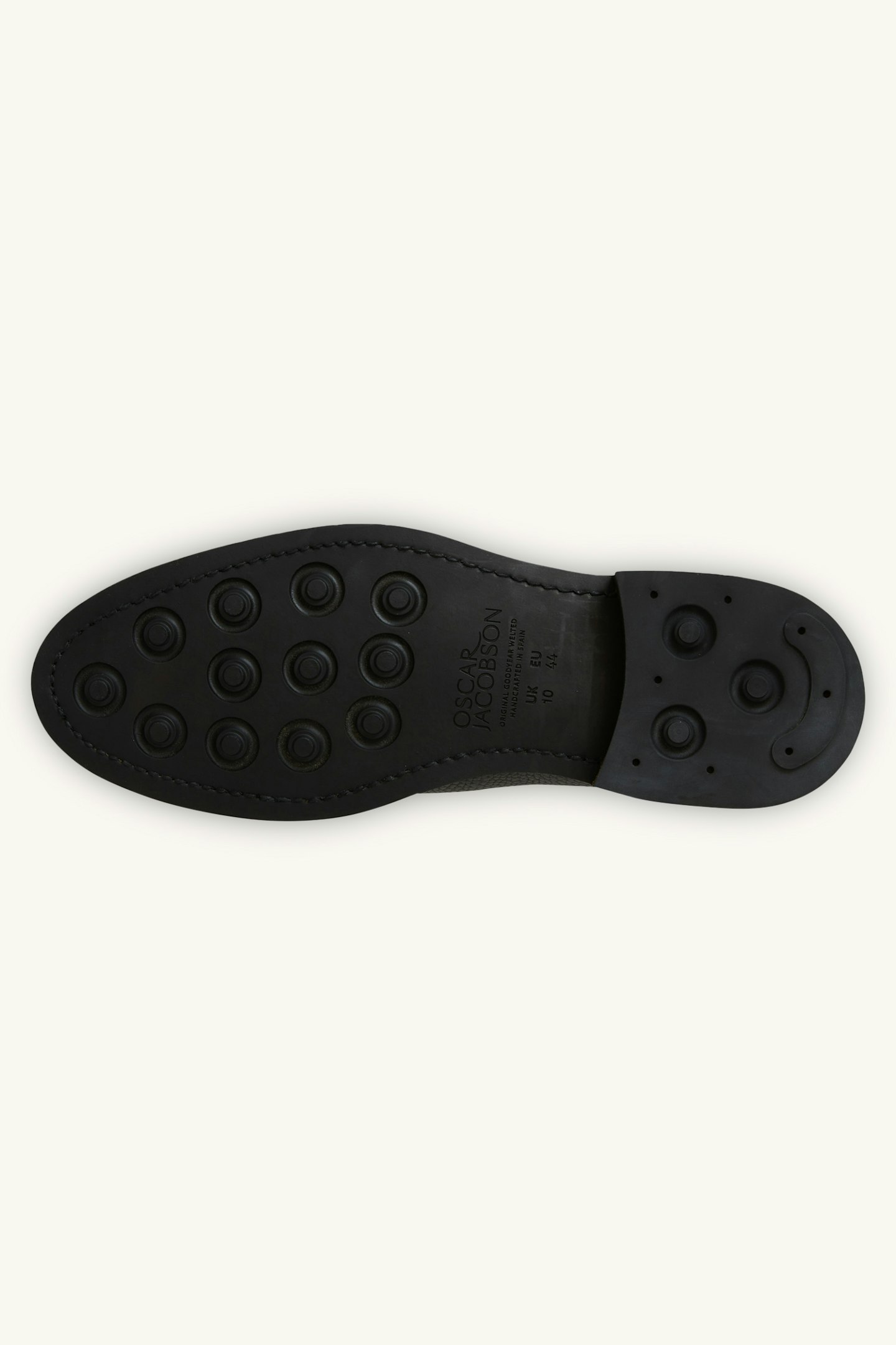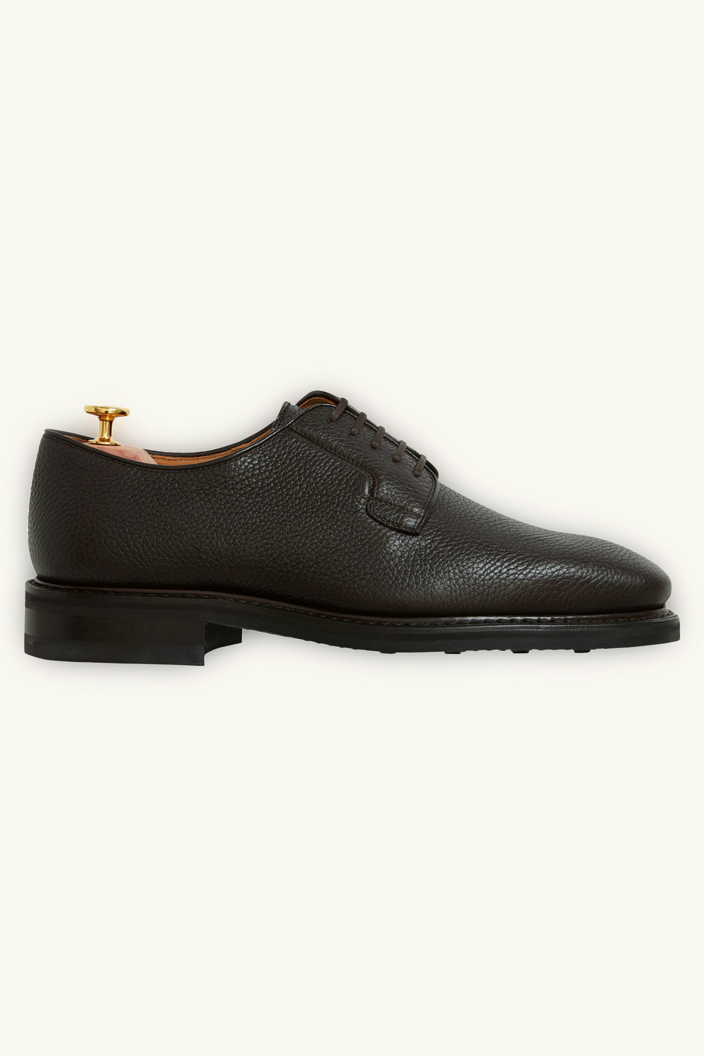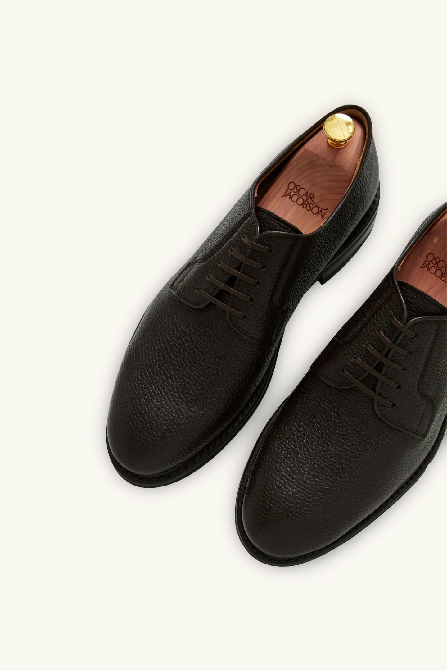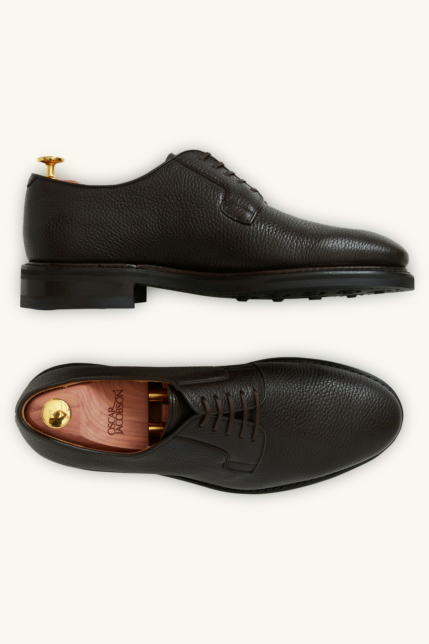 Goodyear-syede Derbysko i spansk vegetabilsk garvet læder med kornstruktur, som tilpasser sig fodens form. Håndlavet i Spanien. Dobbeltsidet gummisål for bedre greb, slidstyrke og vandtæthed i udfordrende vejrforhold. Sålen er fastgjort med en Storm Welt rundt om kanten af sålen for at beskytte konstruktionen bedre mod fugt. Blød støddæmpende indersål i memory foam, der former sig efter foden. Konstruktionen muliggør fremtidig udskiftning af sålen, så du kan have skoene i lang tid, og med vores nye læderbundssål kan skoene tåle endnu flere såludskiftninger.