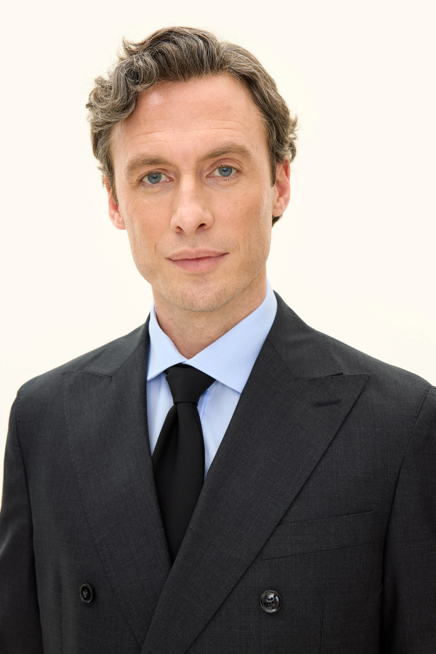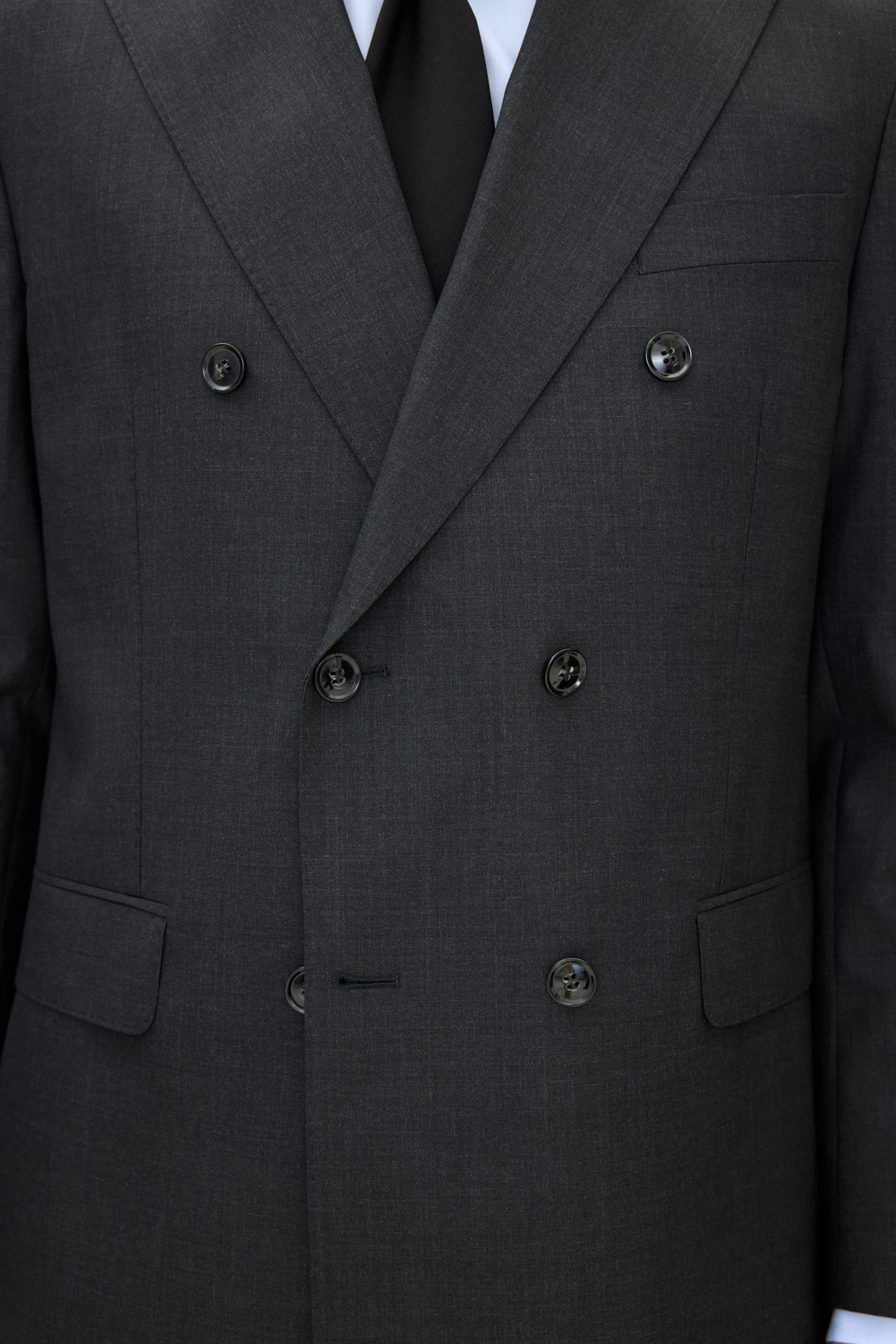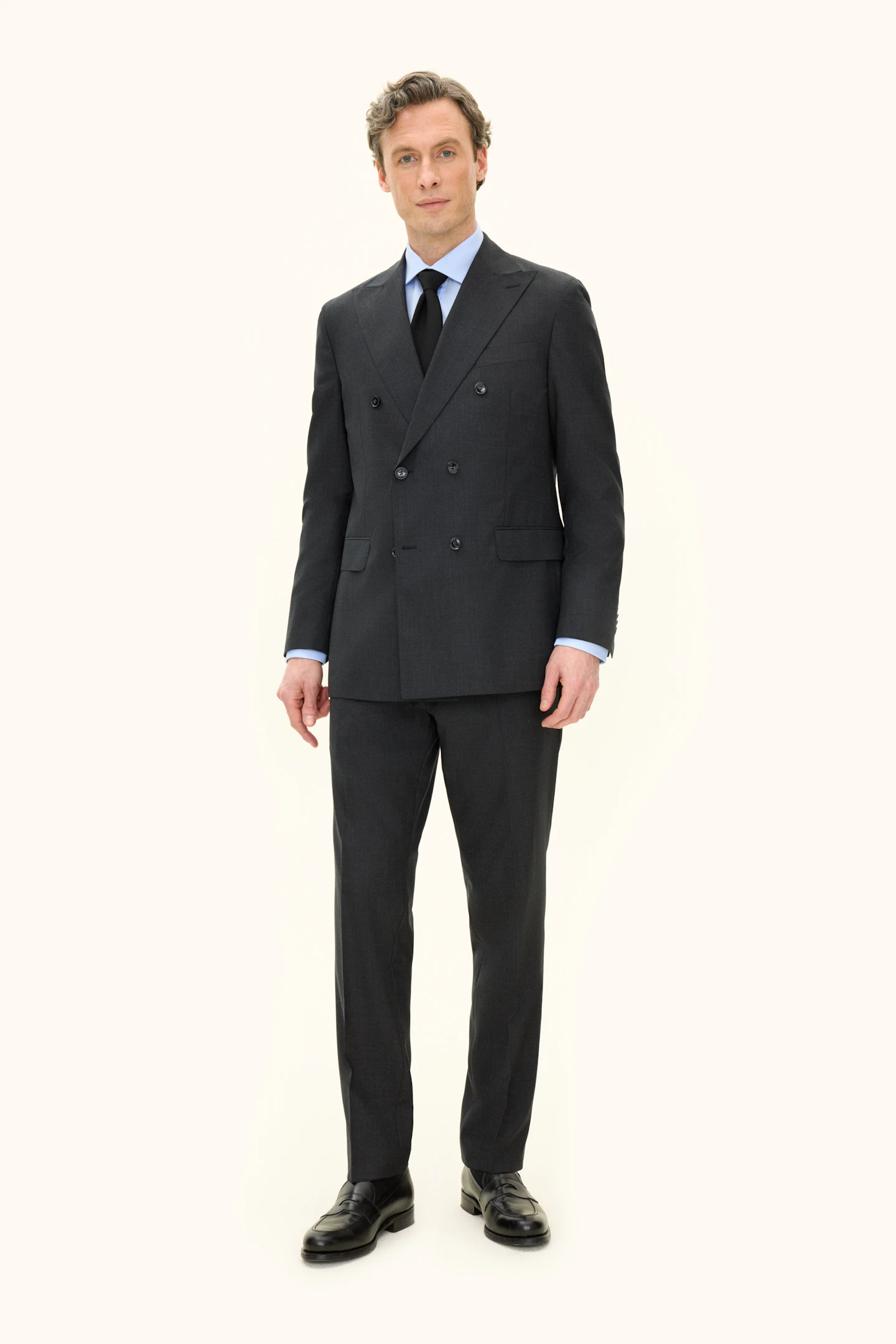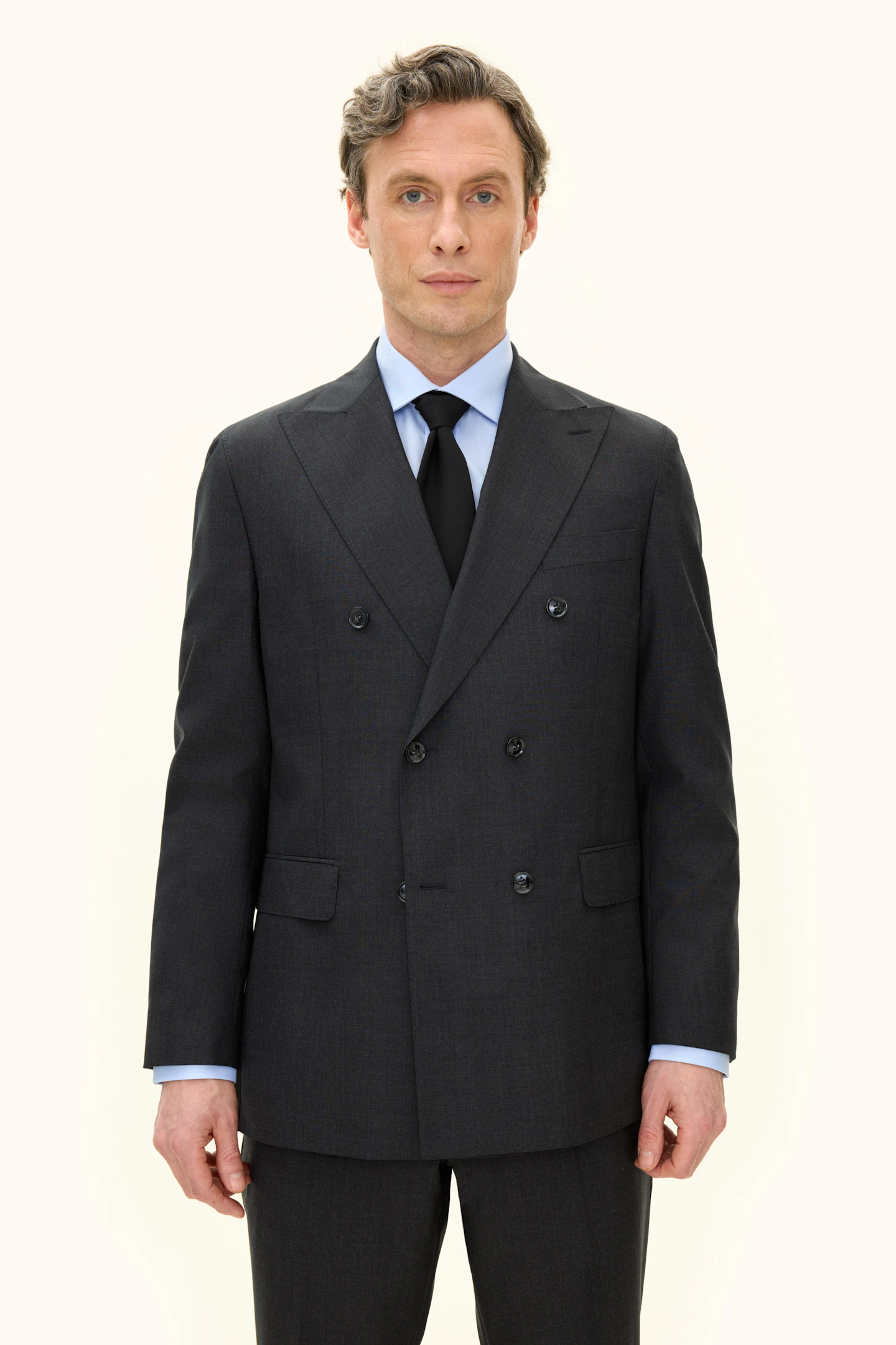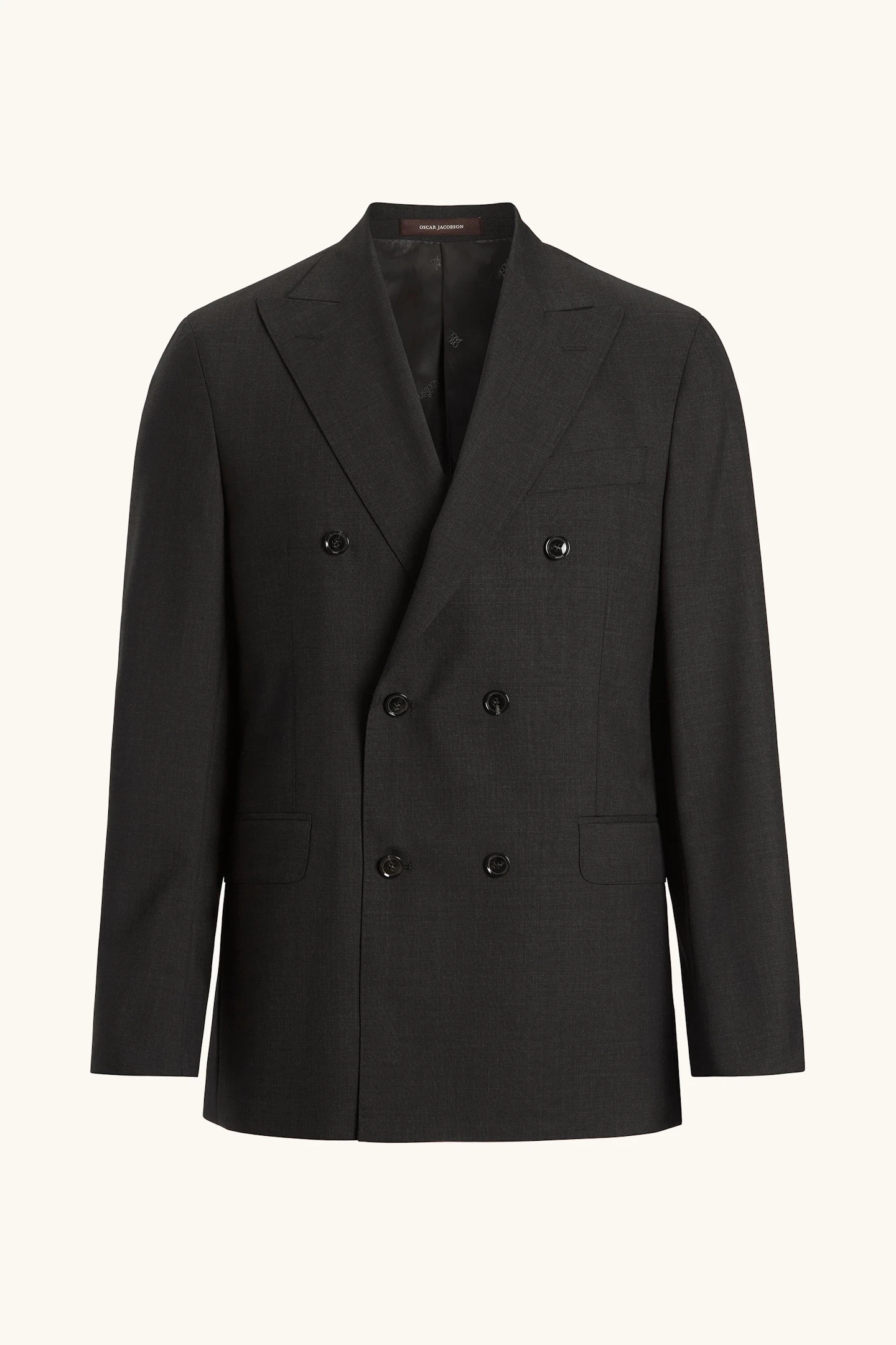 Helforet dobbeltradet blazer i normal pasform med brede spidse revers og blødt konstrueret skulder. Lavet i et blødt uldflannel.