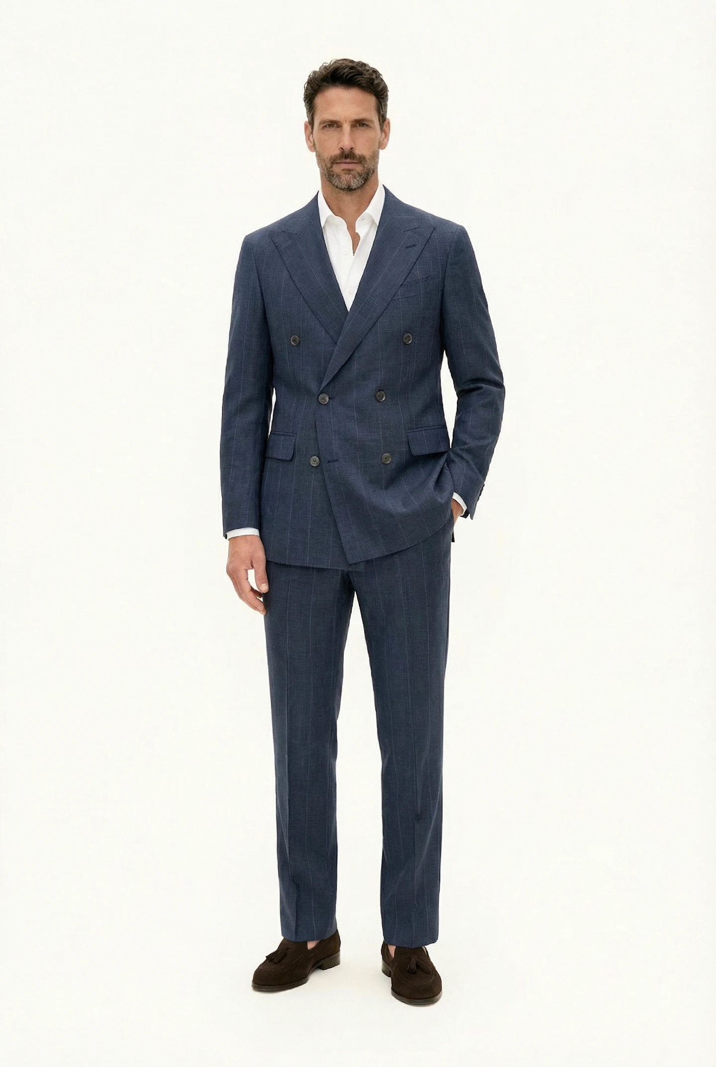 Richard-blazeren er dobbeltradet og designet som en del af et jakkesæt. Stoffet fra Lanificio Zegna er vævet i en twillstruktur med en diskret stribe, hvor uld, hør og silke arbejder sammen for at give styrke, tekstur og en let glans. Silhuetten er afbalanceret med lidt bredere skuldre og spids revers. Konstruktionen er bygget med fokus på pasform og proportioner, med detaljer, der understøtter modellens form og fleksibilitet.