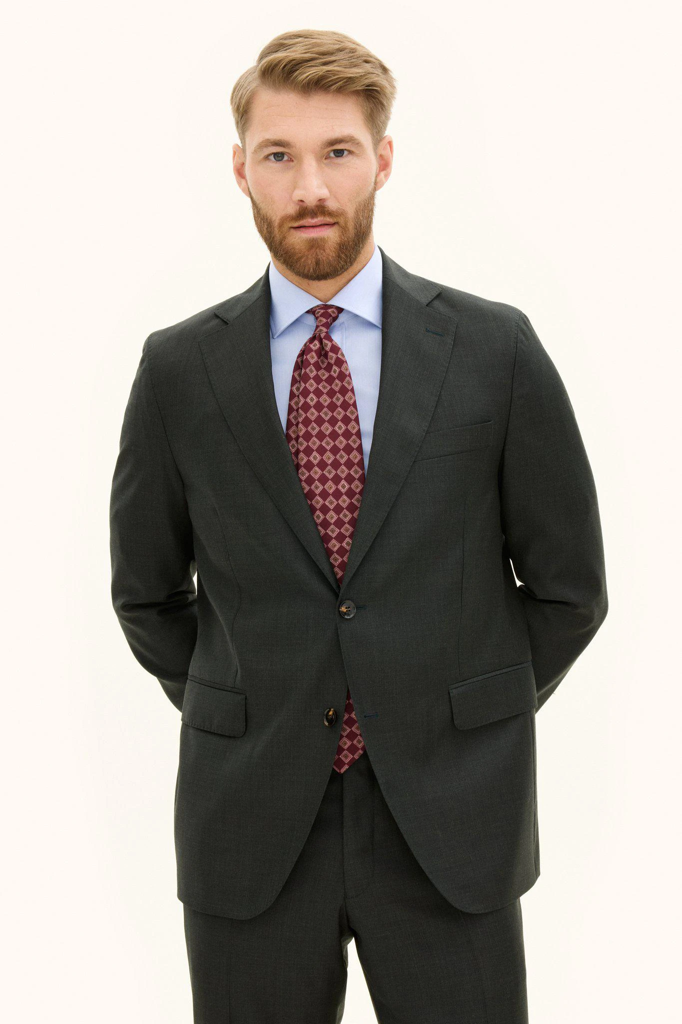 Enkeltradet jakkesæt i premium 100% uld, skåret i en gennemtænkt regular pasform. Dette raffinerede stykke tøj forener klassisk håndværk med en moderne silhuet og er den ideelle ledsager til både forretningsmæssige og afslappede lejligheder.