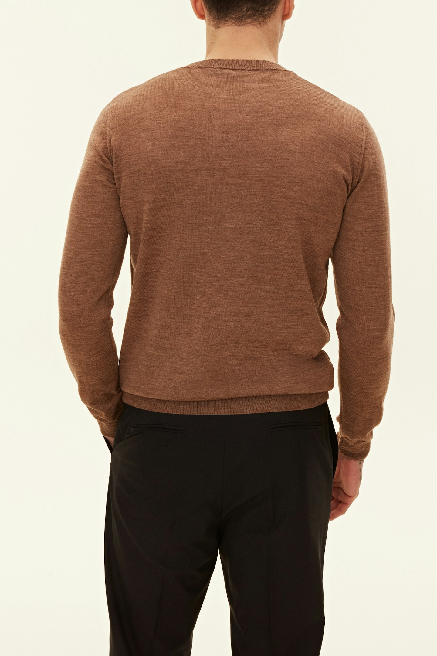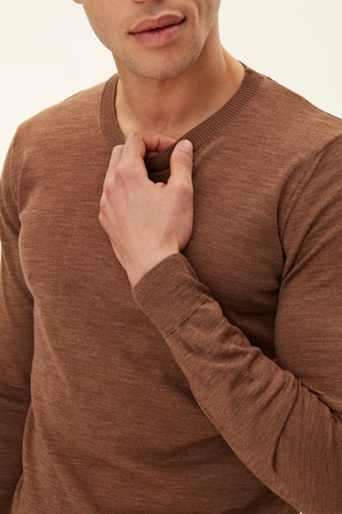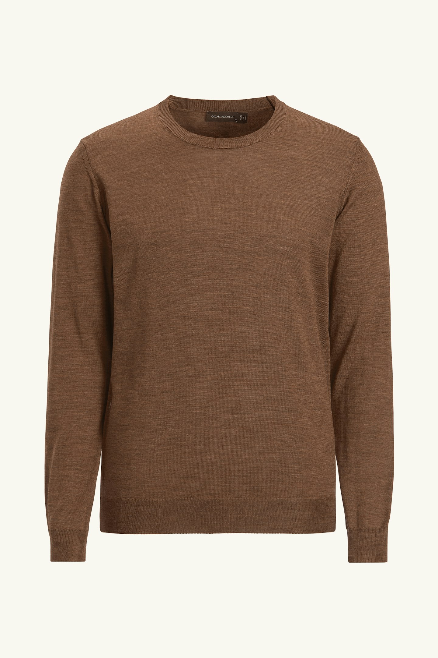Rundhalset strik i ekstra fin merinould fra Tollegno, Italien. Uldfibrene er lange, hvilket giver tøjet en luksuriøs og blank overflade. Enkel halsrib i dobbelt garn, der giver et godt hold. Tyndt strikket, 14gg som er god at have under en blazer.