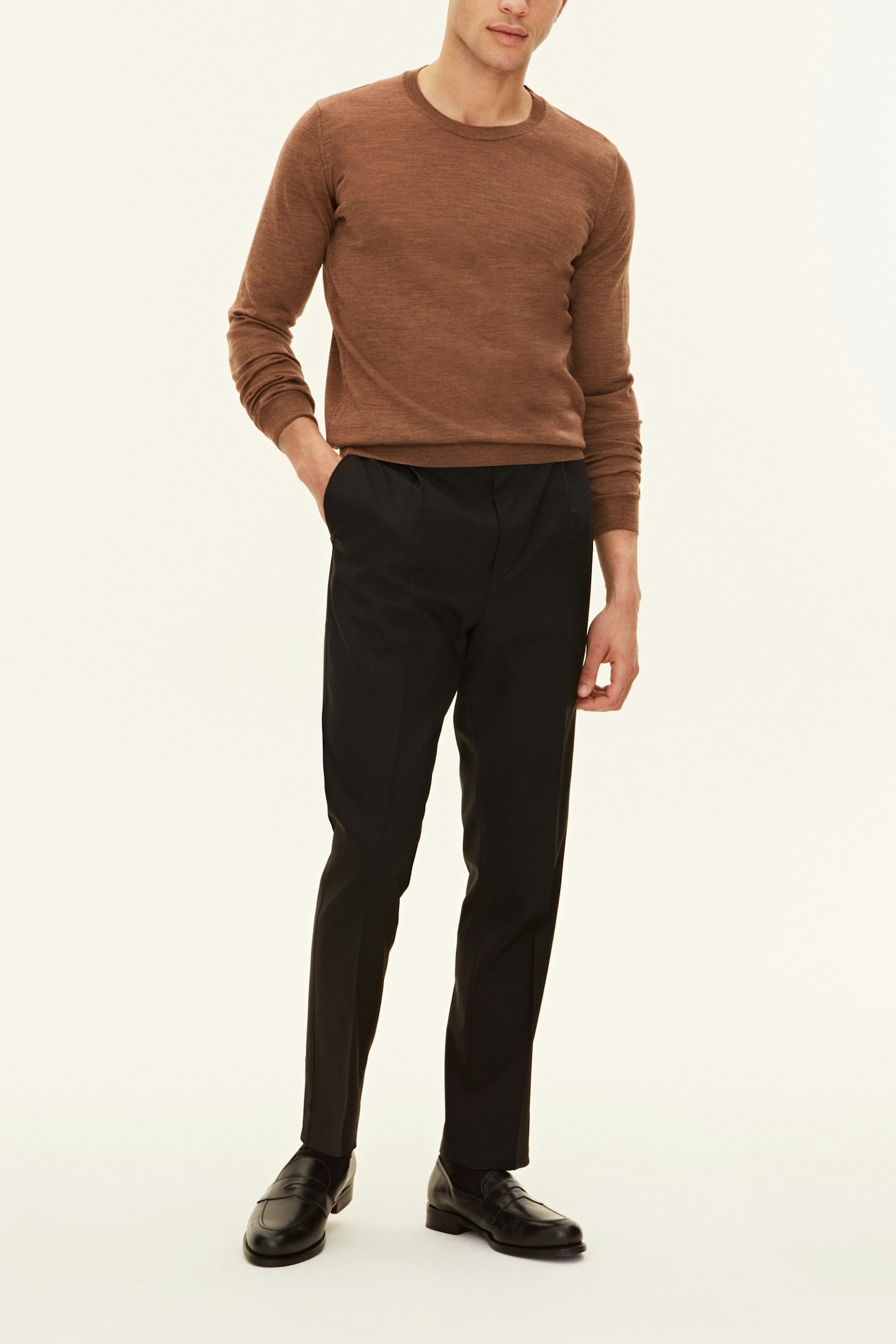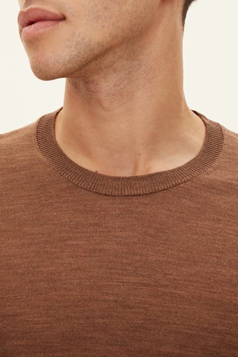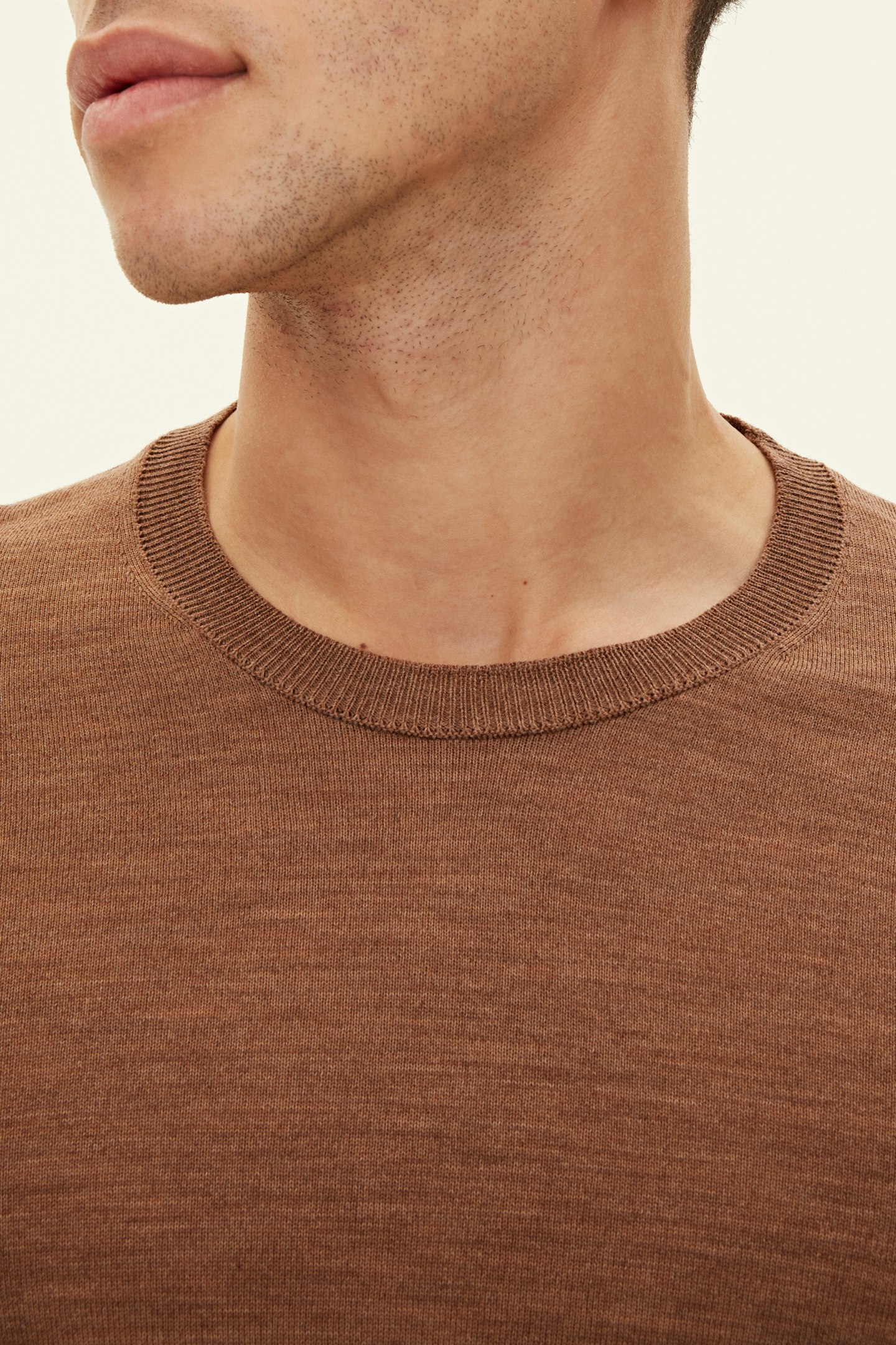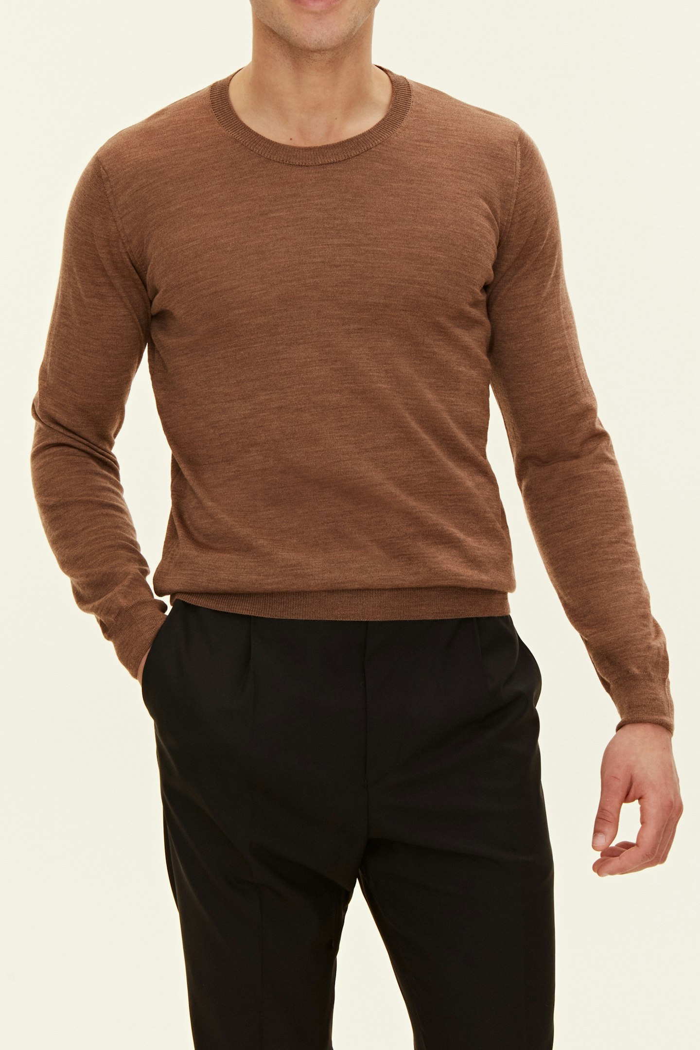 Rundhalset strik i ekstra fin merinould fra Tollegno, Italien. Uldfibrene er lange, hvilket giver tøjet en luksuriøs og blank overflade. Enkel halsrib i dobbelt garn, der giver et godt hold. Tyndt strikket, 14gg som er god at have under en blazer.
