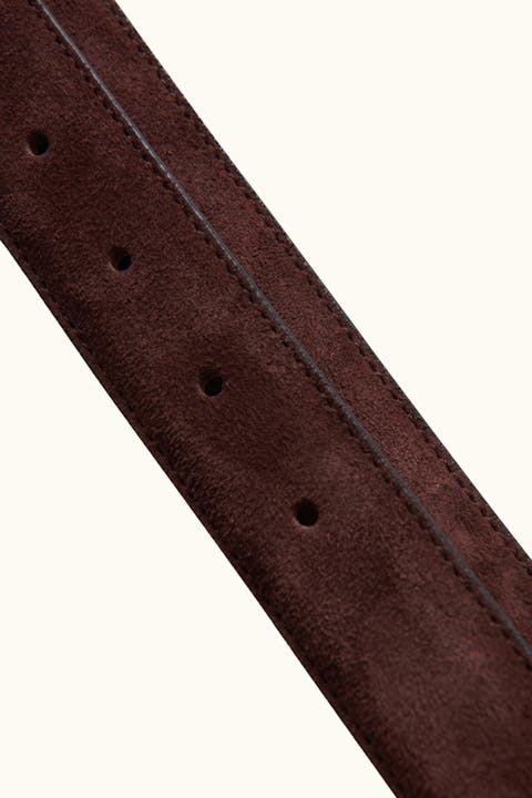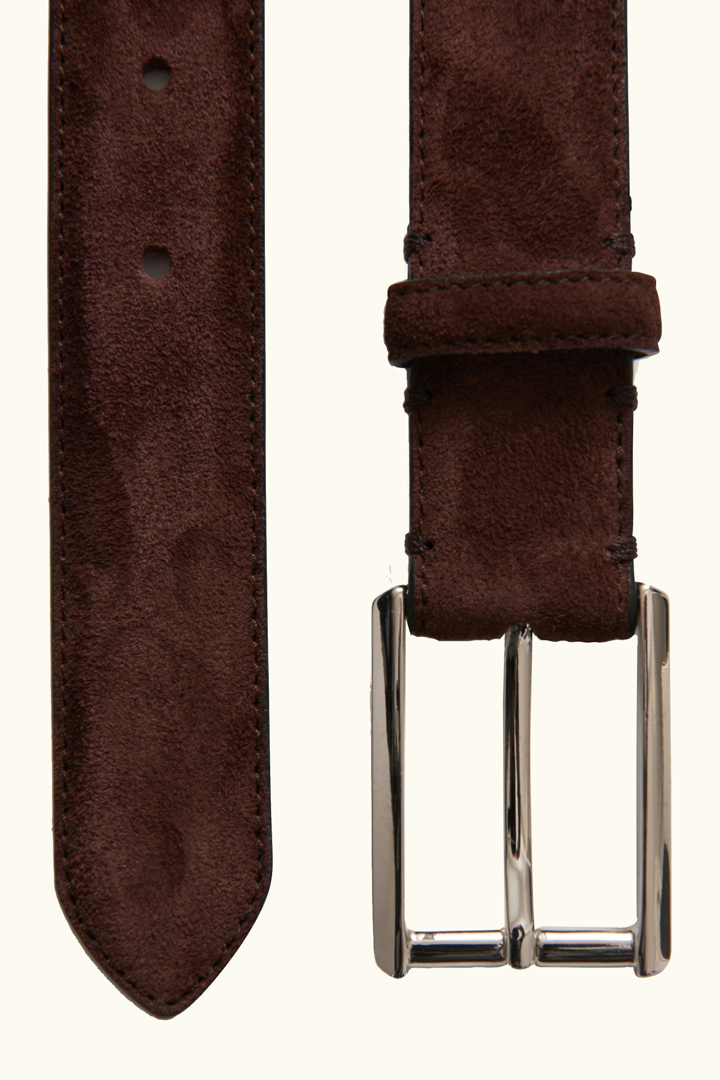 Nubuck-foret bælte i italiensk finkornet ruskind med sølvfarvet spænde. Håndlavet i Spanien. Bæltet er 30 mm bredt for at fungere både til et formelt jakkesæt eller et par afslappede jeans.