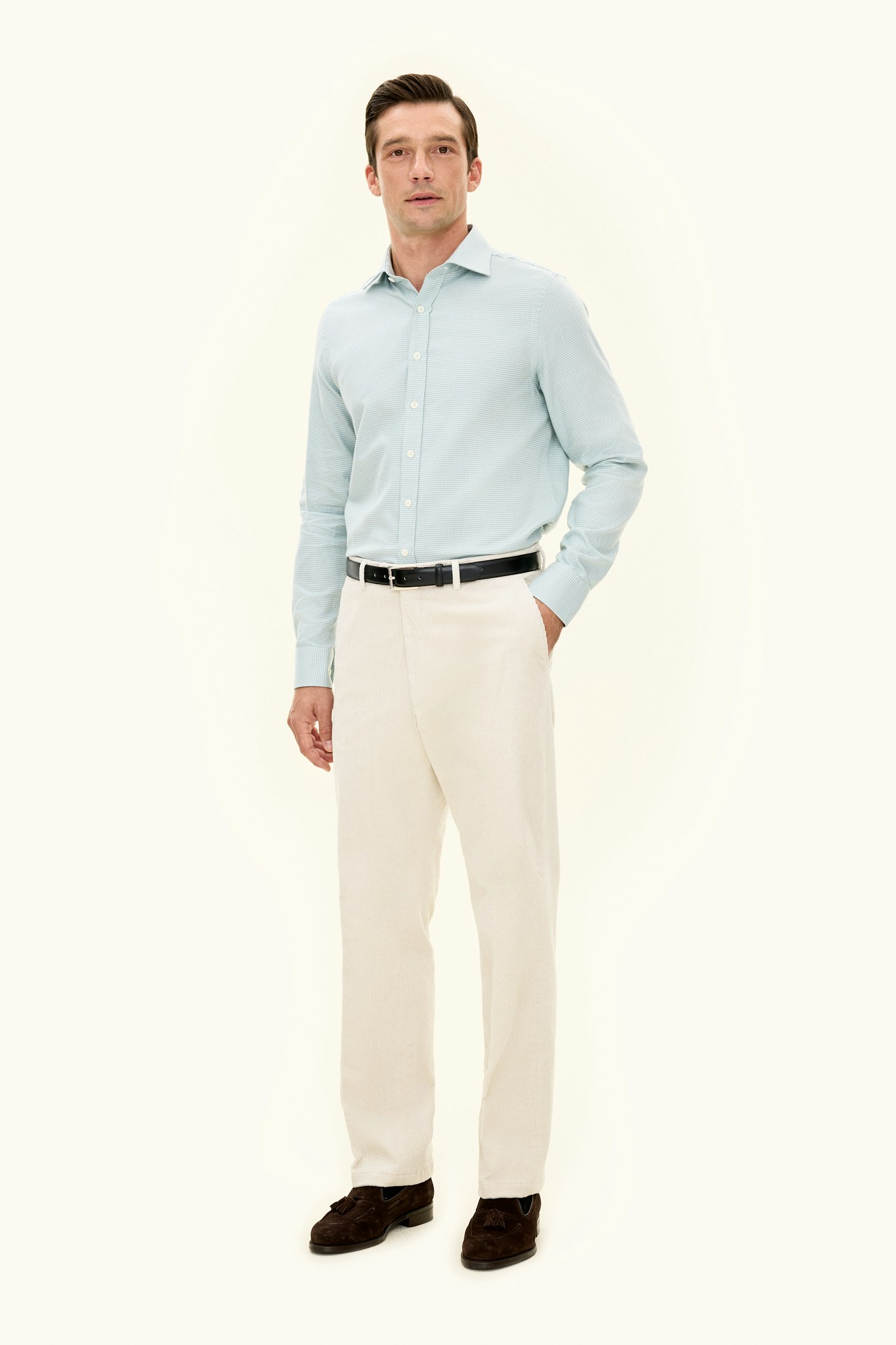 Slim fit skjorte i blød bomuldsflannel med cut away krave og enkelt manchet. En moderne klassiker, der blander afslappet elegance med hverdagslig raffinement.