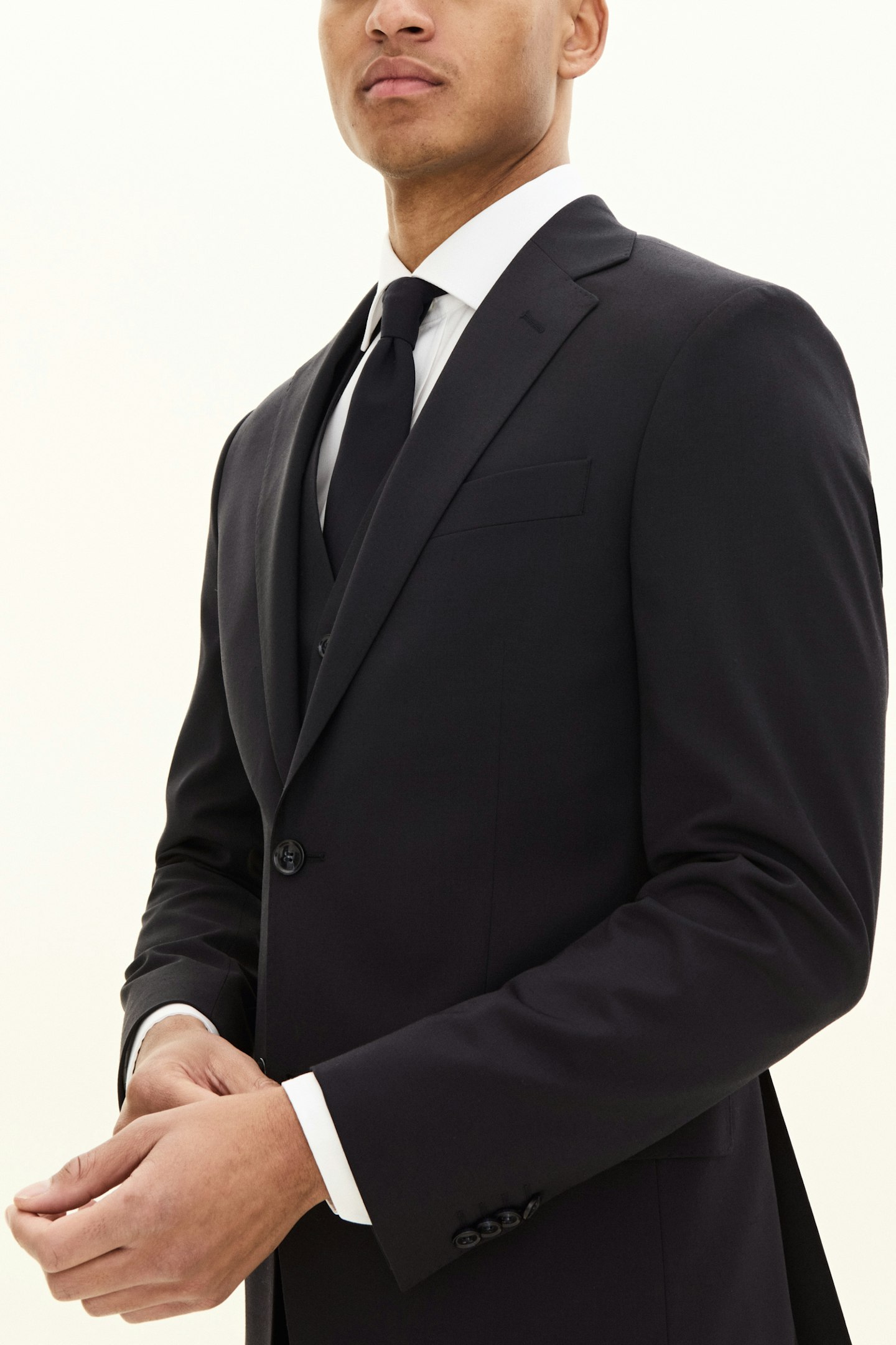 En klassisk blazer i slim fit, der passer til både kontor og fest. Denne model har en blød konstrueret skulder, fuldt indvendigt for i viskose og stilfulde lommeklapper. metervaren er en slidstærk uldstretch, der er velegnet til daglig brug. Match med alt fra en skjorte og slips til en polo eller rullekrave!