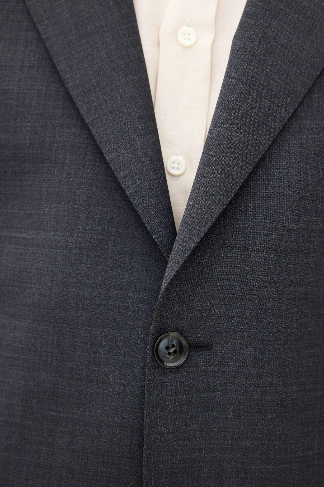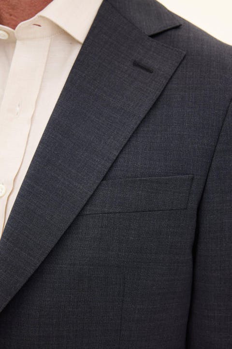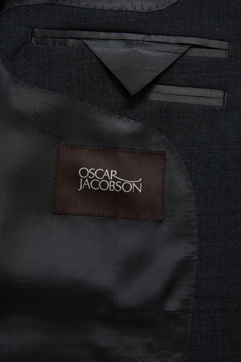 Klubtøj i mørkeblåt uldgarn med struktur fra det italienske væveri Marzotto. En blød konstruktion, hvor mellemlag og skulderopbygning er næsten ikke-eksisterende. Jakken er foret og har lommer med lommeklap. De tilhørende bukser har en klassisk, let tilspidset pasform og en normaltalje.