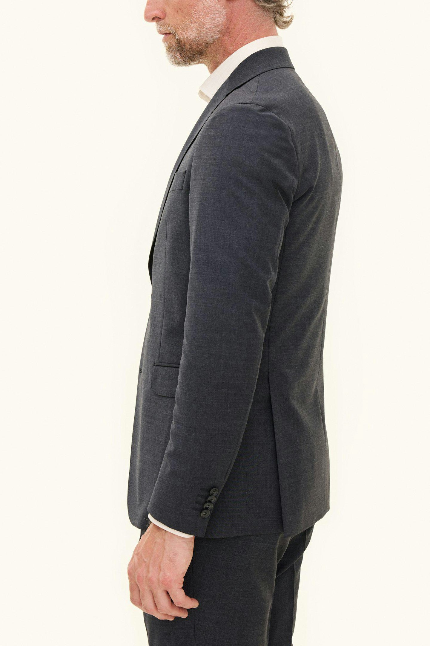 Klubtøj i mørkeblåt uldgarn med struktur fra det italienske væveri Marzotto. En blød konstruktion, hvor mellemlag og skulderopbygning er næsten ikke-eksisterende. Jakken er foret og har lommer med lommeklap. De tilhørende bukser har en klassisk, let tilspidset pasform og en normaltalje.