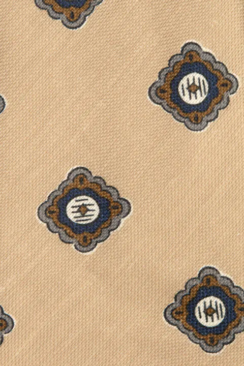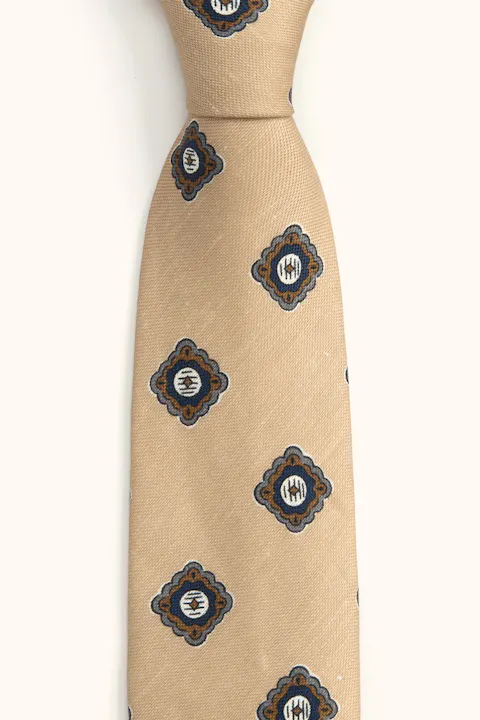 A tie in a linen blend featuring a decorative medallion print. The knitted silk texture gives a soft, refined finish with subtle depth. A sophisticated accessory that adds character to both formal and smart-casual outfits.