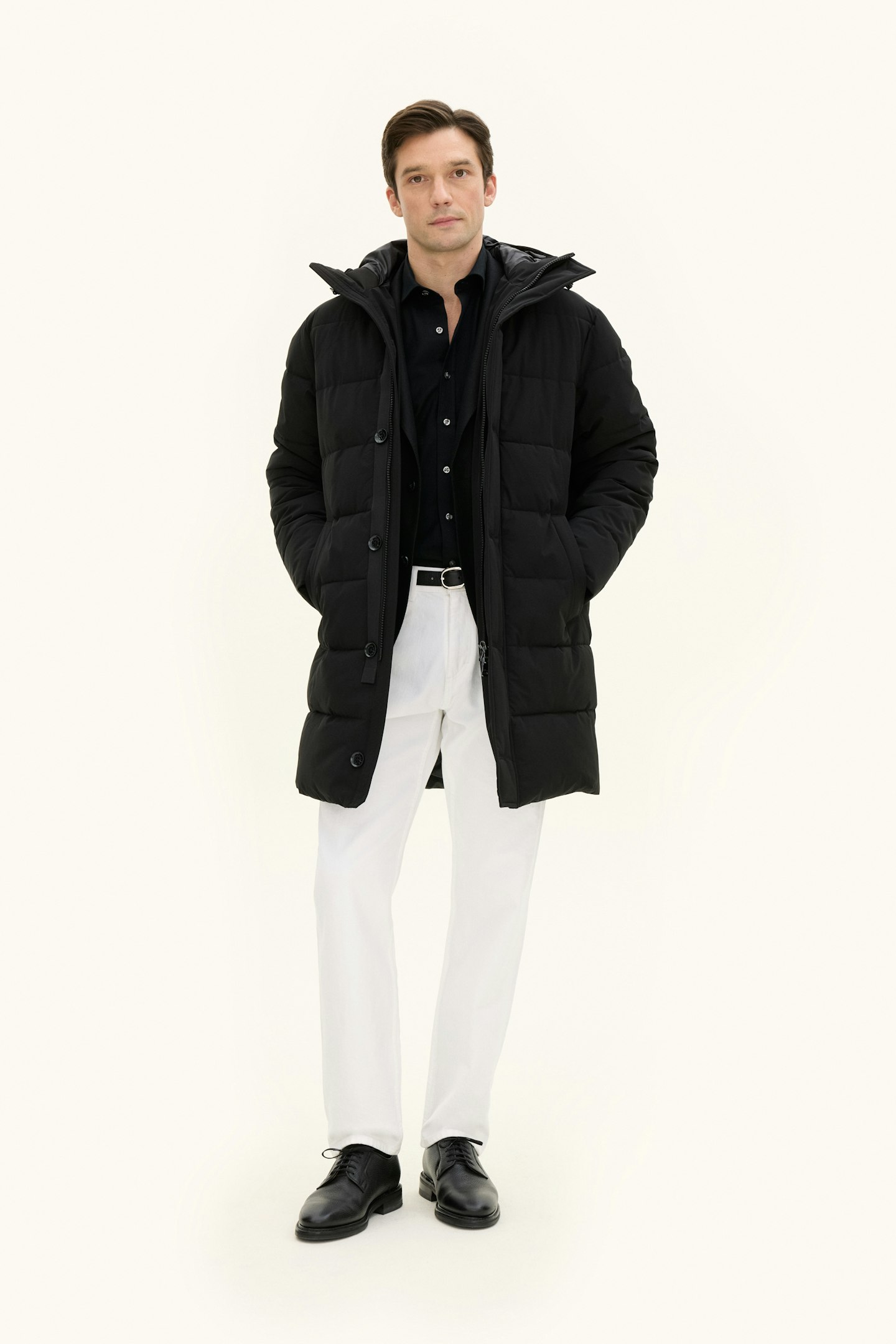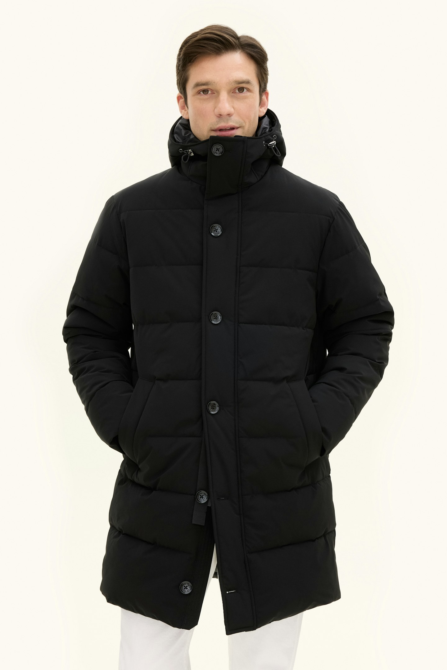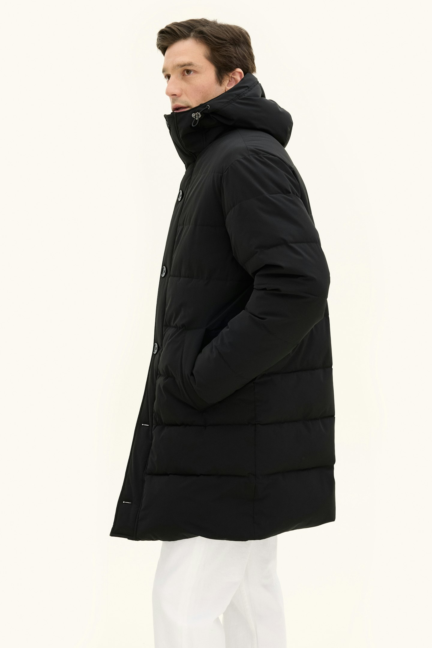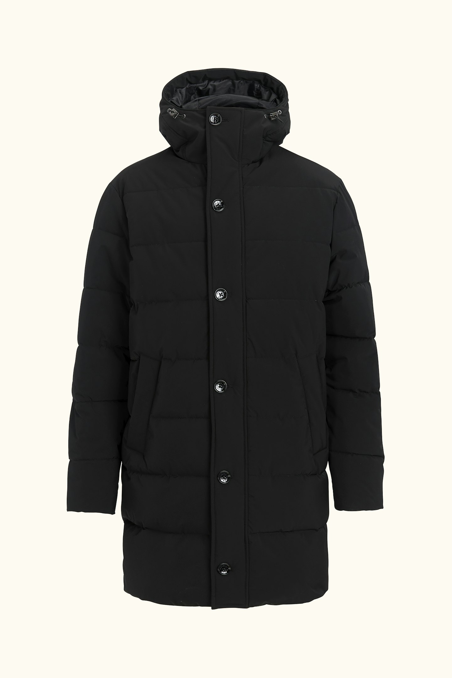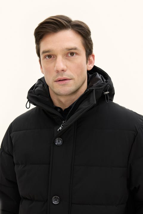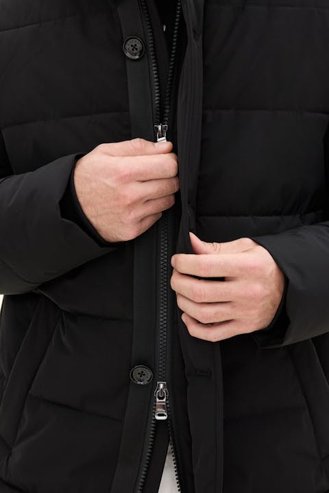 Our Padded Parka with Insulation Membrane is crafted to be the warmest and most weather-resistant jacket in our collection, without compromising wearability. The clean, classic design ensures it pairs great with functional clothing as well as trousers and jeans. Beyond its water-repellent and water-resistant shell, the jacket is lined with 450g of plant-based Sorona Padding, keeping you warm through the winter. The high button closure, along with an adjustable hood and waist, provides extra protection on cold days. Inside, a durable ripstop lining with three pockets adds to its practicality. The Insulation Membrane, a two-layer isolating shell, is engineered to shield you from wind and weather while maintaining mobility, breathability, and style.