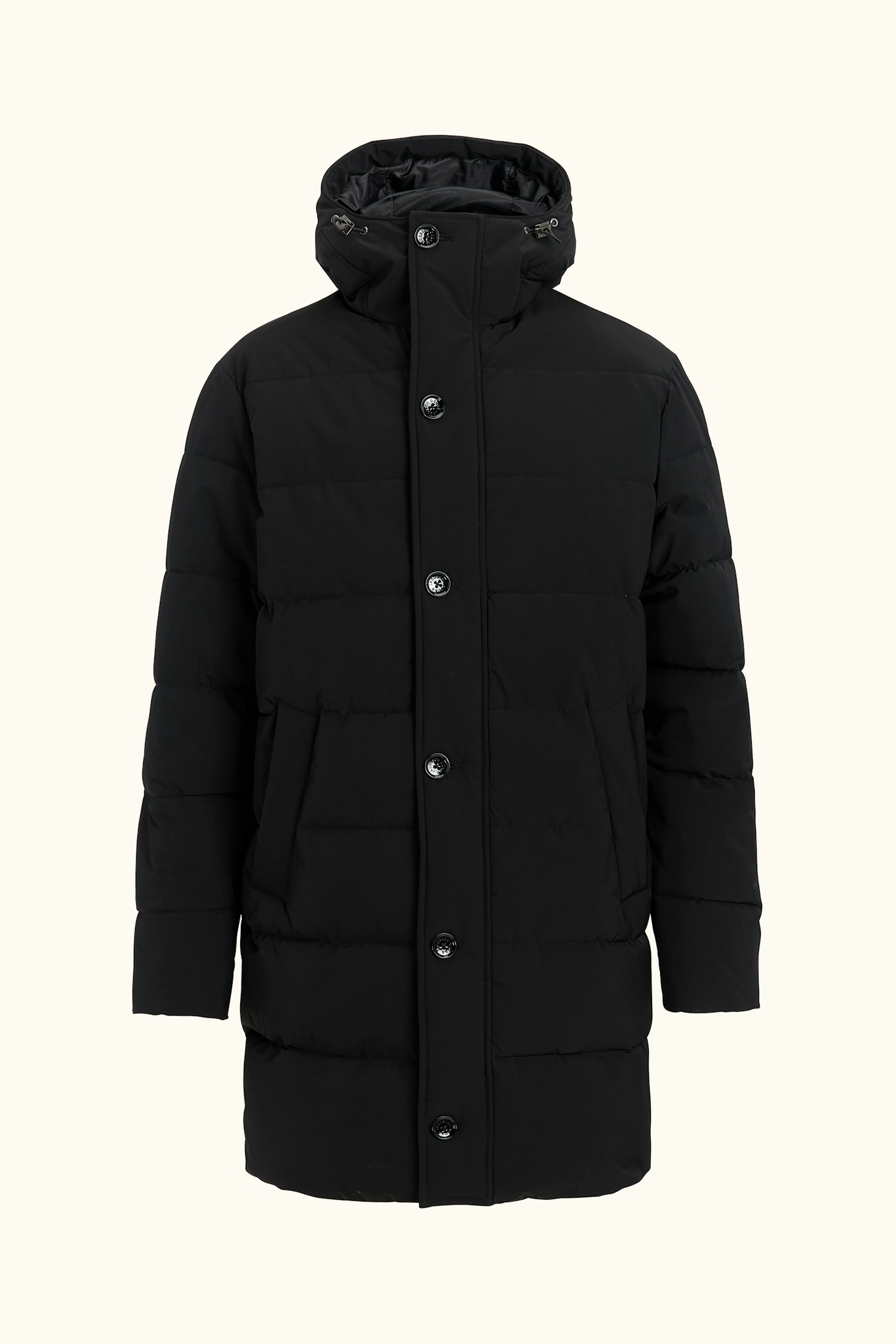 Our Padded Parka with Insulation Membrane is crafted to be the warmest and most weather-resistant jacket in our collection, without compromising wearability. The clean, classic design ensures it pairs great with functional clothing as well as trousers and jeans. Beyond its water-repellent and water-resistant shell, the jacket is lined with 450g of plant-based Sorona Padding, keeping you warm through the winter. The high button closure, along with an adjustable hood and waist, provides extra protection on cold days. Inside, a durable ripstop lining with three pockets adds to its practicality. The Insulation Membrane, a two-layer isolating shell, is engineered to shield you from wind and weather while maintaining mobility, breathability, and style.