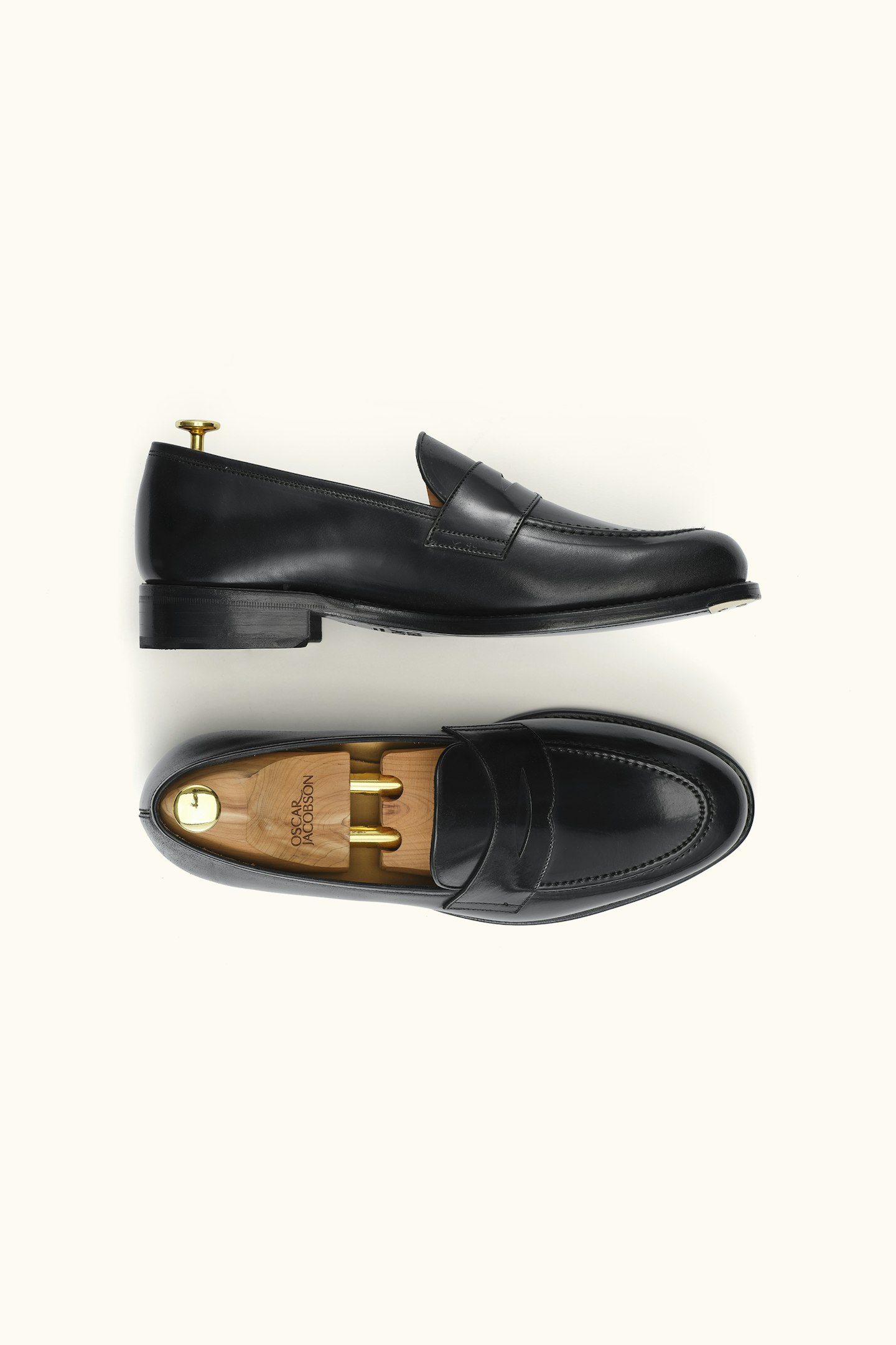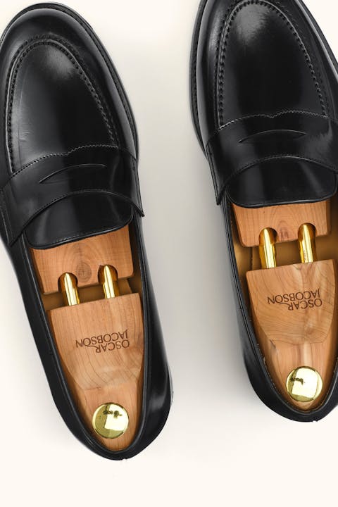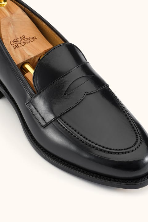Goodyear welted penny loafers in luxurious Spanish cordovan leather with an unbeatable shine. Developed in collaboration with Gentlemanualen and handcrafted in Spain using genuine craftsmanship and carefully selected materials. Cordovan is one of the most exclusive leathers in the world – known for its virtually unmatched durability, high gloss, and long-lasting resilience. Thanks to the natural oils in the leather, it requires minimal maintenance while resisting weather conditions and frequent wear. Over time, the leather develops beautiful, soft creases and a deep, mirror-like shine that can easily be restored with a few strokes of a horsehair brush. The vegetable-tanned leather sole is equipped with recessed brass toe taps for extra durability, while the softly cushioned memory foam insole molds to the foot for superior comfort. The construction allows for future resoling – so you can wear and care for the shoes for many years to come.