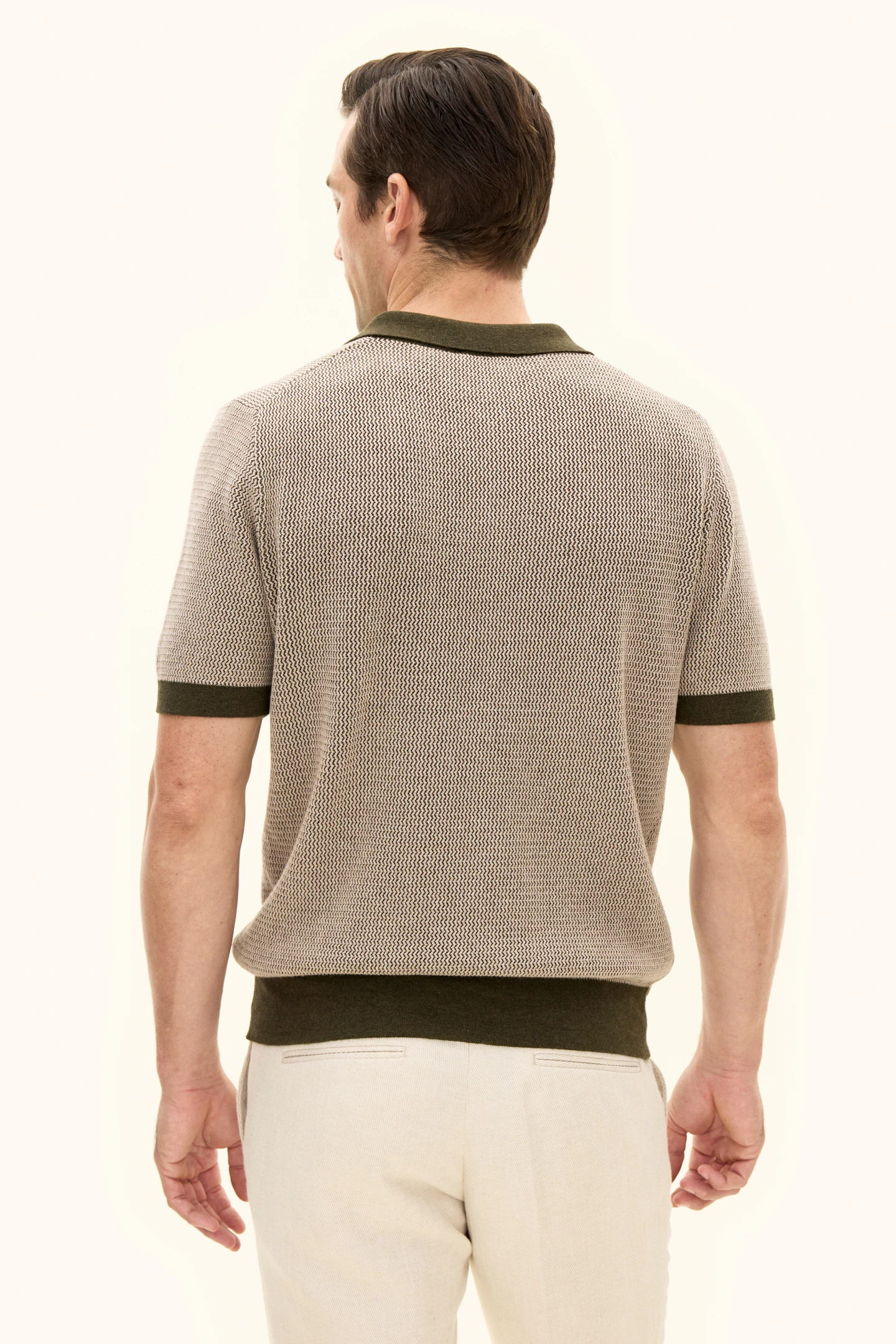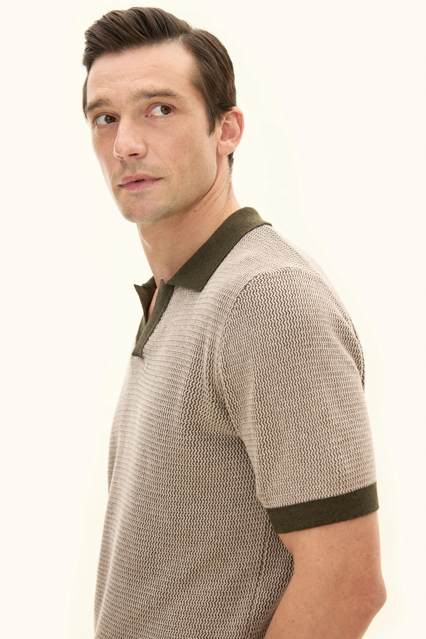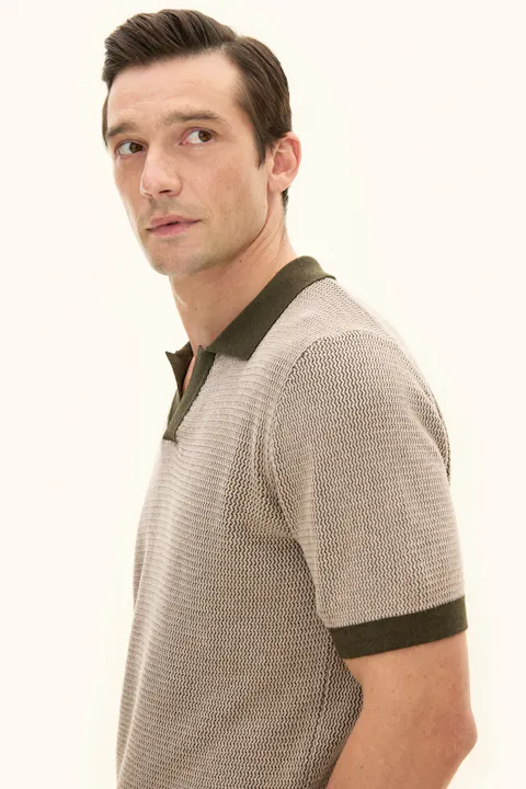Short-sleeved knitted collared sweater in cotton. Crafted with melange yarns that create a subtle effect in the texture, visible throughout the garment. Knitted in 12gg. Designed without buttons at the front for a relaxed look. A great sweater to wear with drawstring trousers, but it can just as easily be styled under a relaxed suit or blazer.