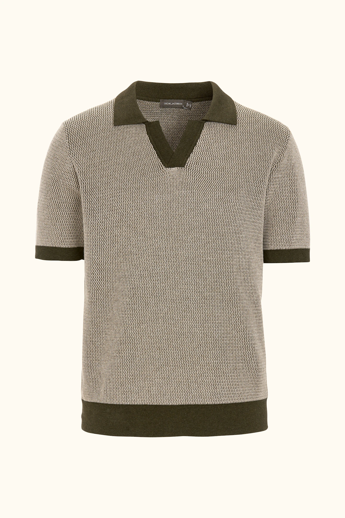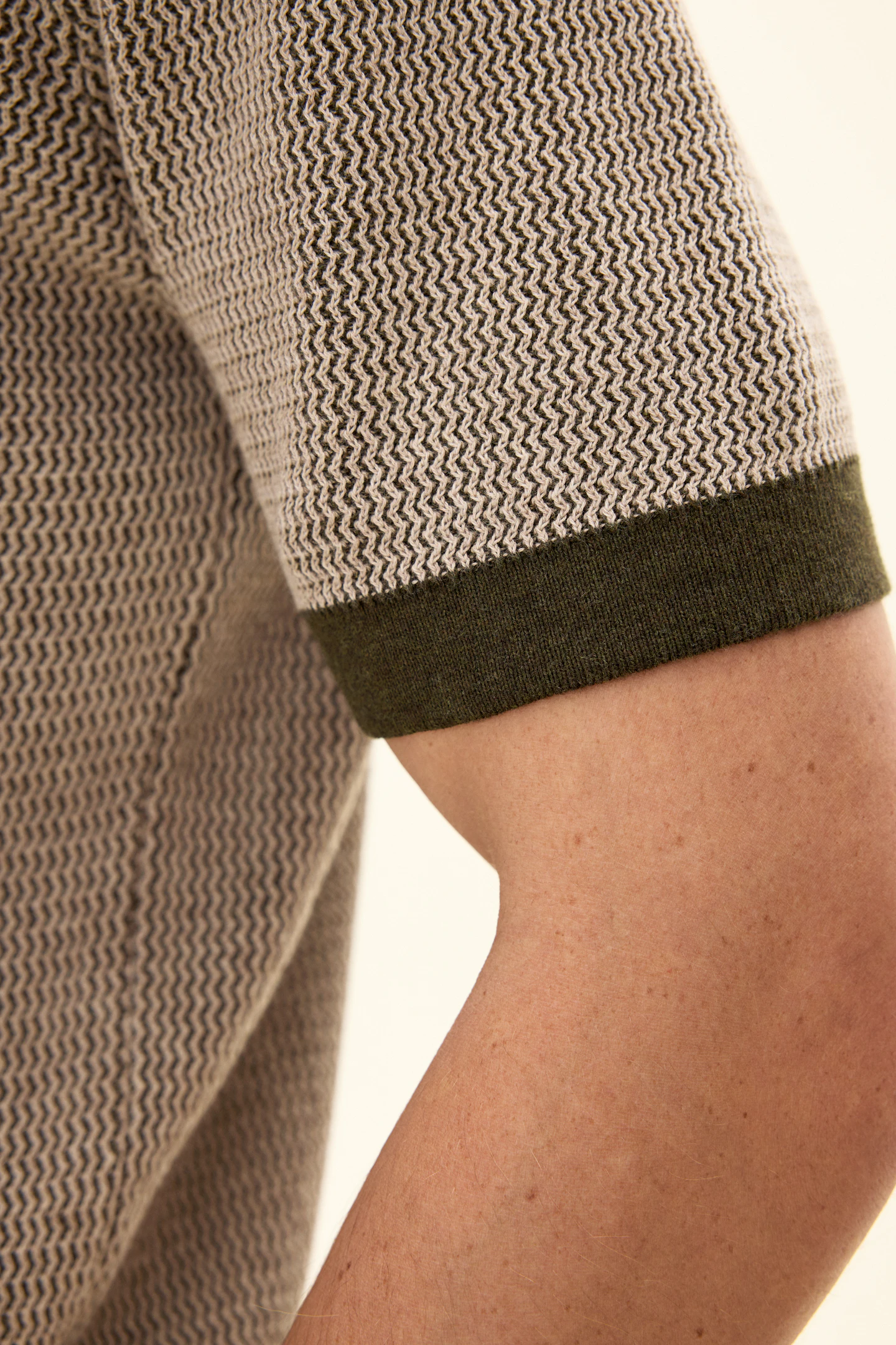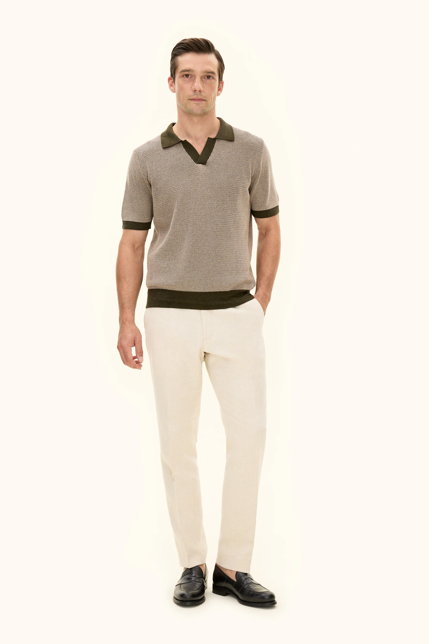 Short-sleeved knitted collared sweater in cotton. Crafted with melange yarns that create a subtle effect in the texture, visible throughout the garment. Knitted in 12gg. Designed without buttons at the front for a relaxed look. A great sweater to wear with drawstring trousers, but it can just as easily be styled under a relaxed suit or blazer.