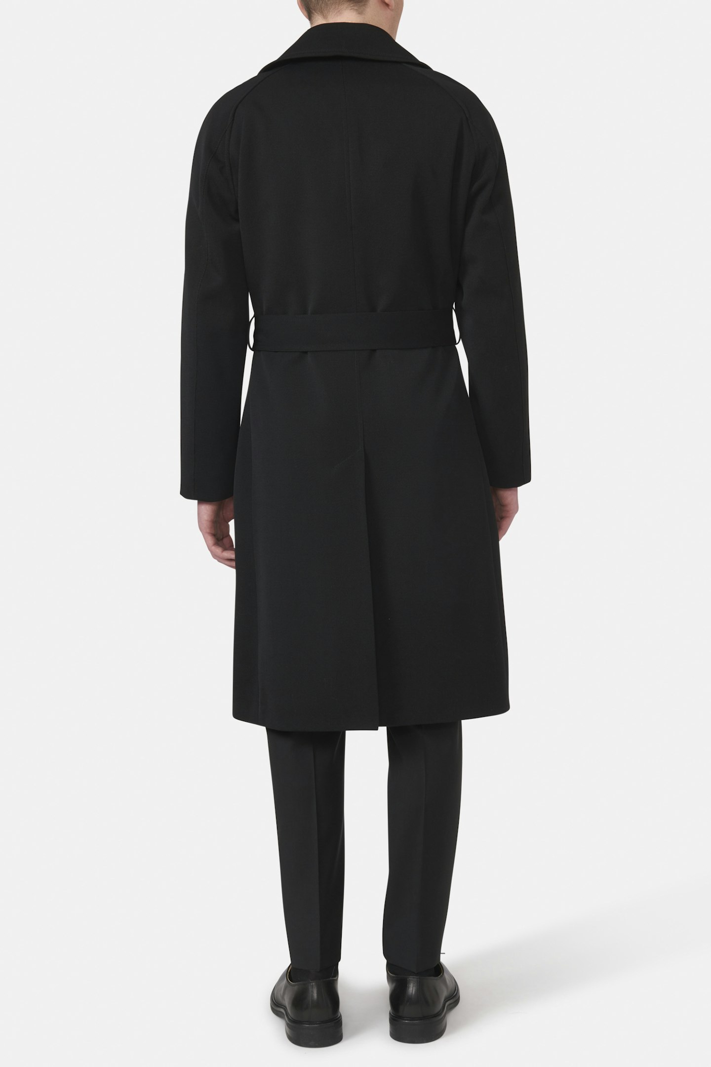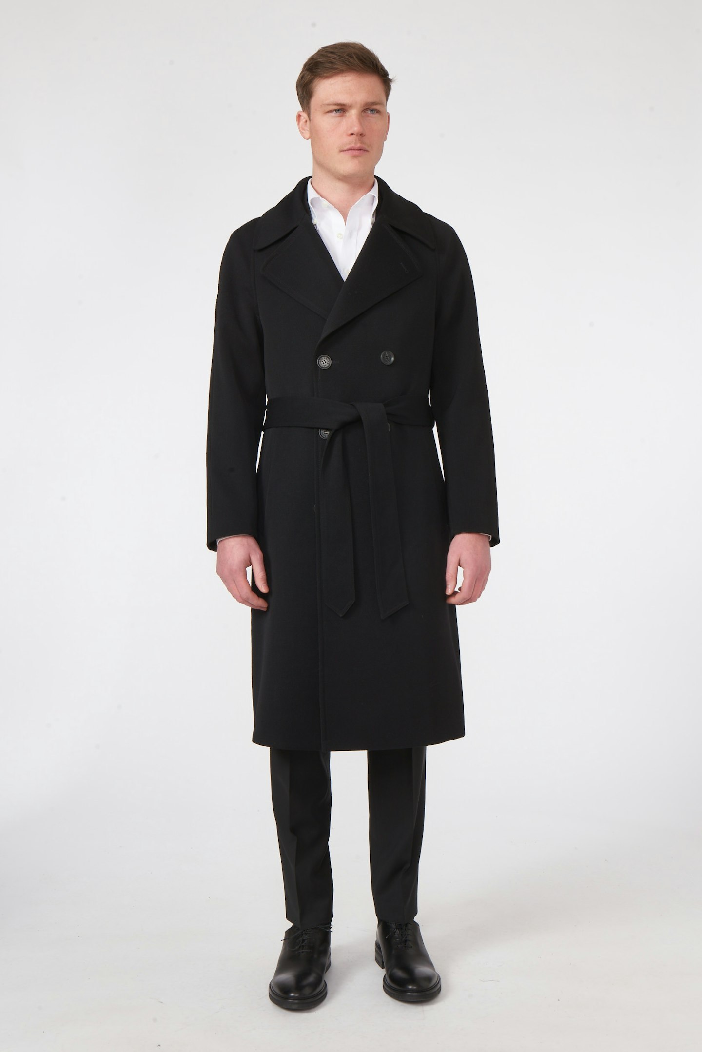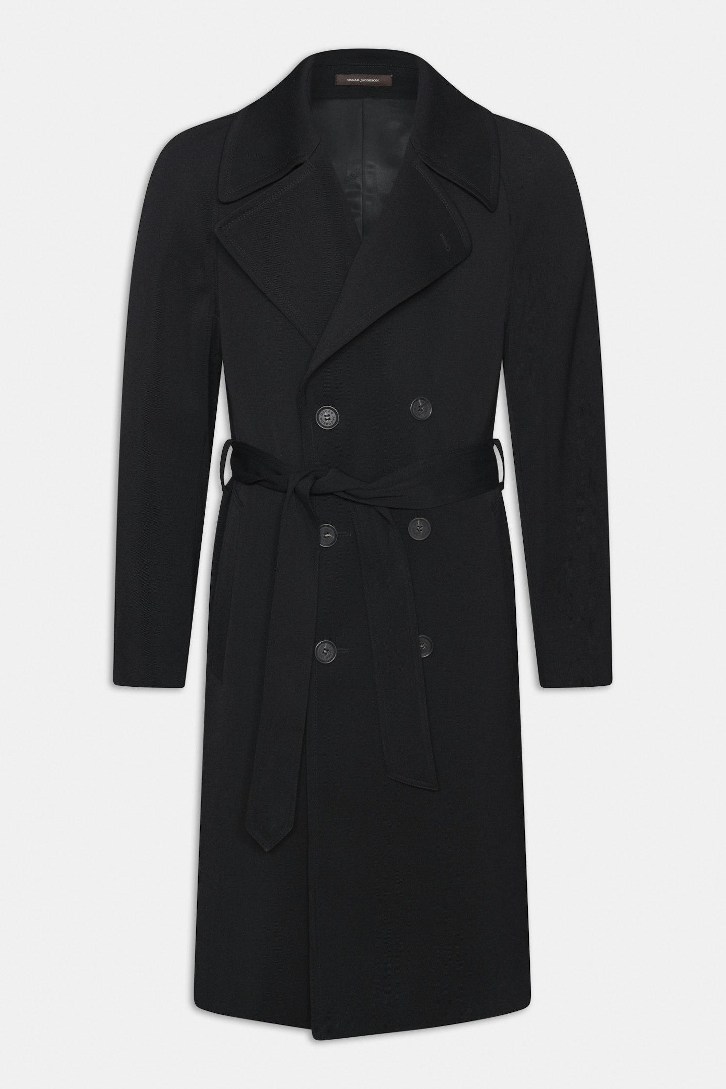 Double-brested raglancoat with increased length and belt. Here in a classic wool fabric.