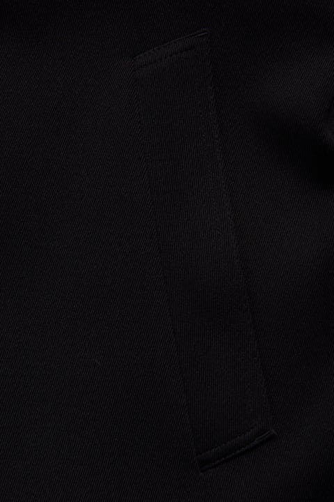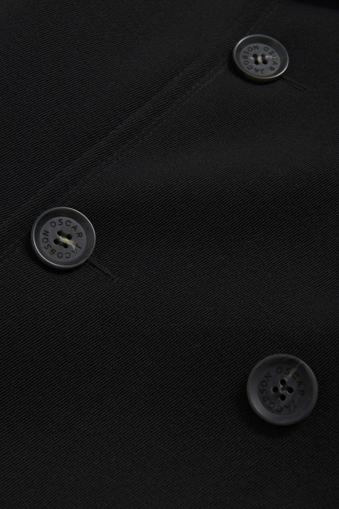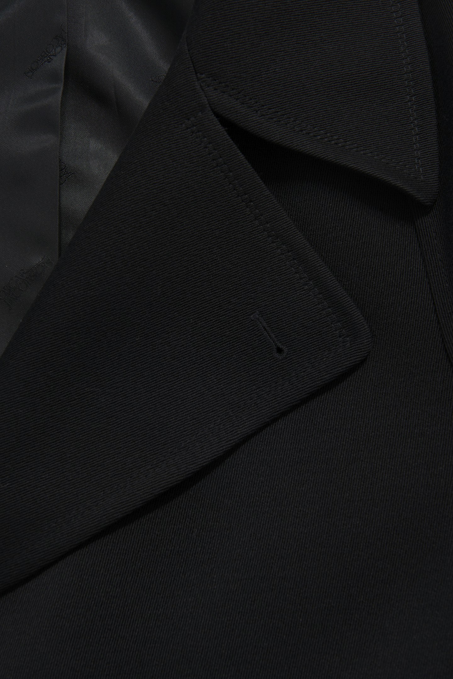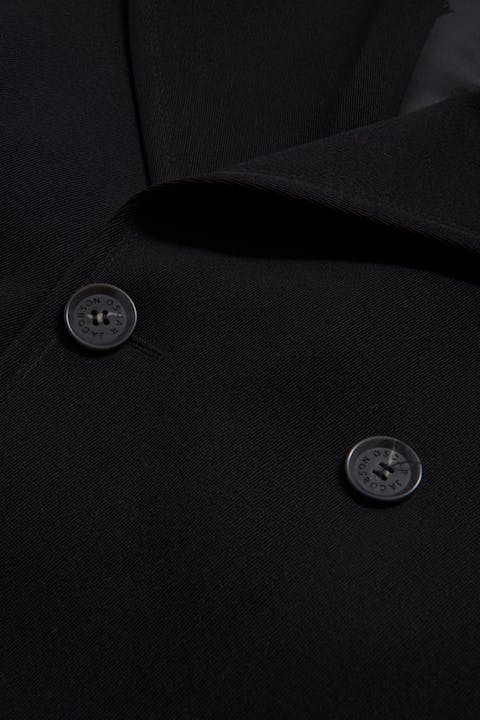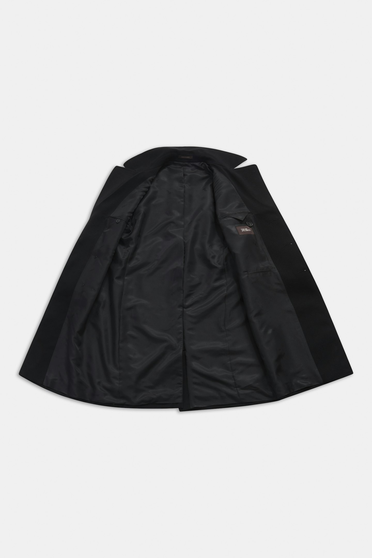 Double-brested raglancoat with increased length and belt. Here in a classic wool fabric.