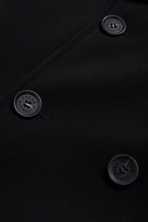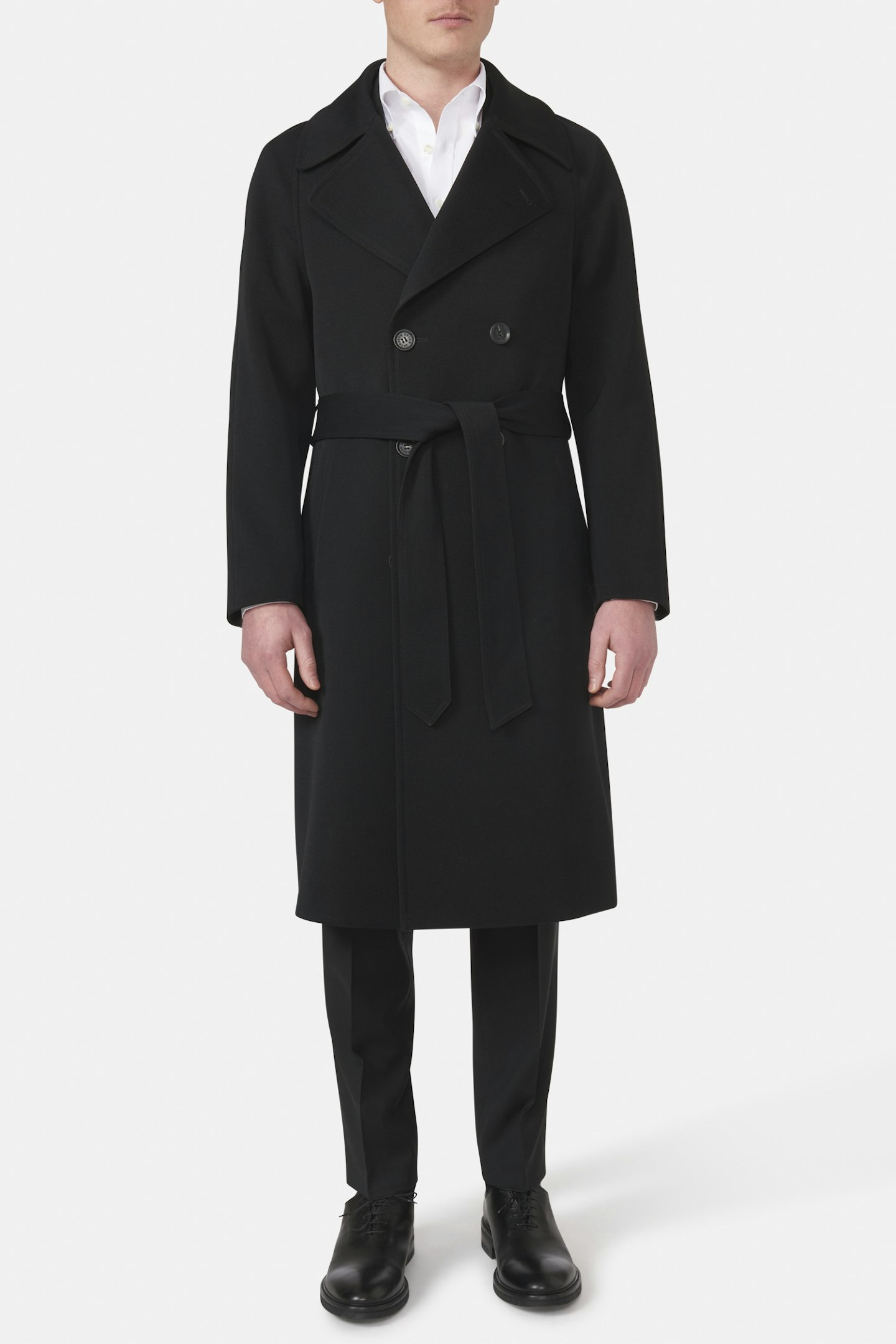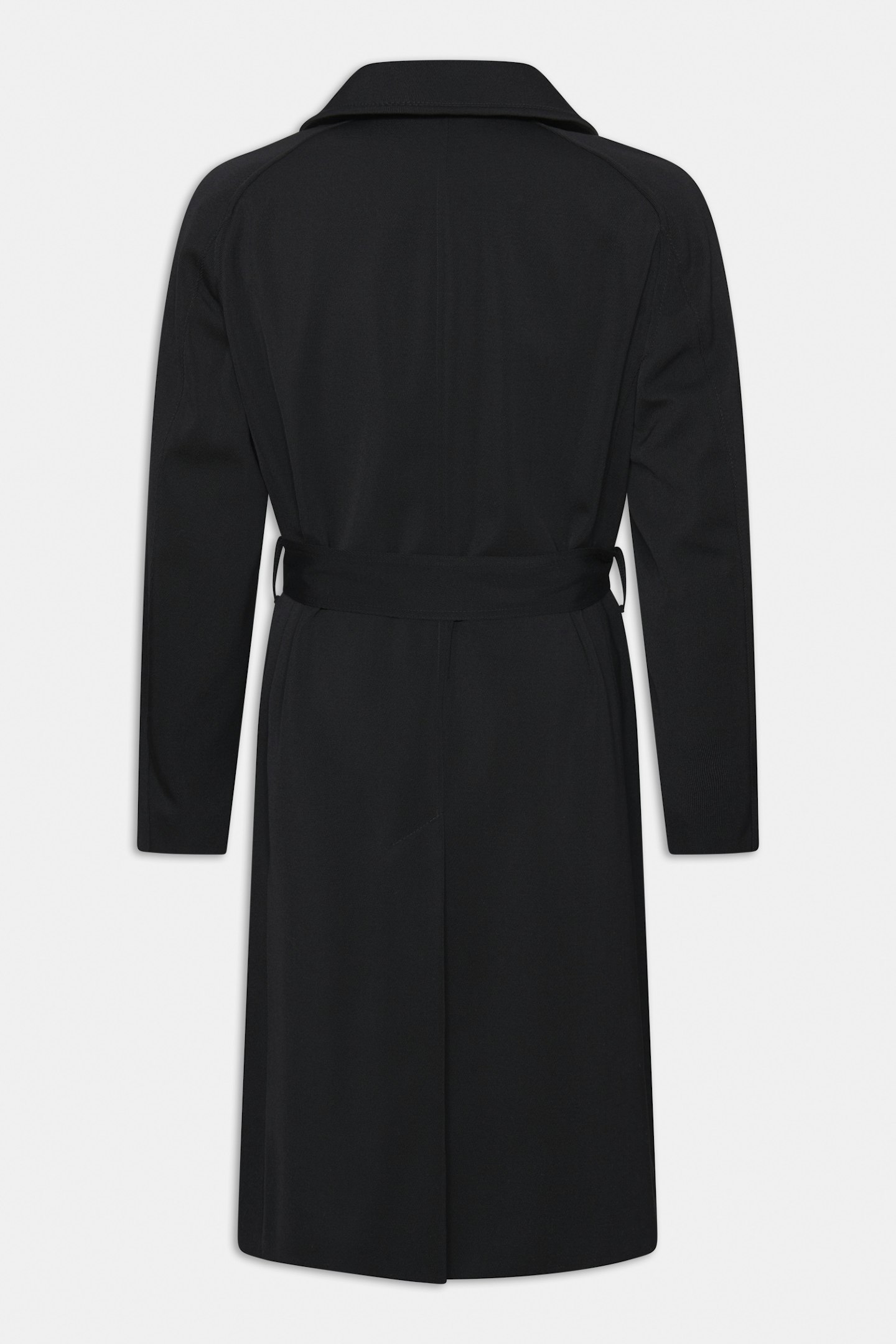 Double-brested raglancoat with increased length and belt. Here in a classic wool fabric.