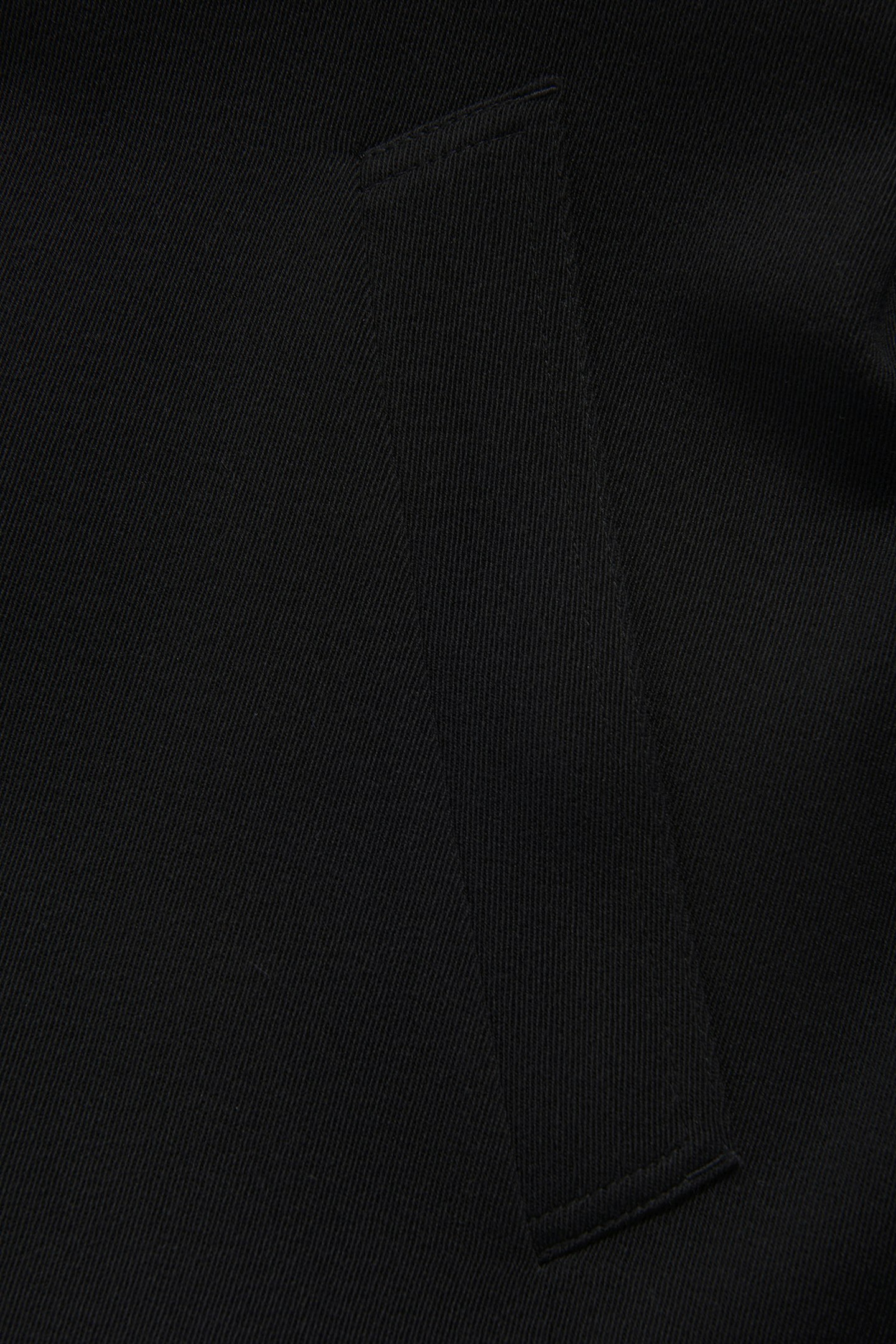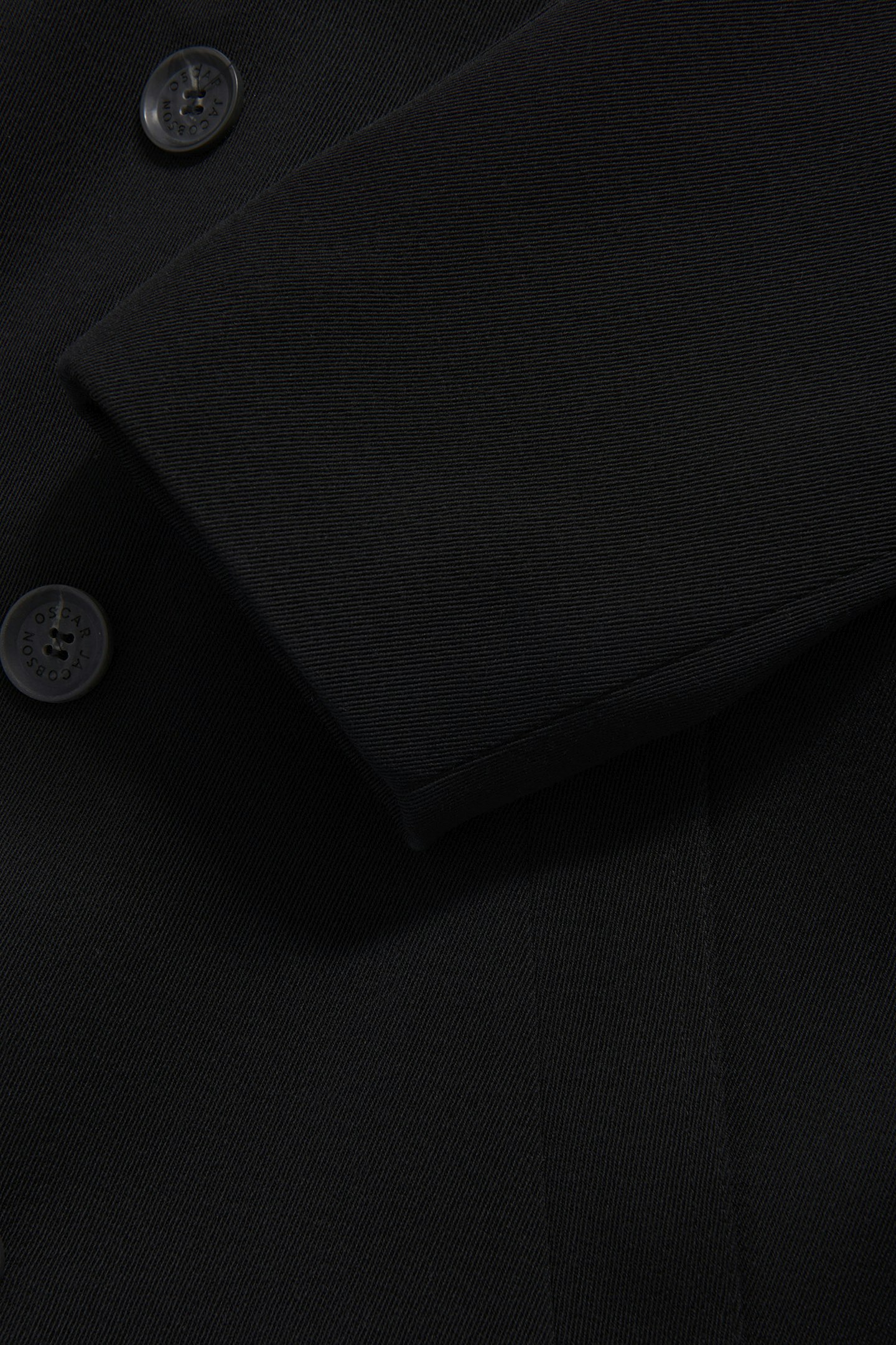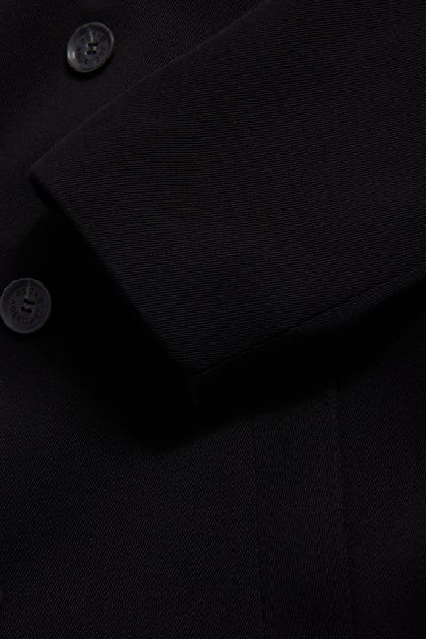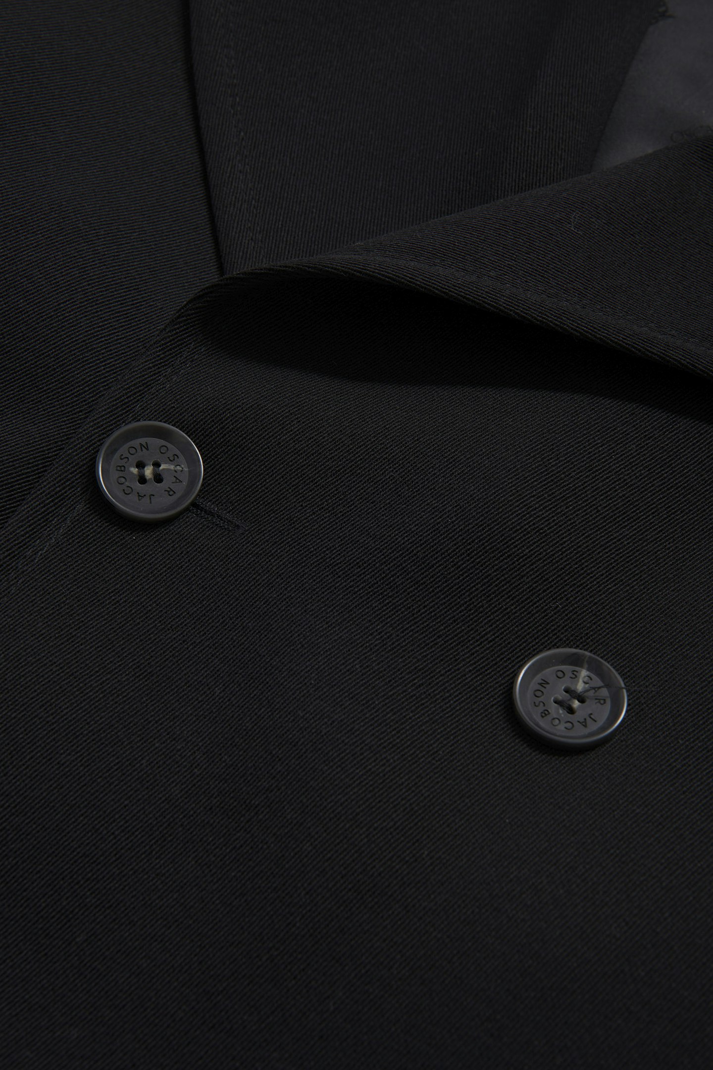 Double-brested raglancoat with increased length and belt. Here in a classic wool fabric.
