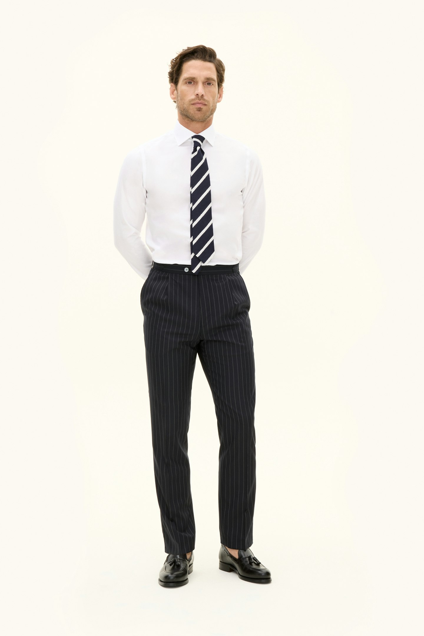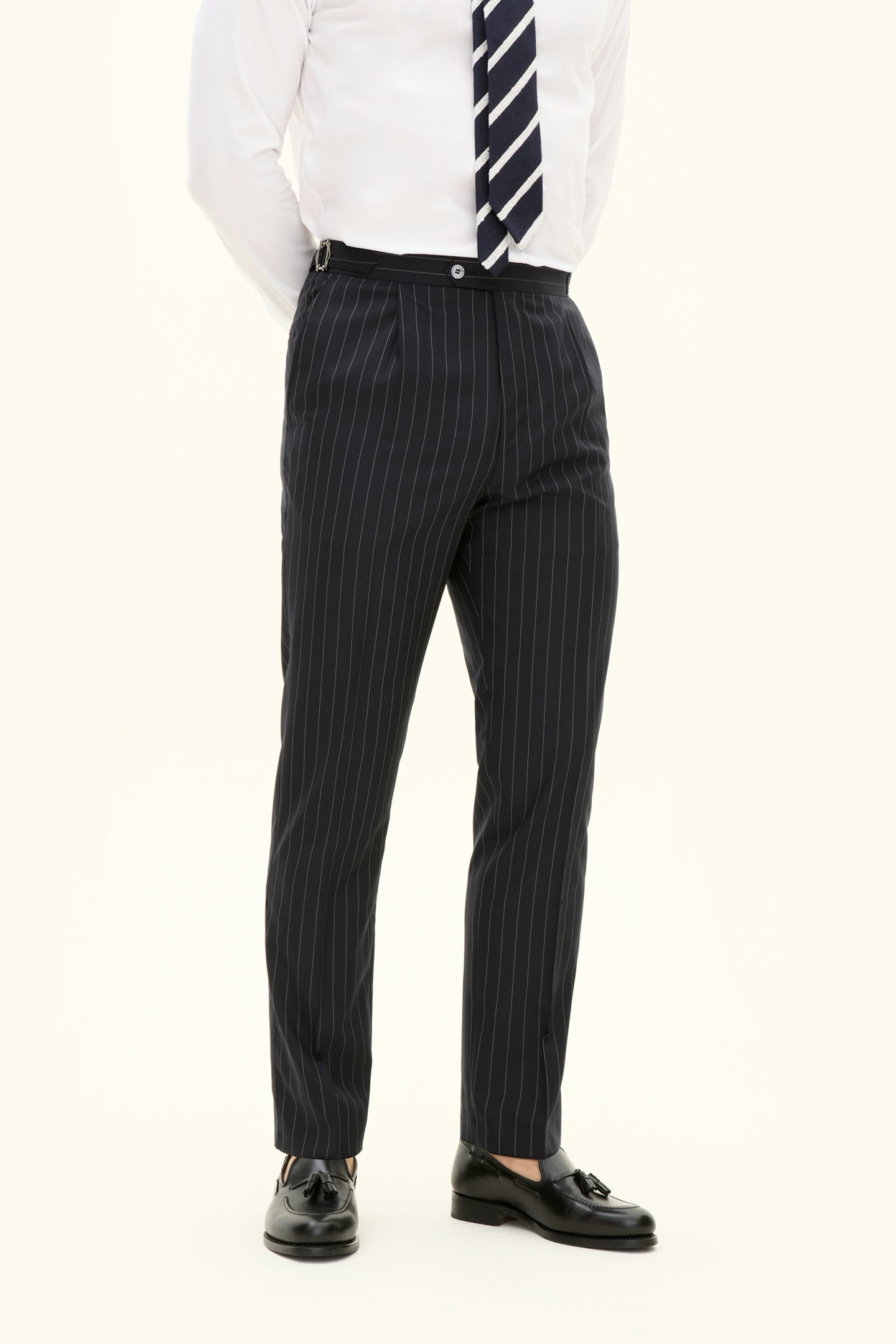 This product is made from a striped woven Super 130's wool fabric from Drago.