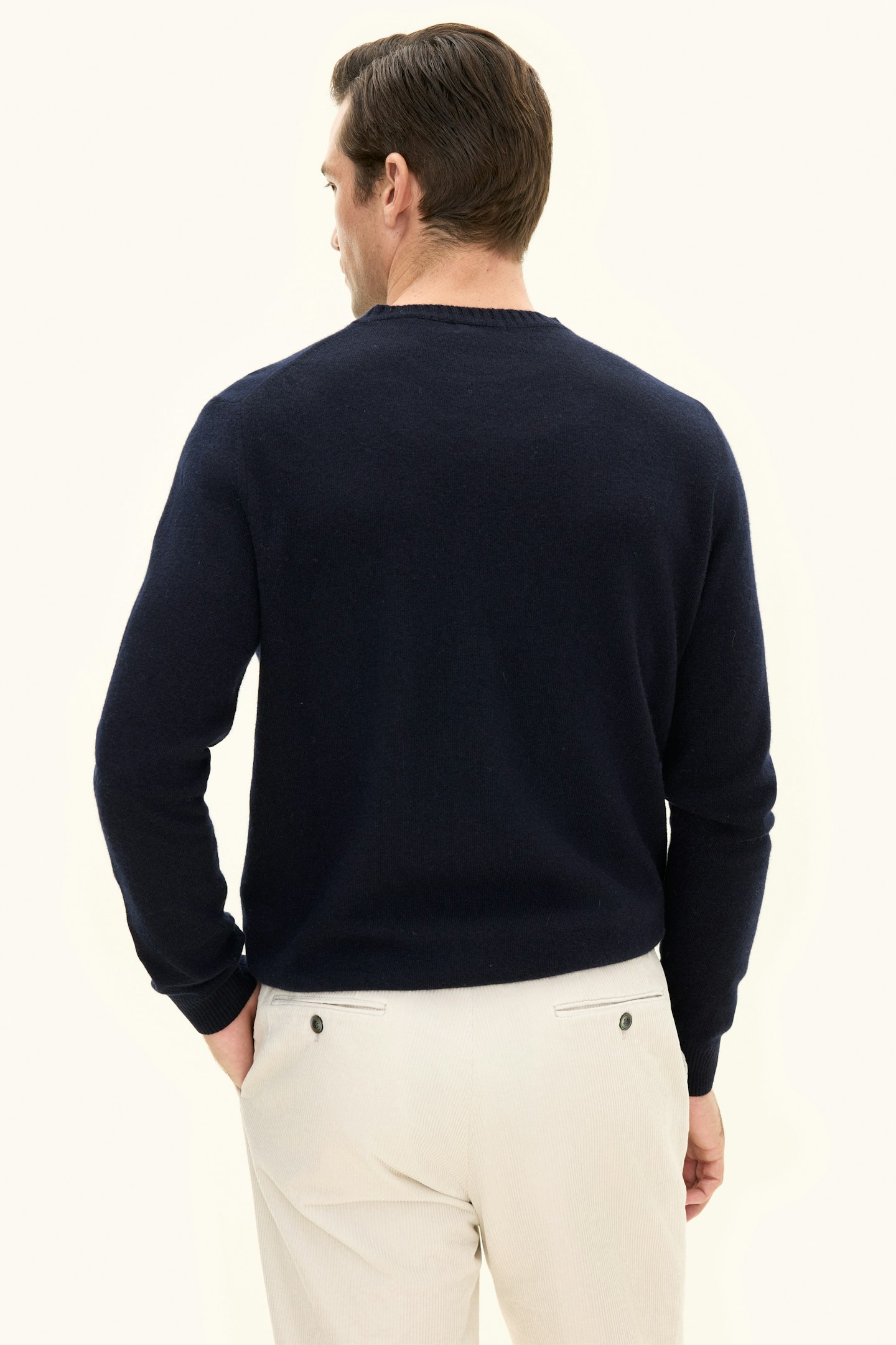 Roundneck sweater with rib knitted collar made of 12gg wool, cashmere and viscose. A true wardrobe essential base garment that can be matched with basically anything in the closet.