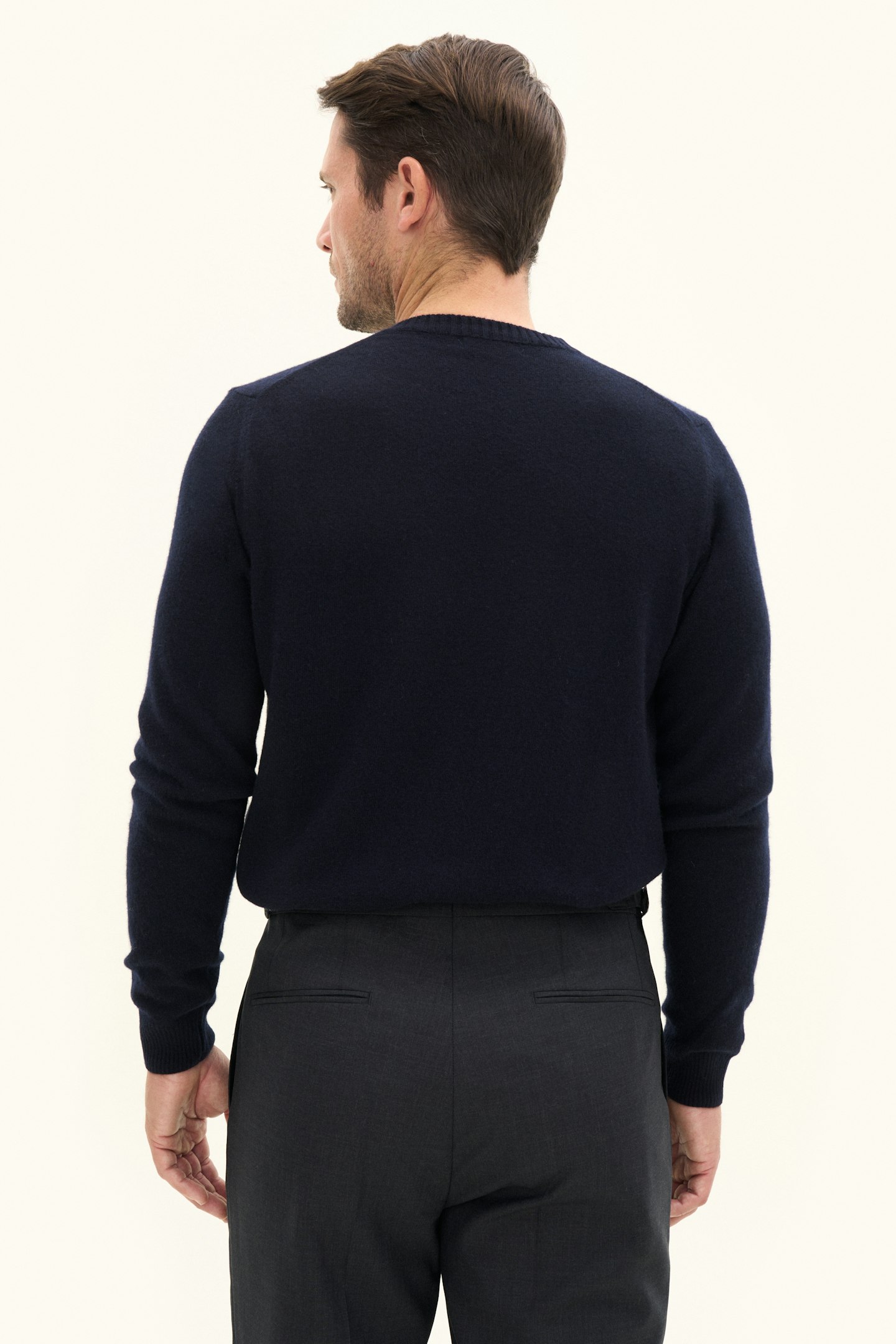 Roundneck sweater with rib knitted collar made of 12gg wool, cashmere and viscose. A true wardrobe essential base garment that can be matched with basically anything in the closet.
