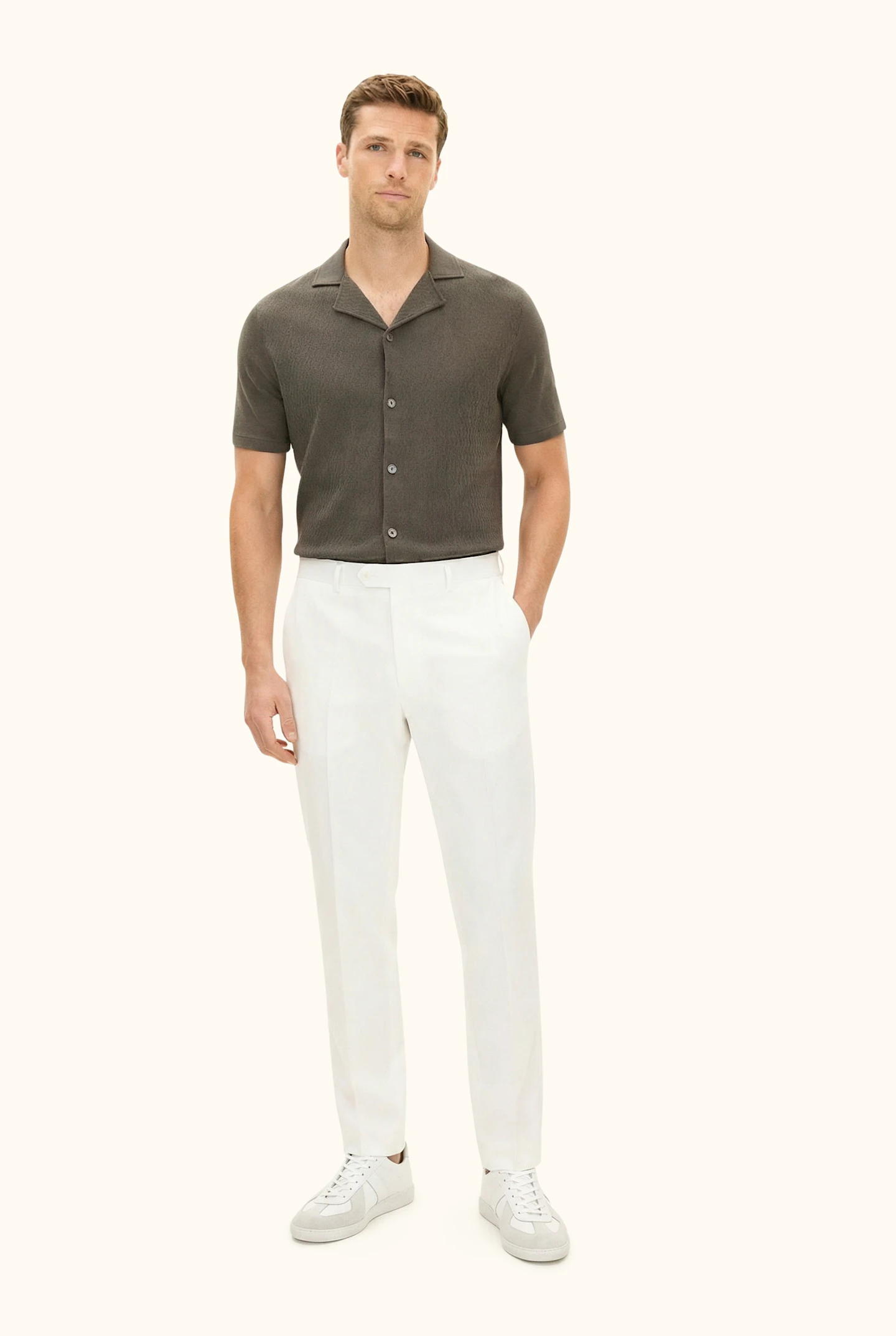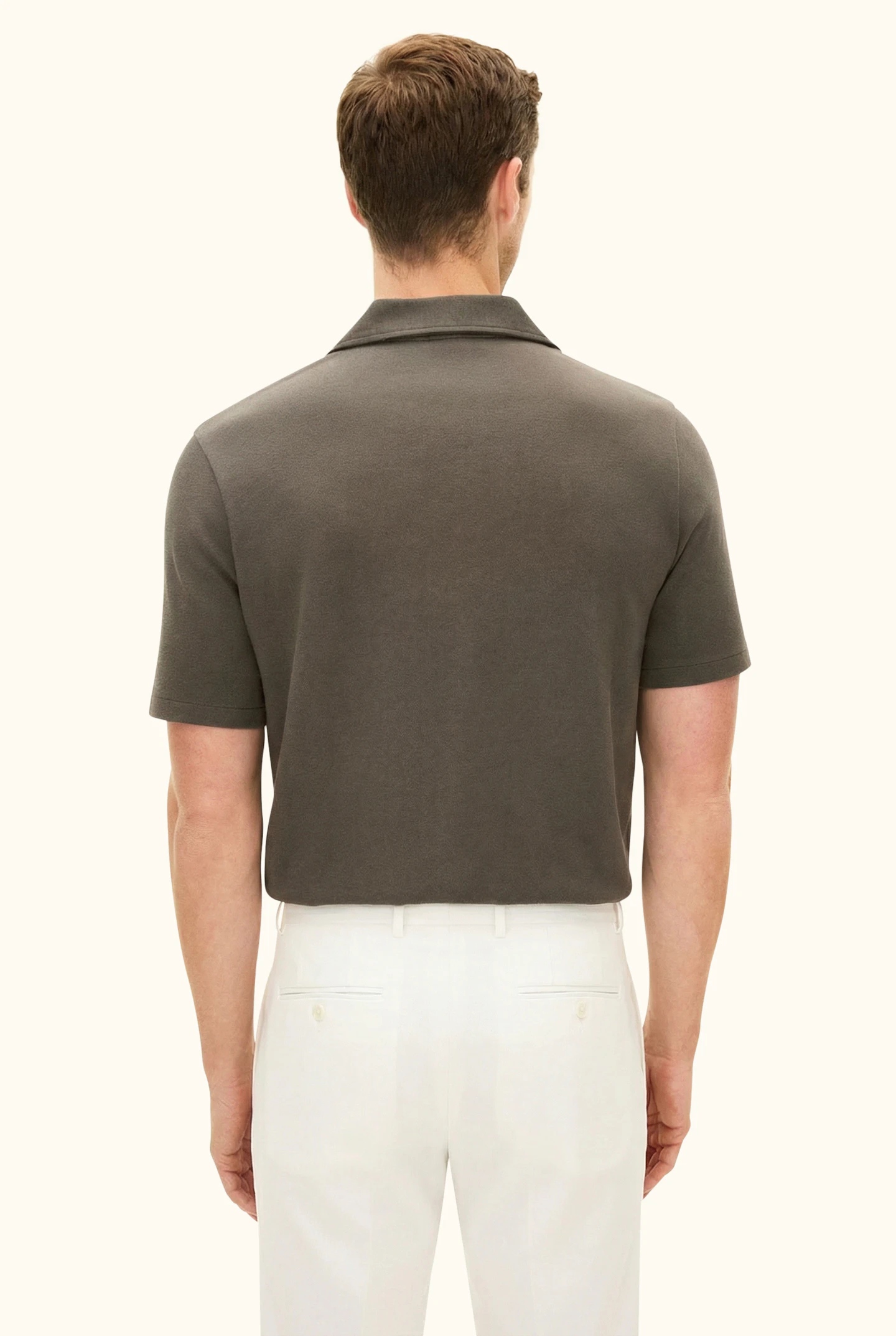 This short-sleeved cotton knit shirt is crafted from cotton jersey with an elegant structure at the front and features mother-of-pearl buttons that add a sophisticated detail. A comfortable and airy piece, perfect for warm summer days.