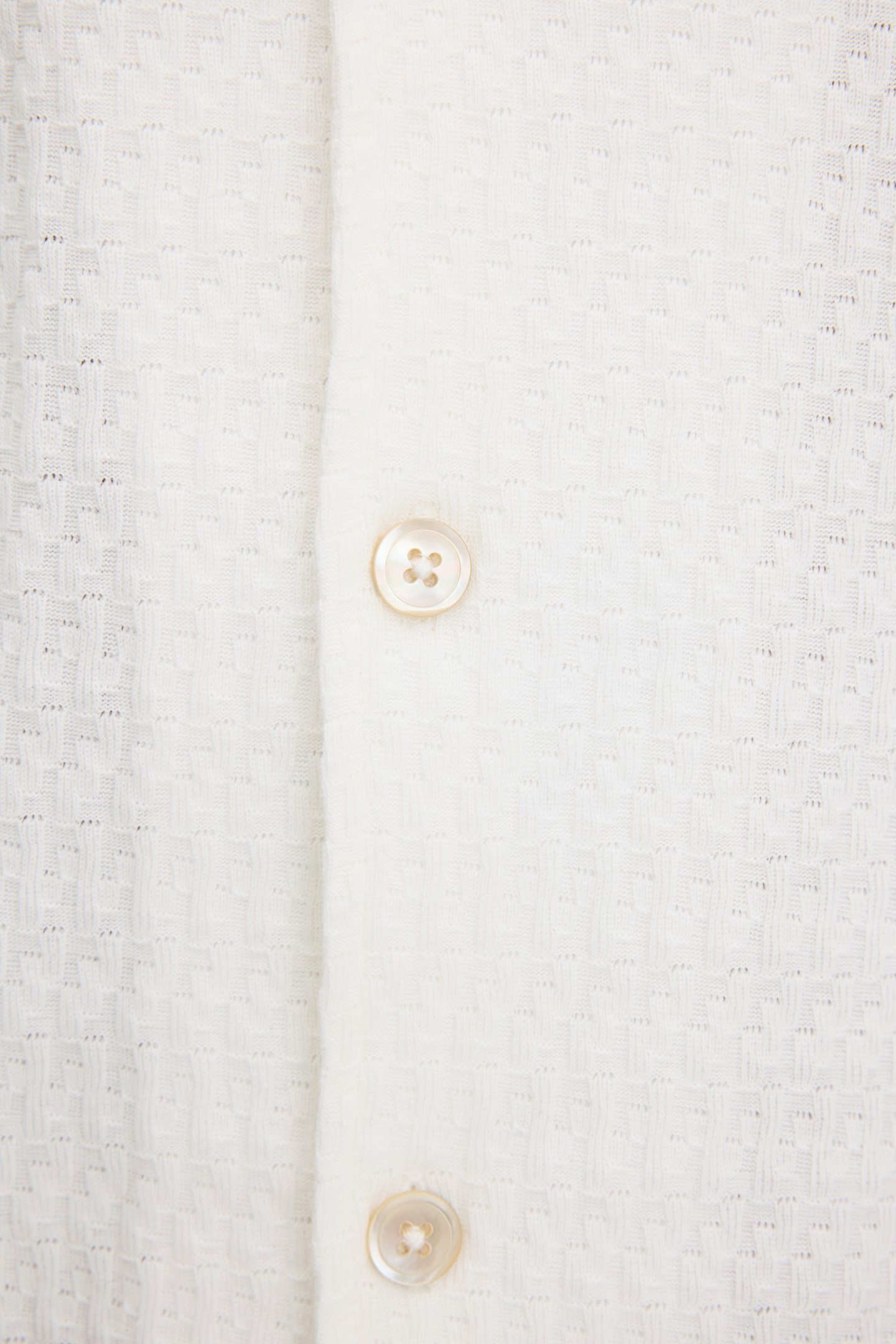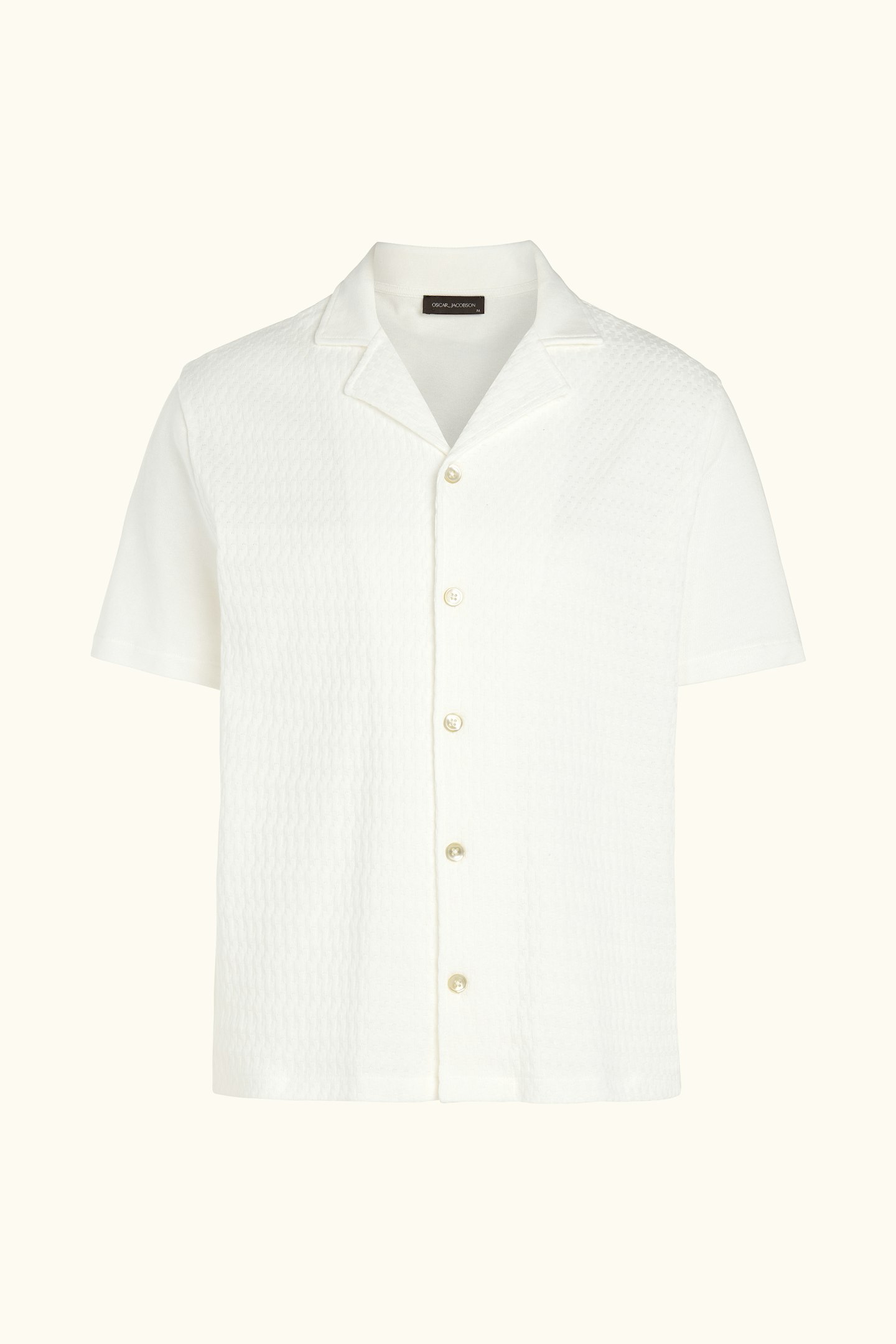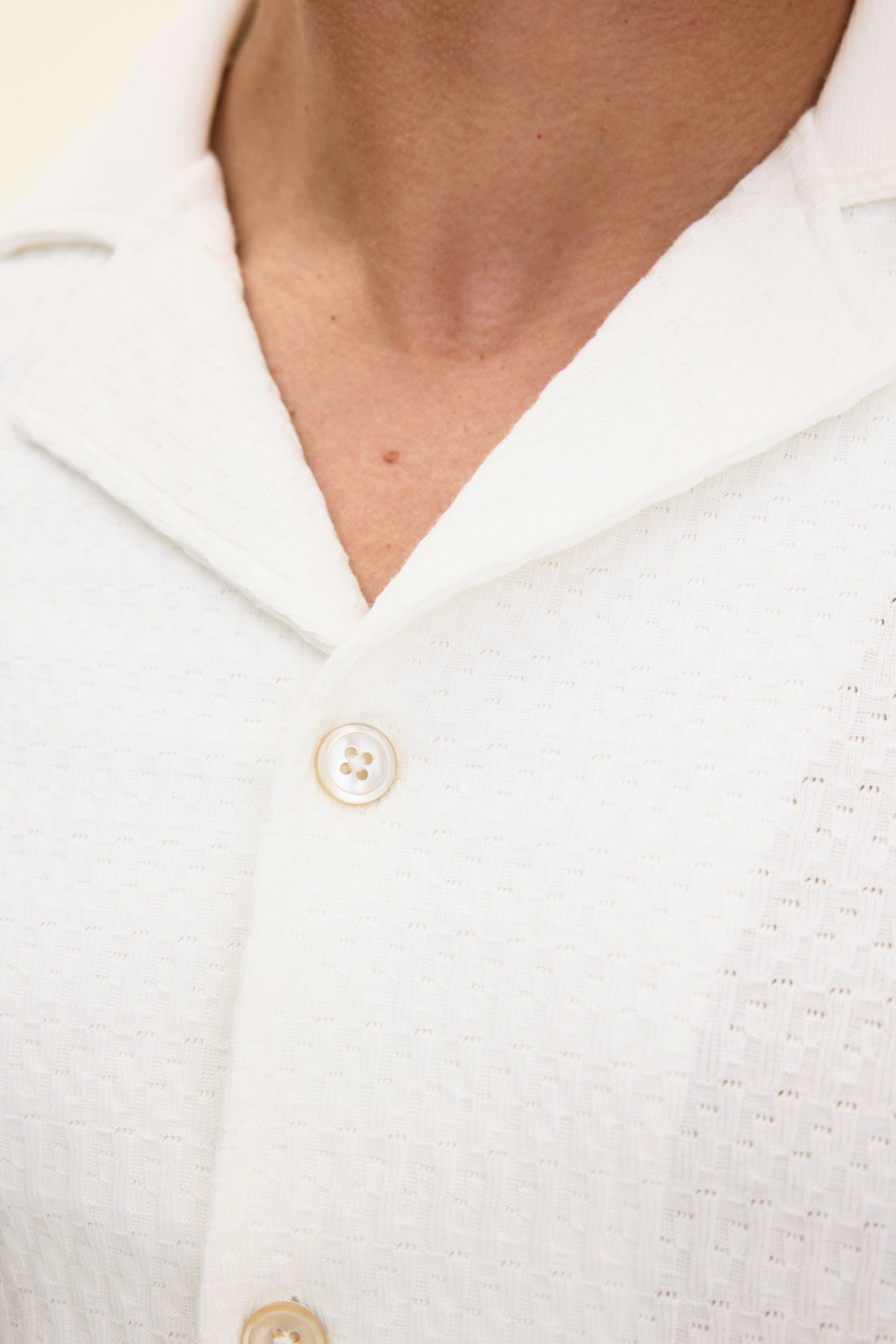 This short-sleeved cotton knit shirt is crafted from cotton jersey with an elegant structure at the front and features mother-of-pearl buttons that add a sophisticated detail. A comfortable and airy piece, perfect for warm summer days.