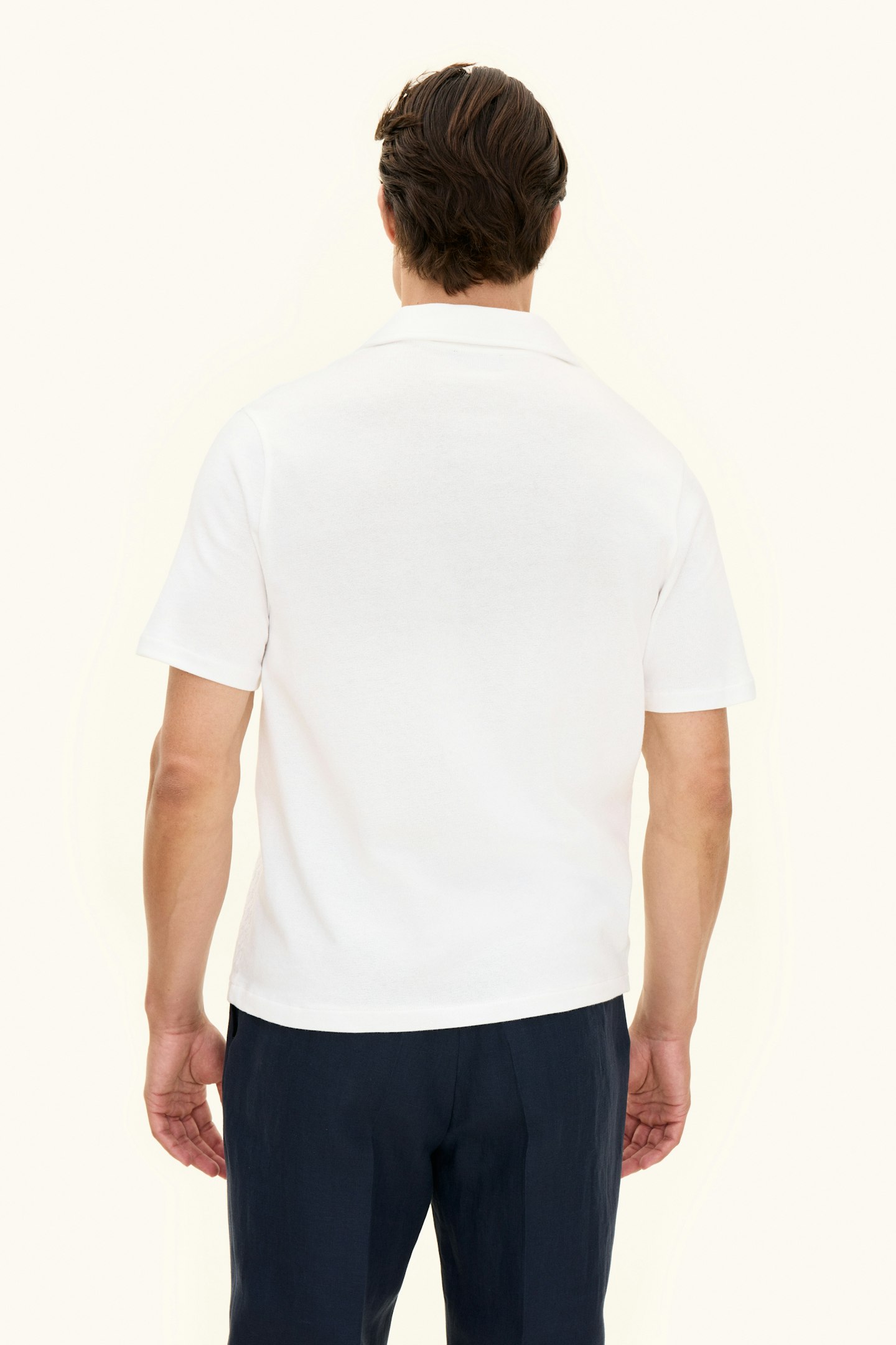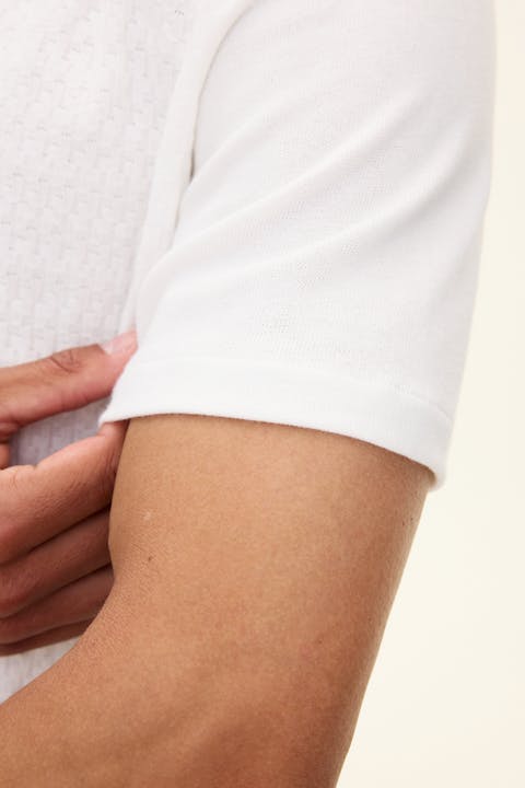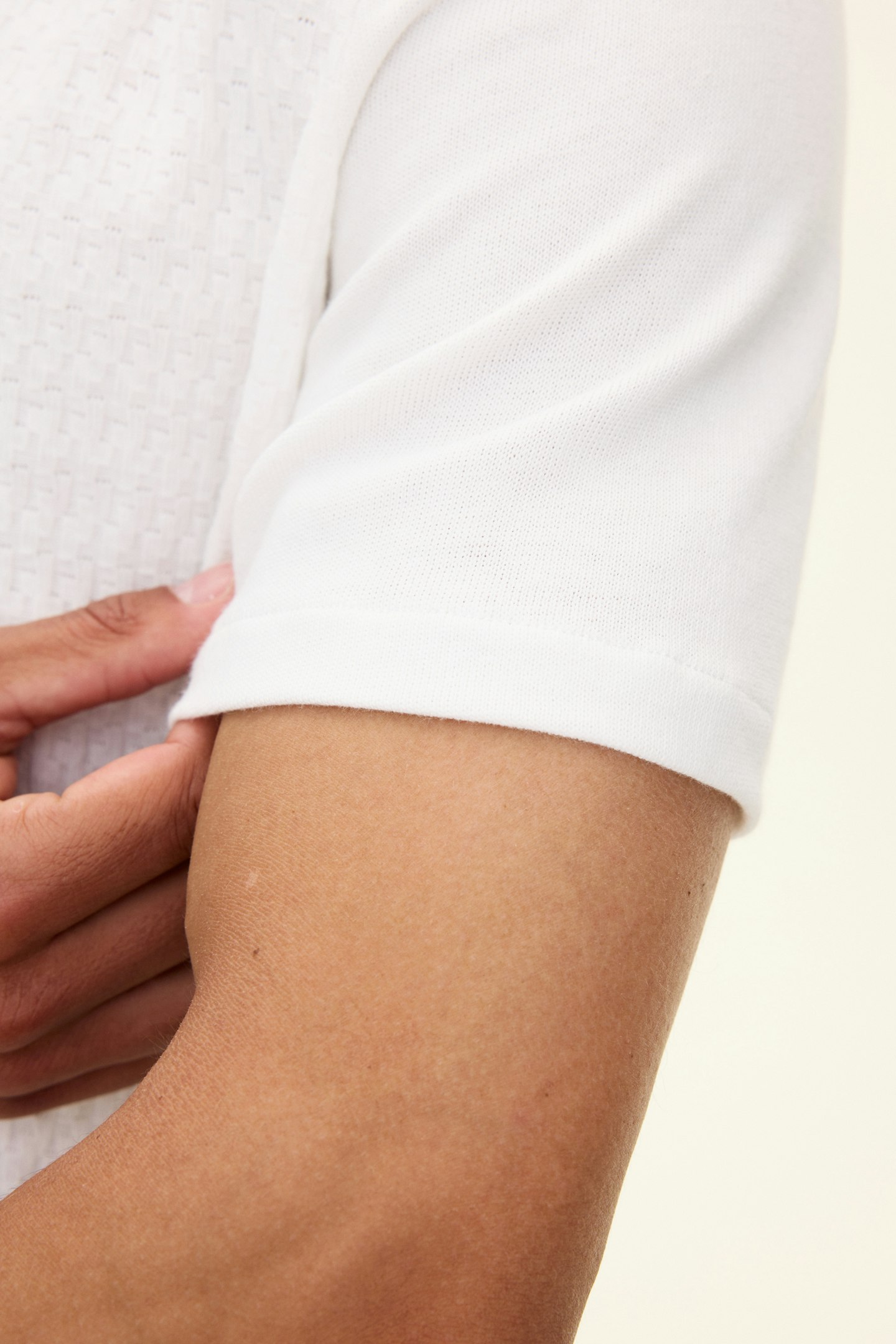 This short-sleeved cotton knit shirt is crafted from cotton jersey with an elegant structure at the front and features mother-of-pearl buttons that add a sophisticated detail. A comfortable and airy piece, perfect for warm summer days.