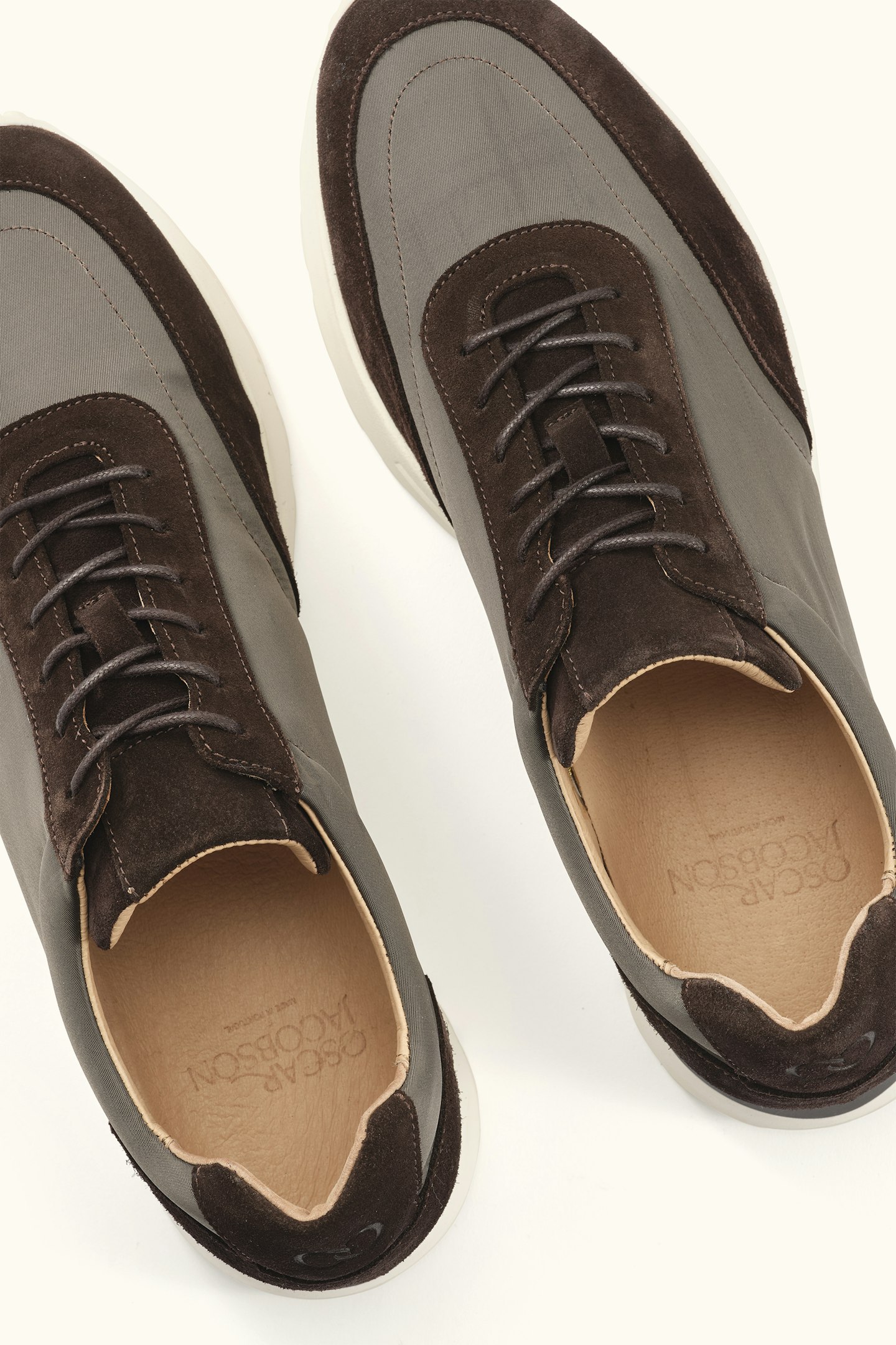 Our runner sneaker is a stylish and comfortable everyday shoe, perfect for pairing with jeans, chinos, or suit trousers. The upper is made from recycled nylon from Mipe Textiles with detailing in portuguese suede. The sole provides soft cushioning, while the outsole is made from durable rubber for long-lasting wear.