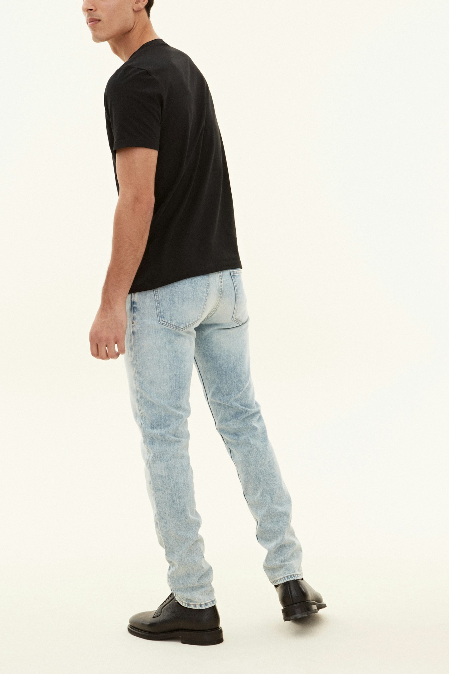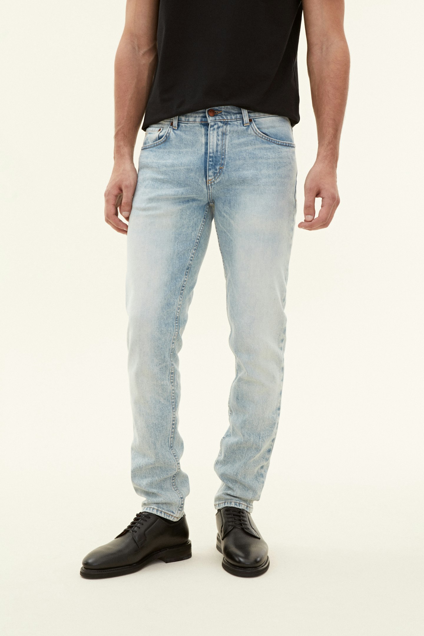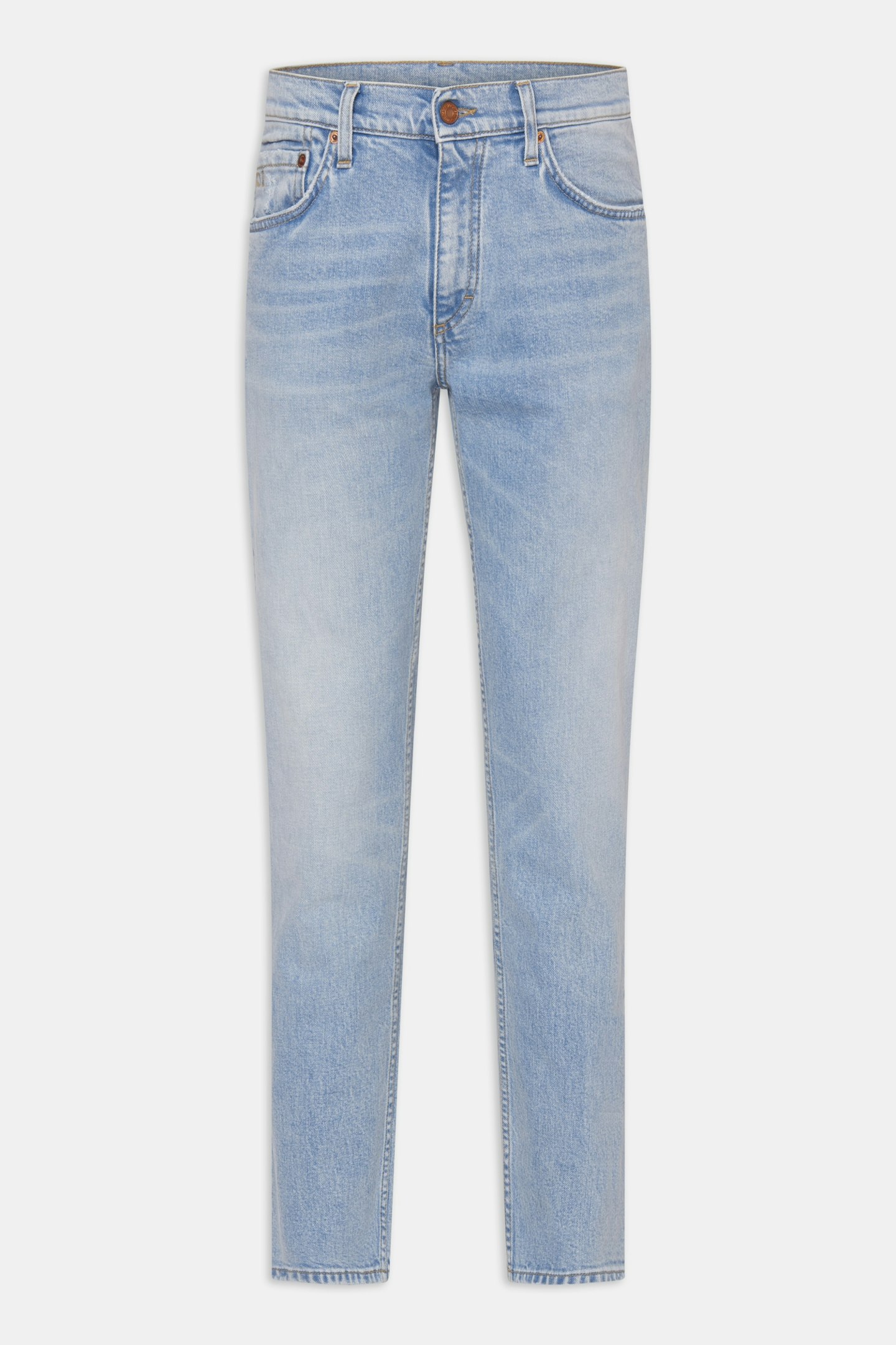Slim fit denim trouser with straight leg, the waist has a normal to low height. Made of stretch denim from Candiani in Italy, which is woven on old, used looms from Levis with buttons and rivets from Italy and Borås.