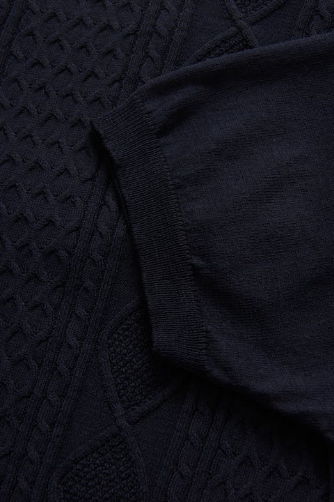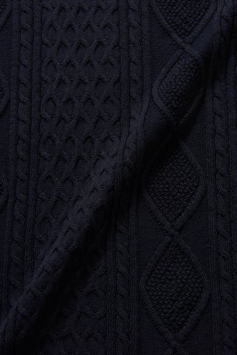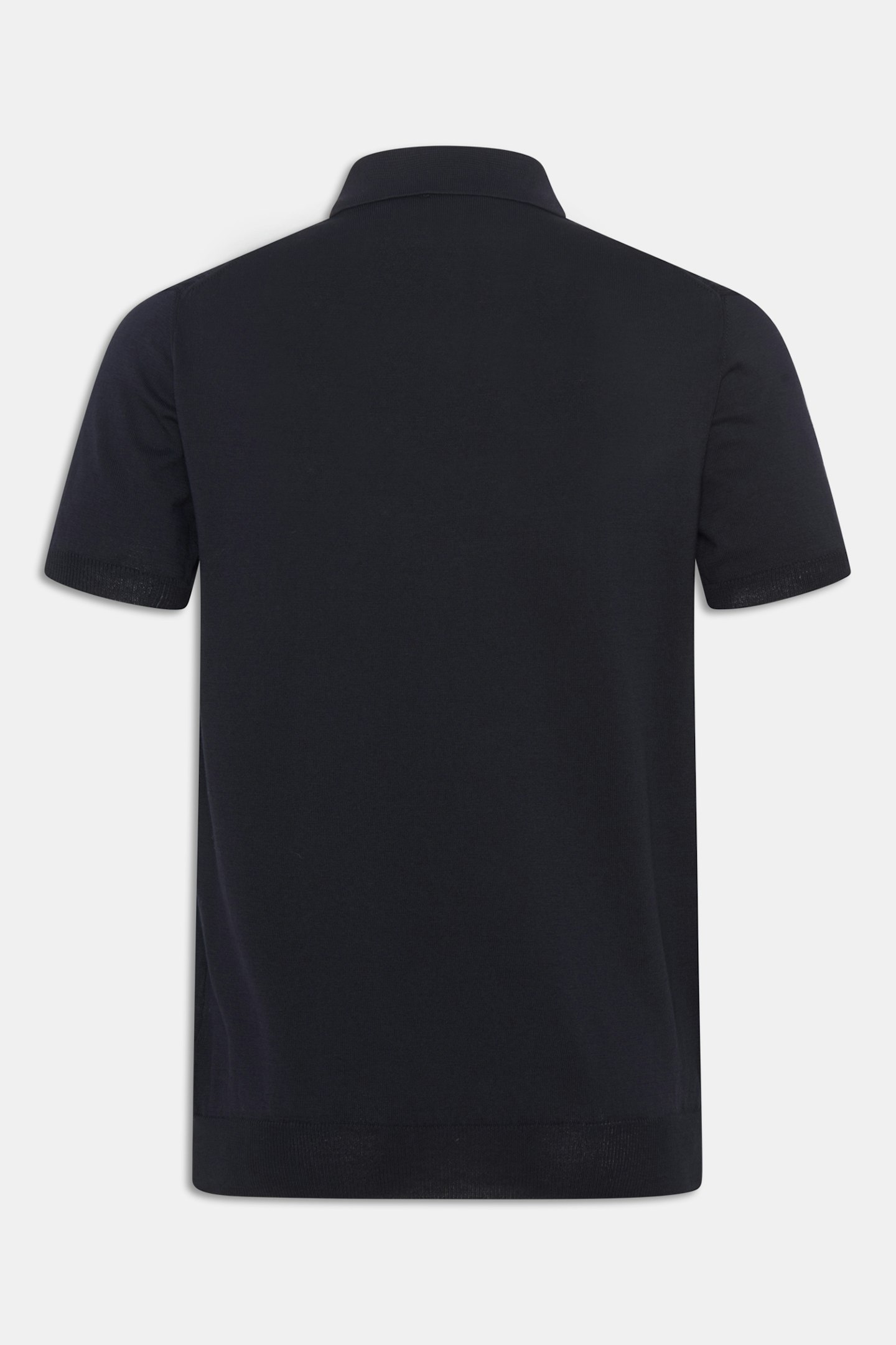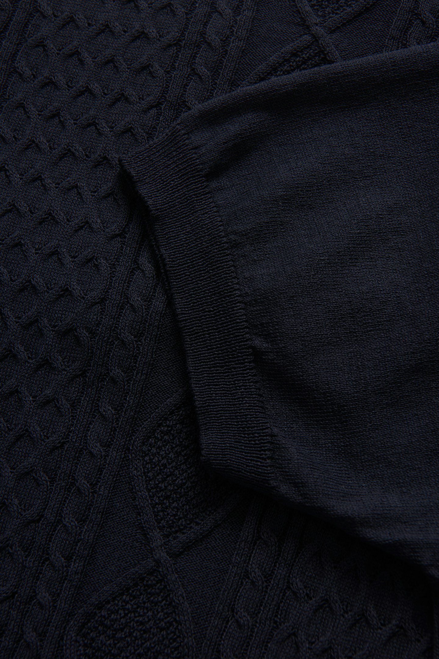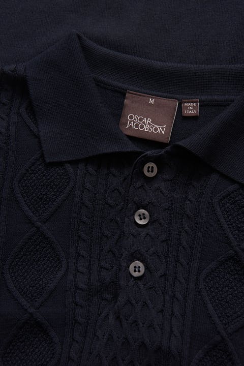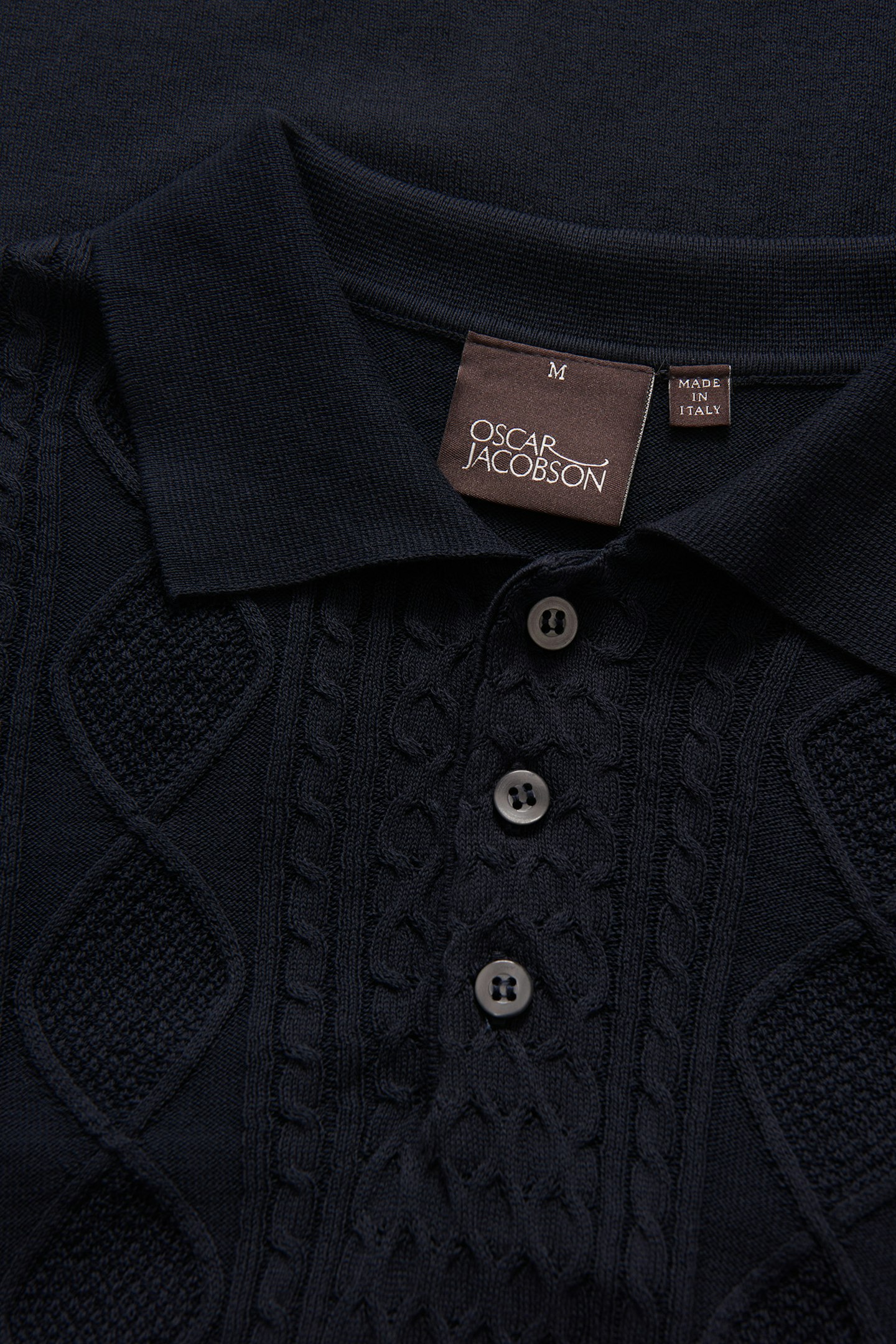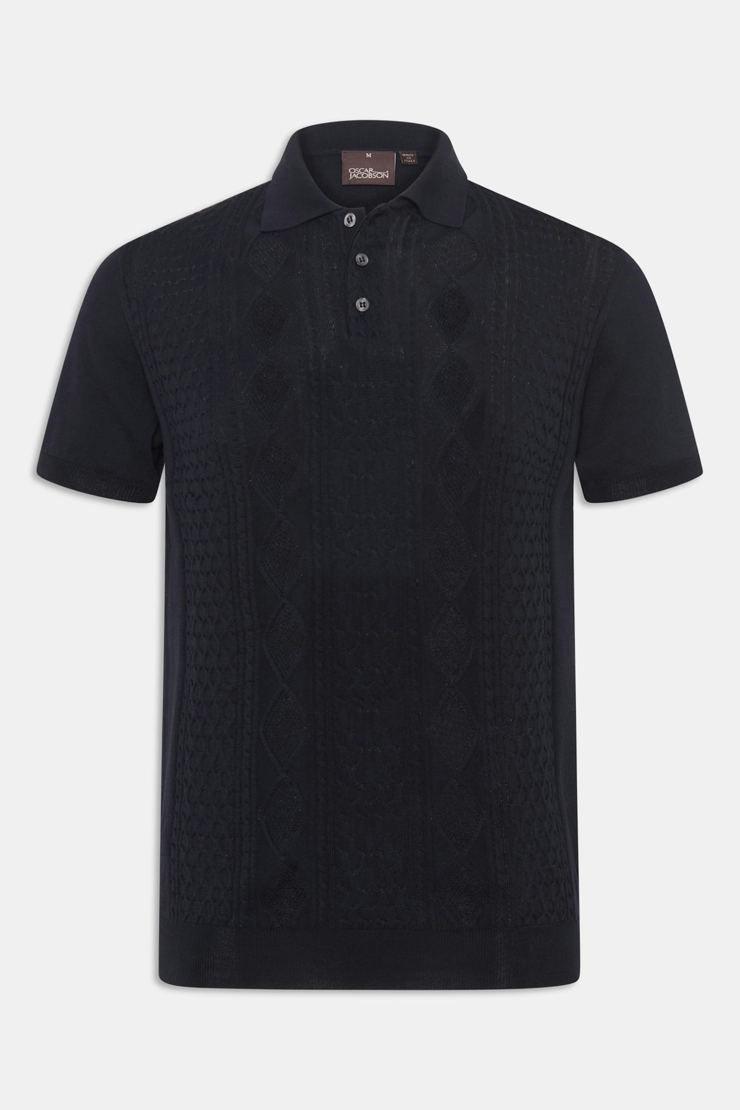 Short sleeved polo shirt with cable knitting and a three-button collar. Made in a thin cotton fabric.