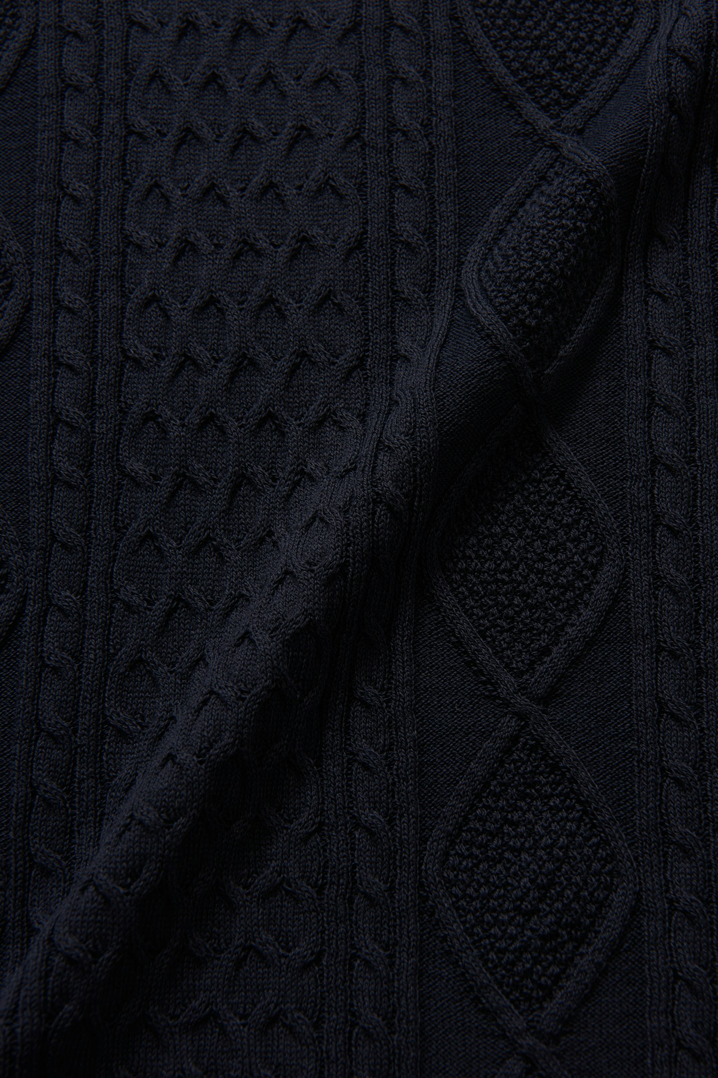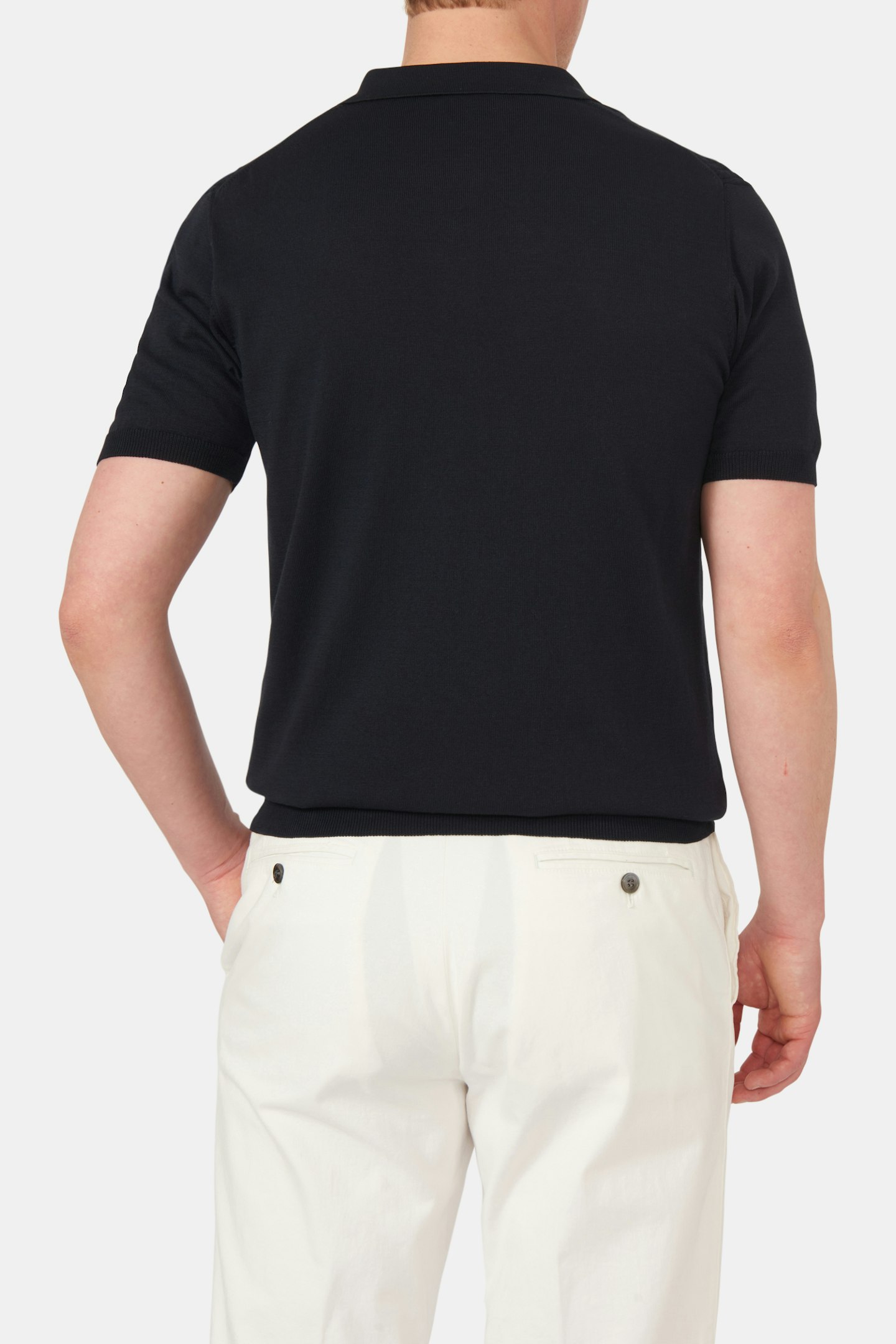 Short sleeved polo shirt with cable knitting and a three-button collar. Made in a thin cotton fabric.