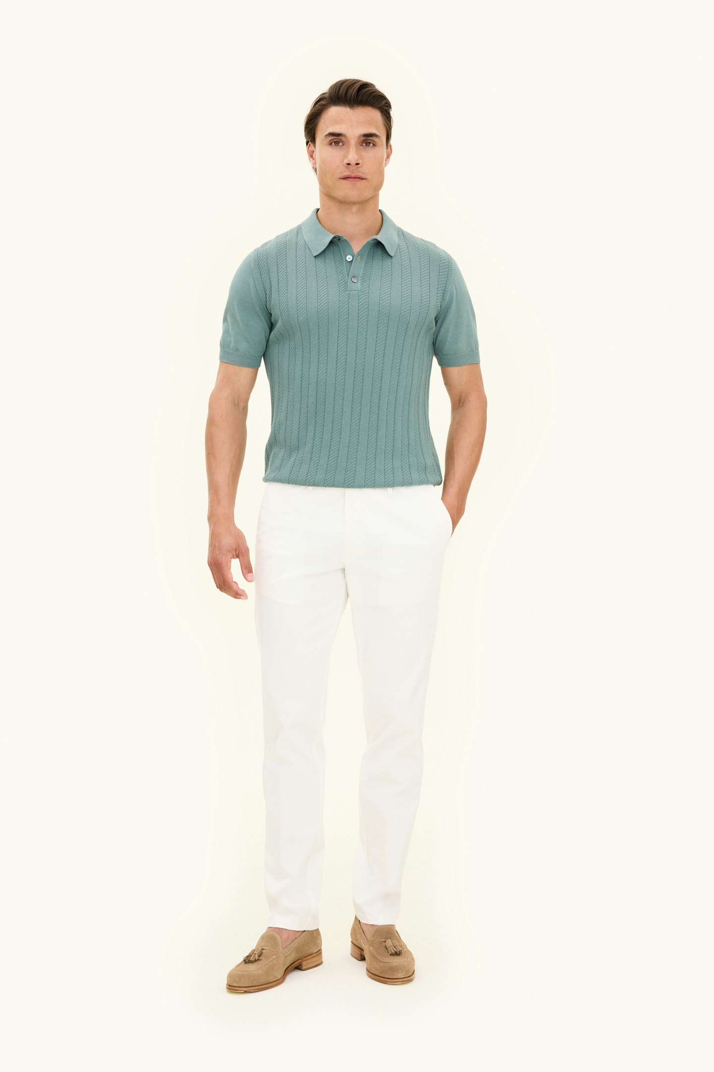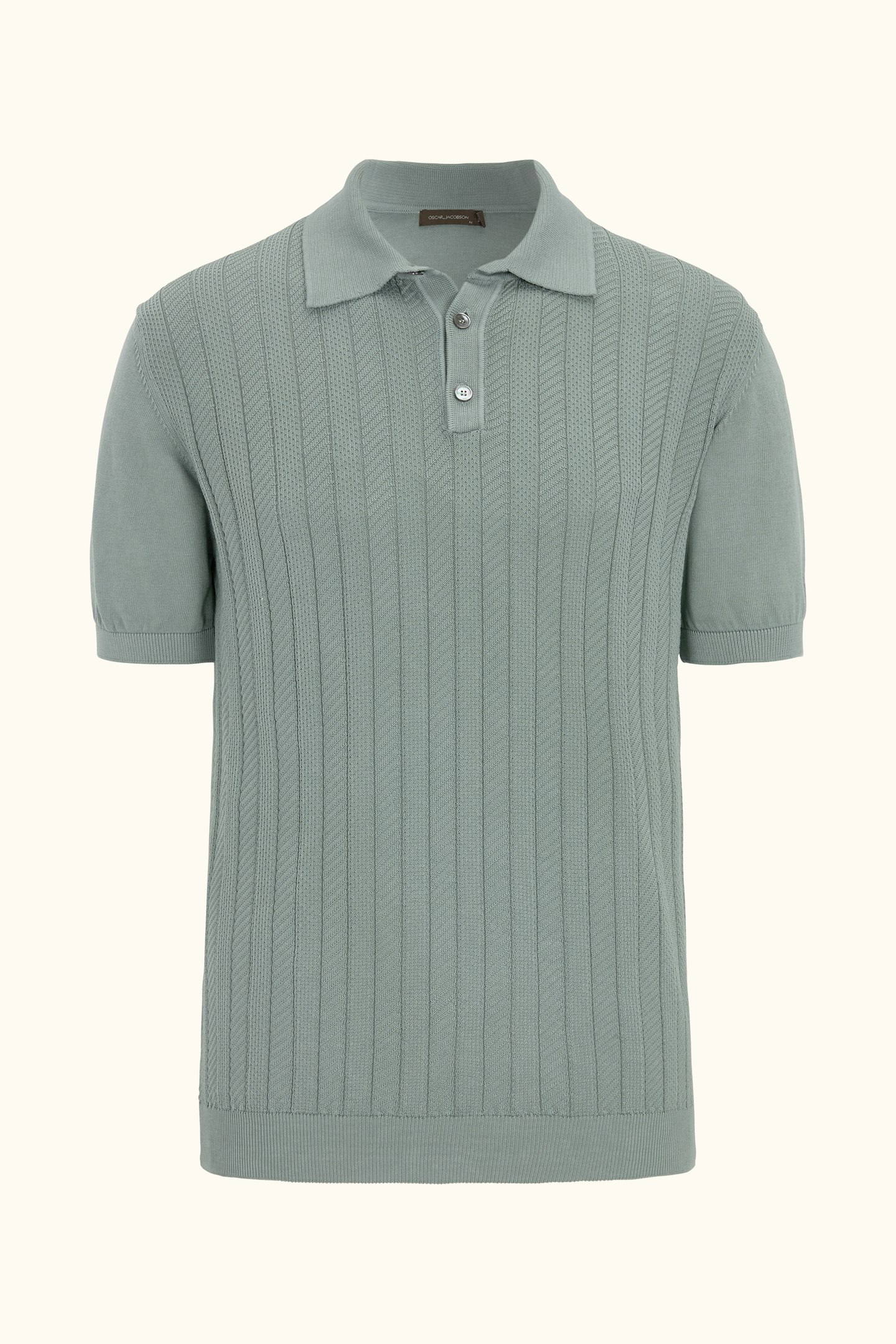 Short-sleeved collar knit in cotton with an elegant structure at the front, knitted in 12gg. The jumper has a moulded collar and is decorated with three mother-of-pearl buttons at the front. A stylish garment that works just as well on its own as under a blazer.