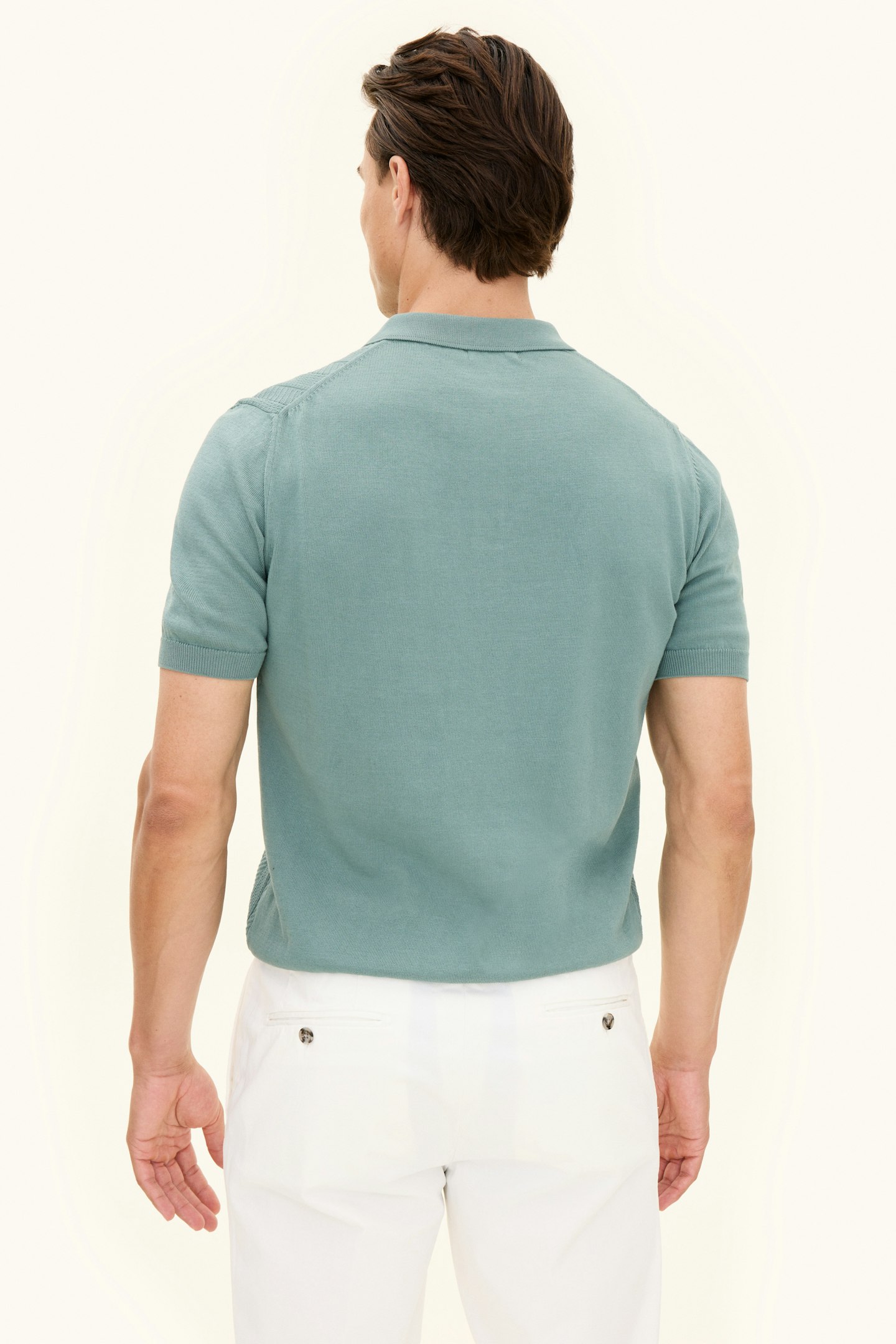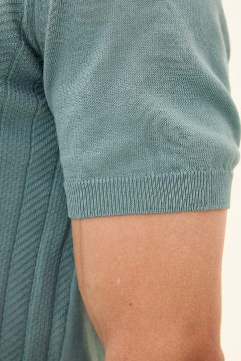 Short-sleeved collar knit in cotton with an elegant structure at the front, knitted in 12gg. The jumper has a moulded collar and is decorated with three mother-of-pearl buttons at the front. A stylish garment that works just as well on its own as under a blazer.