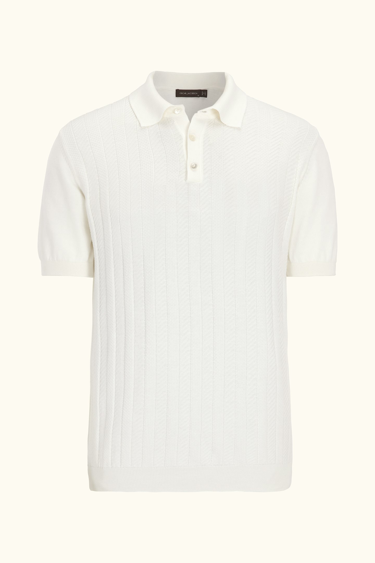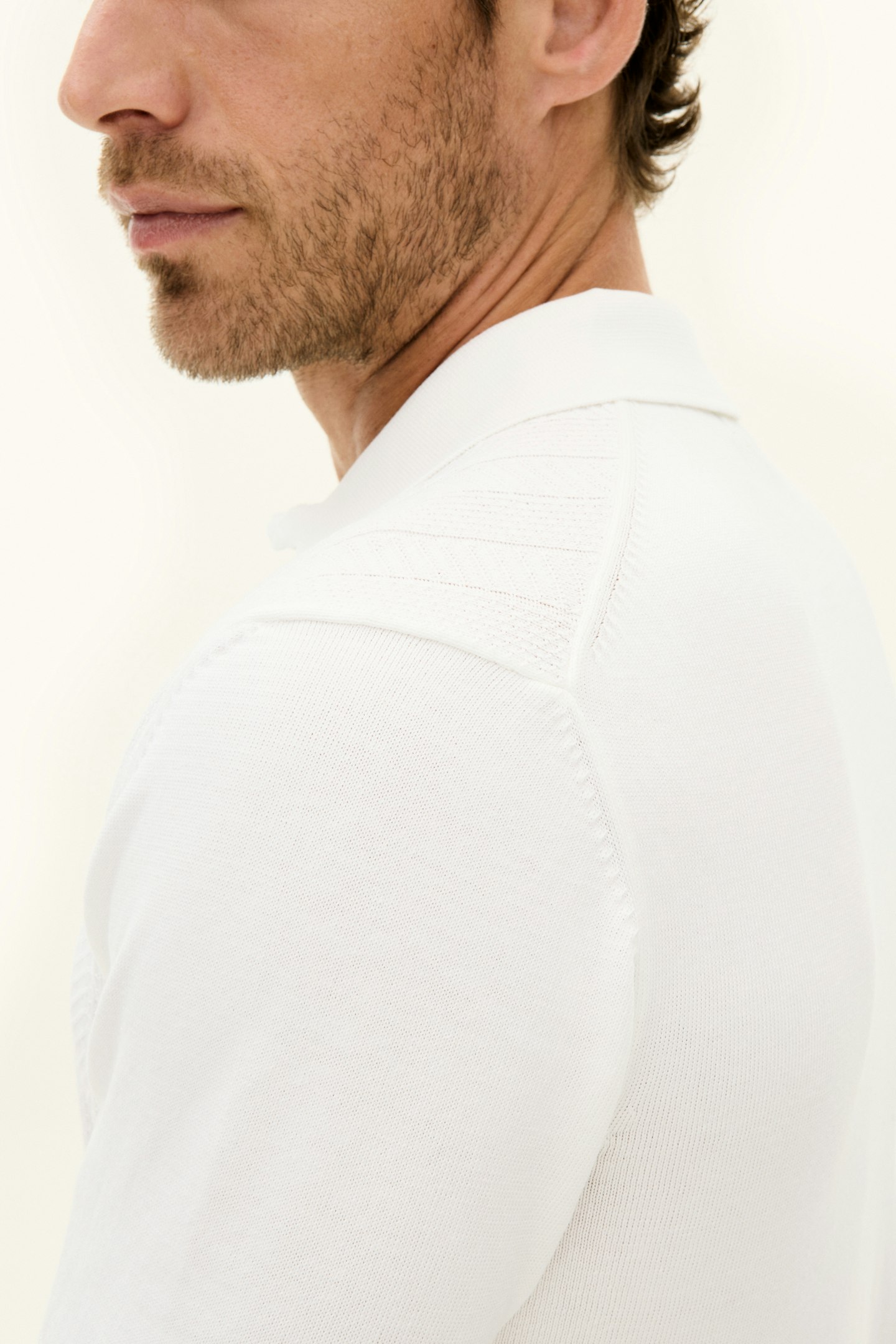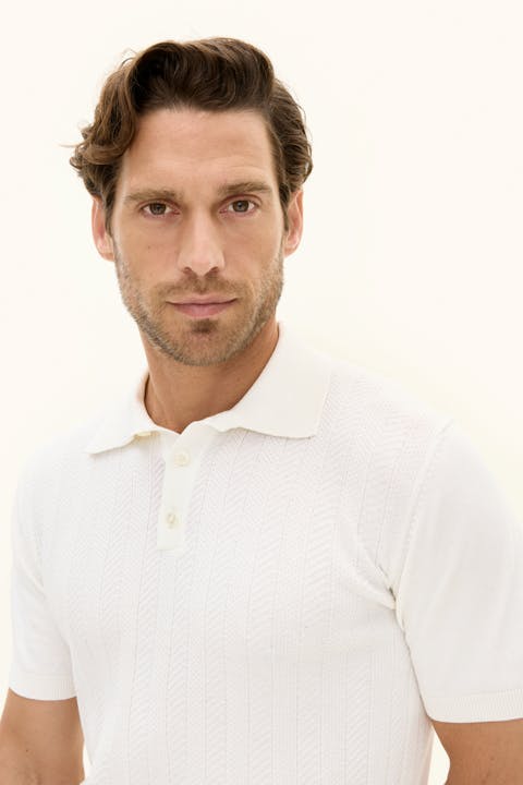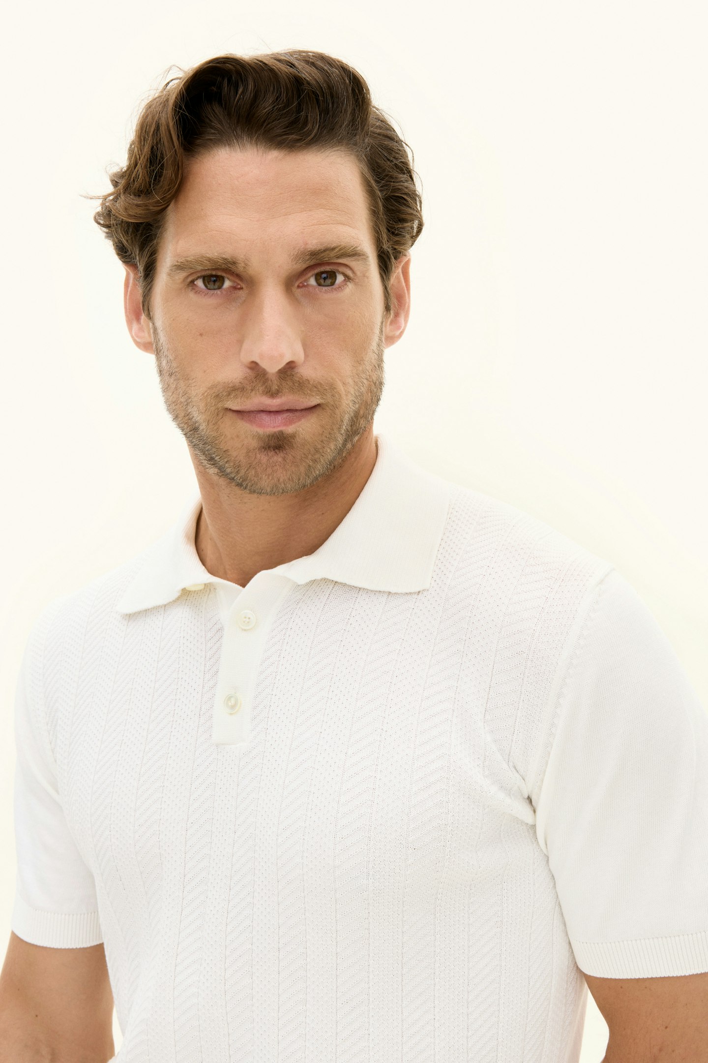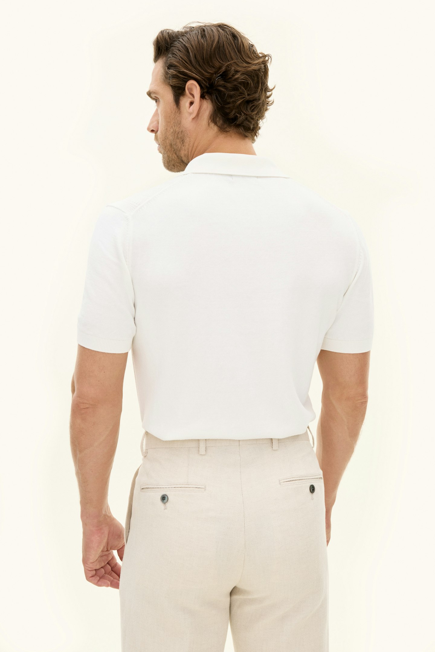 Short-sleeved collar knit in cotton with an elegant structure at the front, knitted in 12gg. The jumper has a moulded collar and is decorated with three mother-of-pearl buttons at the front. A stylish garment that works just as well on its own as under a blazer.
