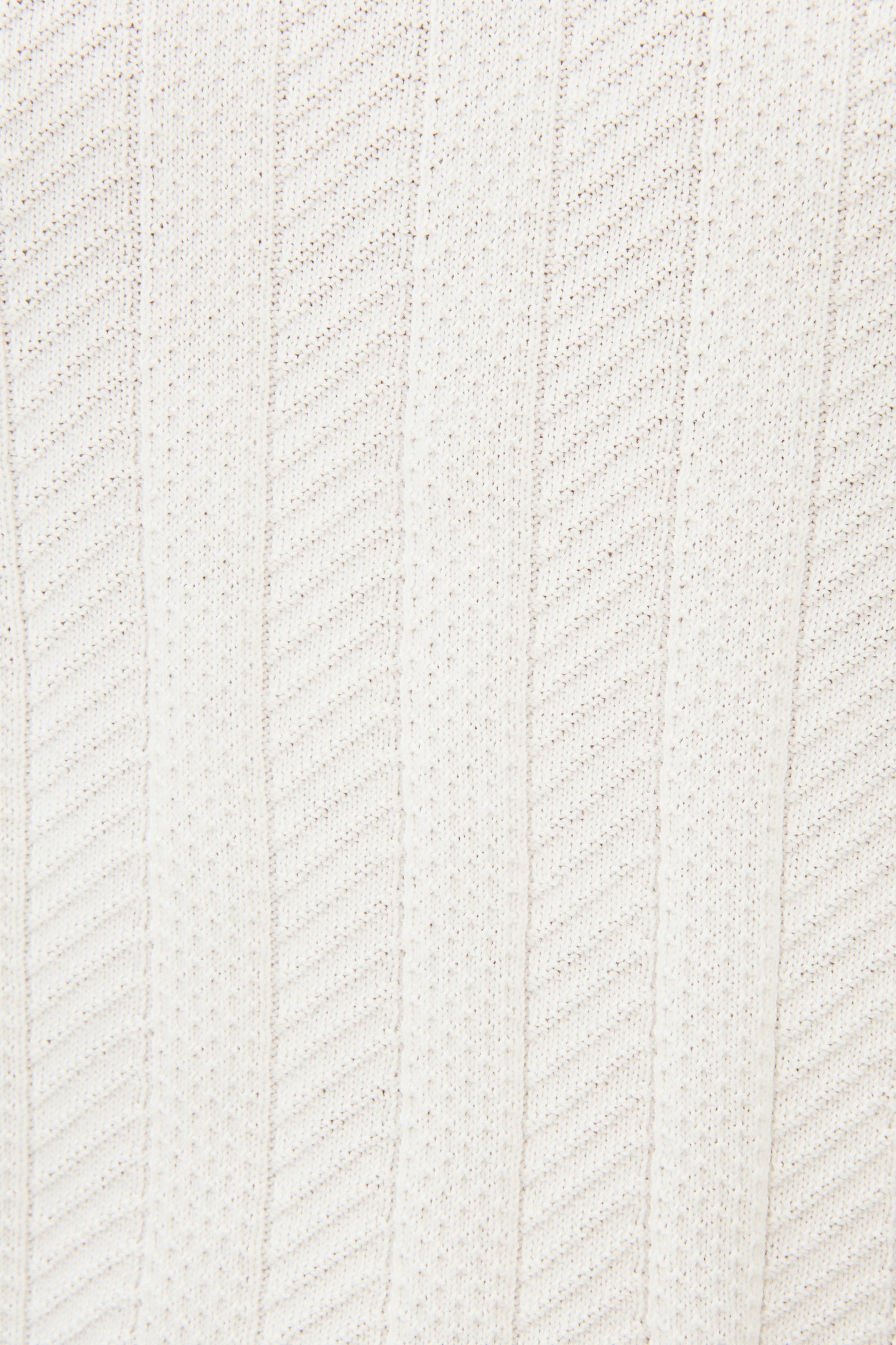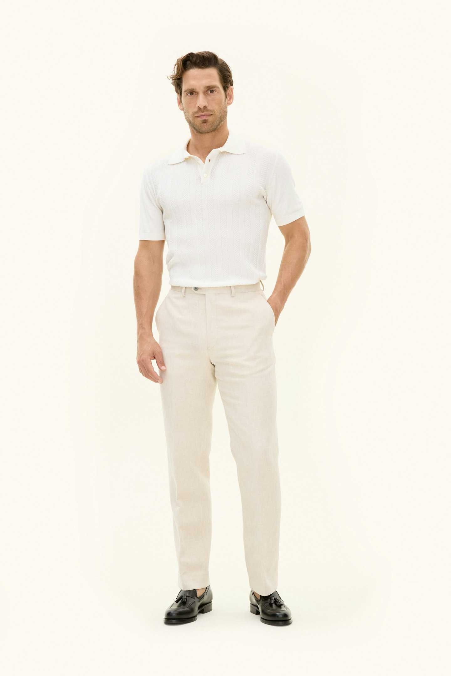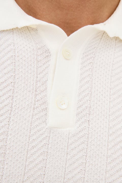 Short-sleeved collar knit in cotton with an elegant structure at the front, knitted in 12gg. The jumper has a moulded collar and is decorated with three mother-of-pearl buttons at the front. A stylish garment that works just as well on its own as under a blazer.