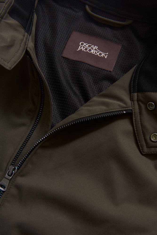 A shorter spring jacket with a two-way zipper and functional inside and outside pockets. The external membrane is made of a lightweight wind and water-resistant softshell material with a four-way stretch.
