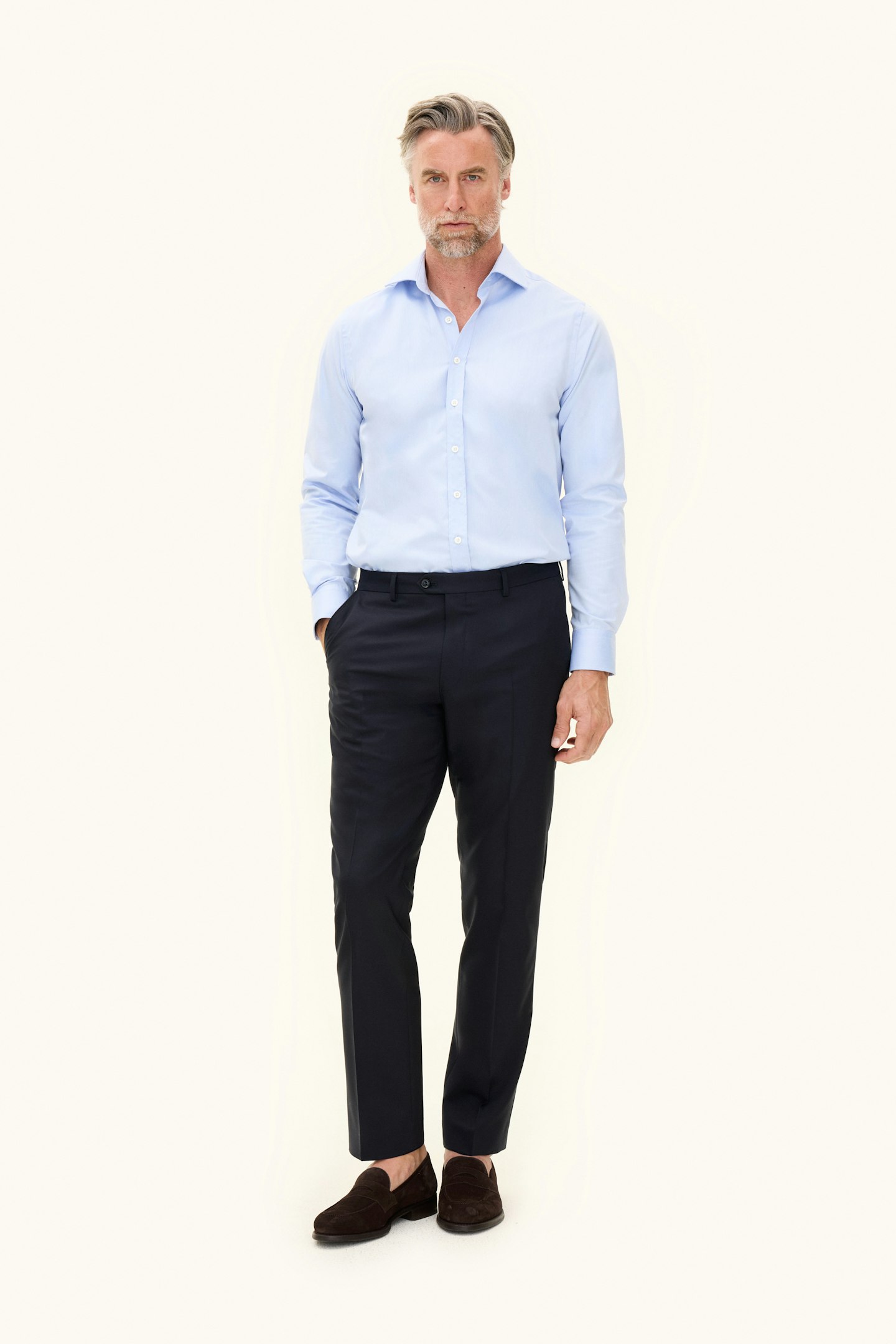 Regular fit trousers in 100% wool with an elegant microstructure. Normal waist height and the leg ends just over the shoe for a natural fall.