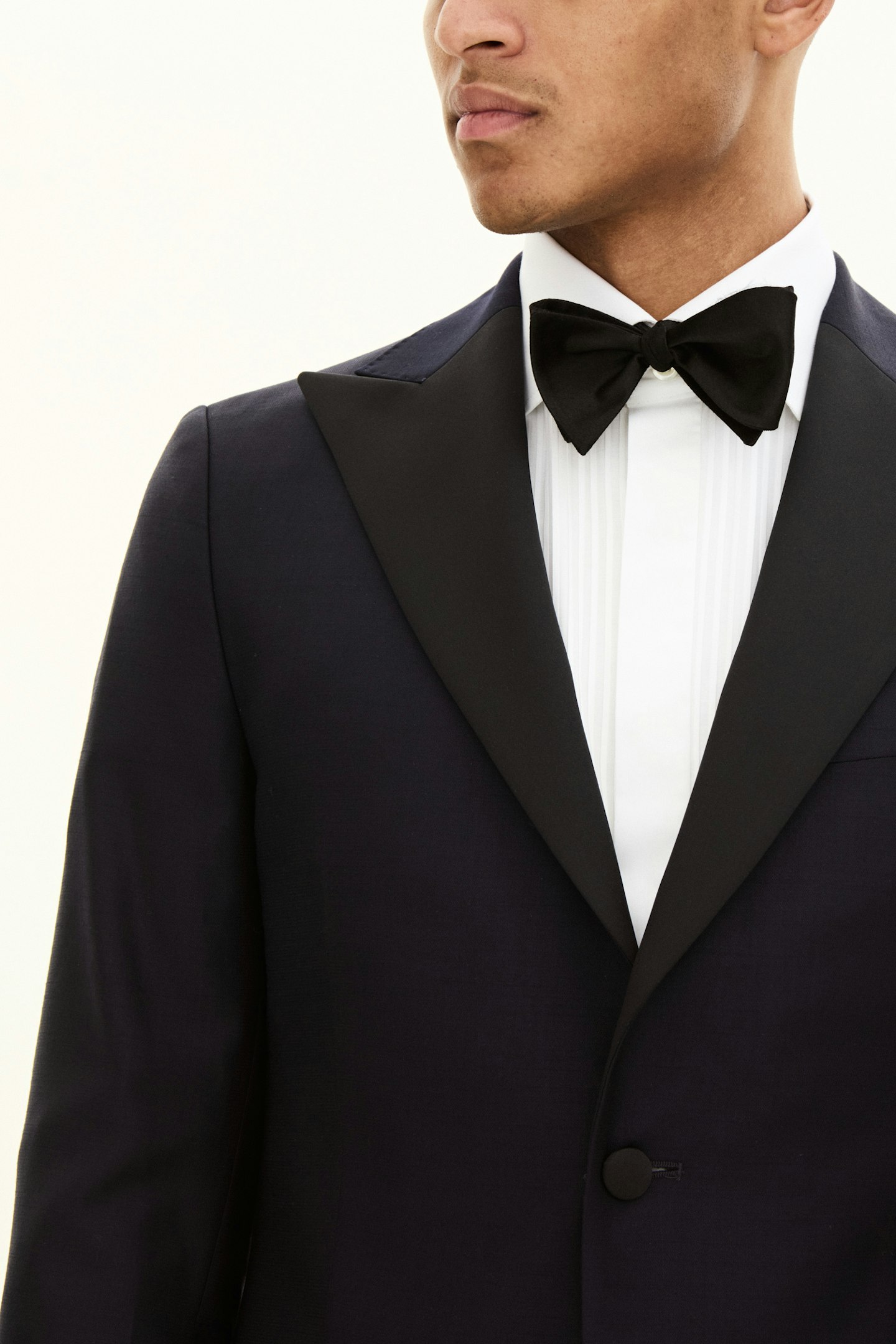 This classic tuxedo blazer has a modern slim fit and wide peak lapels made of silk. The blazers material is a classic, fine wool weave with a luxurious feel. Choose between the classic colours black or midnight blue.