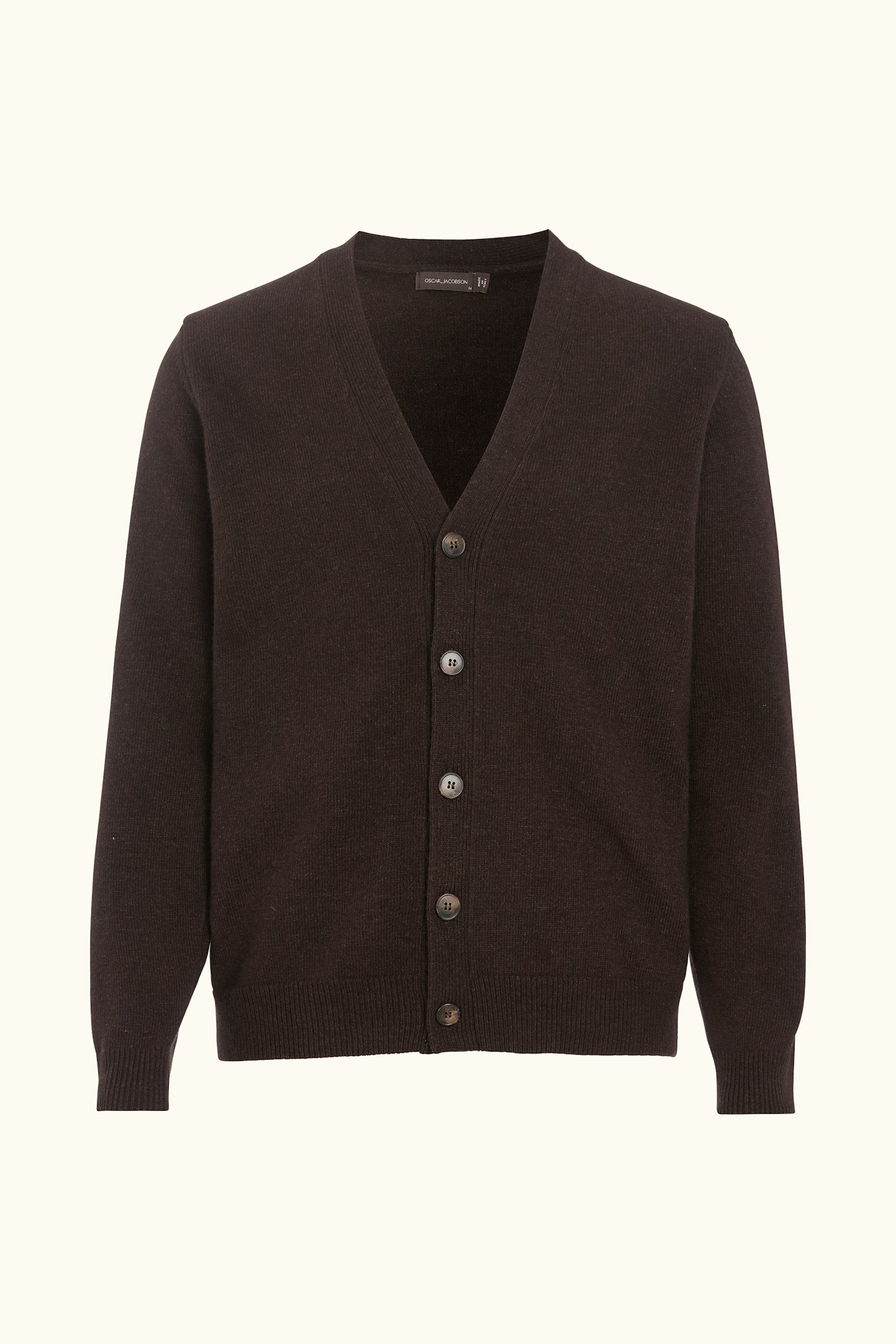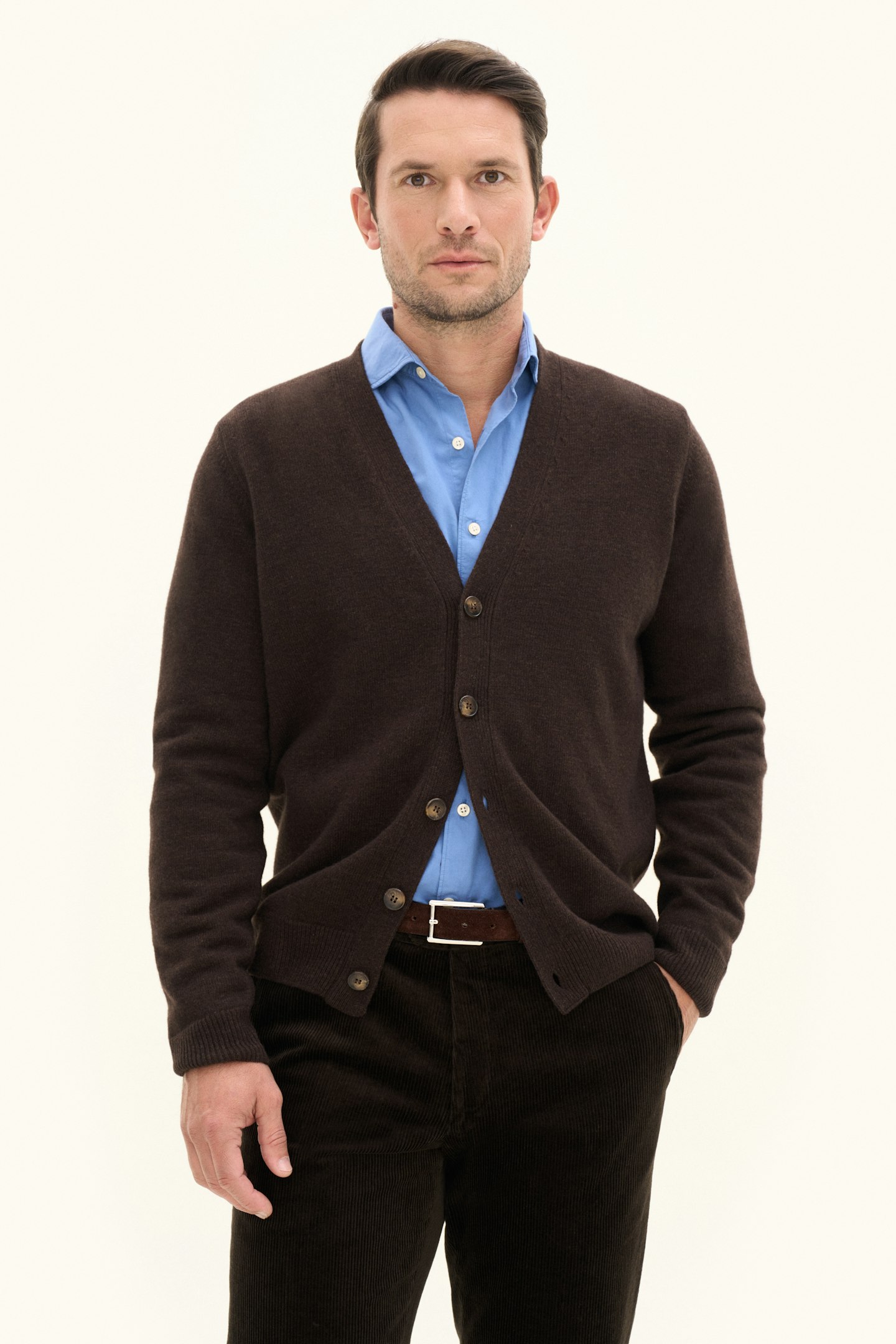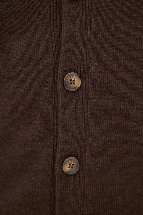 Classic cardigan style with brown buttons down the front. Traditional 1x1 ribbing at the cuffs and hem. Regular fit, making it perfect for wearing over a shirt or T-shirt. Knitted in 7gg in a soft and fine blend of lambswool.