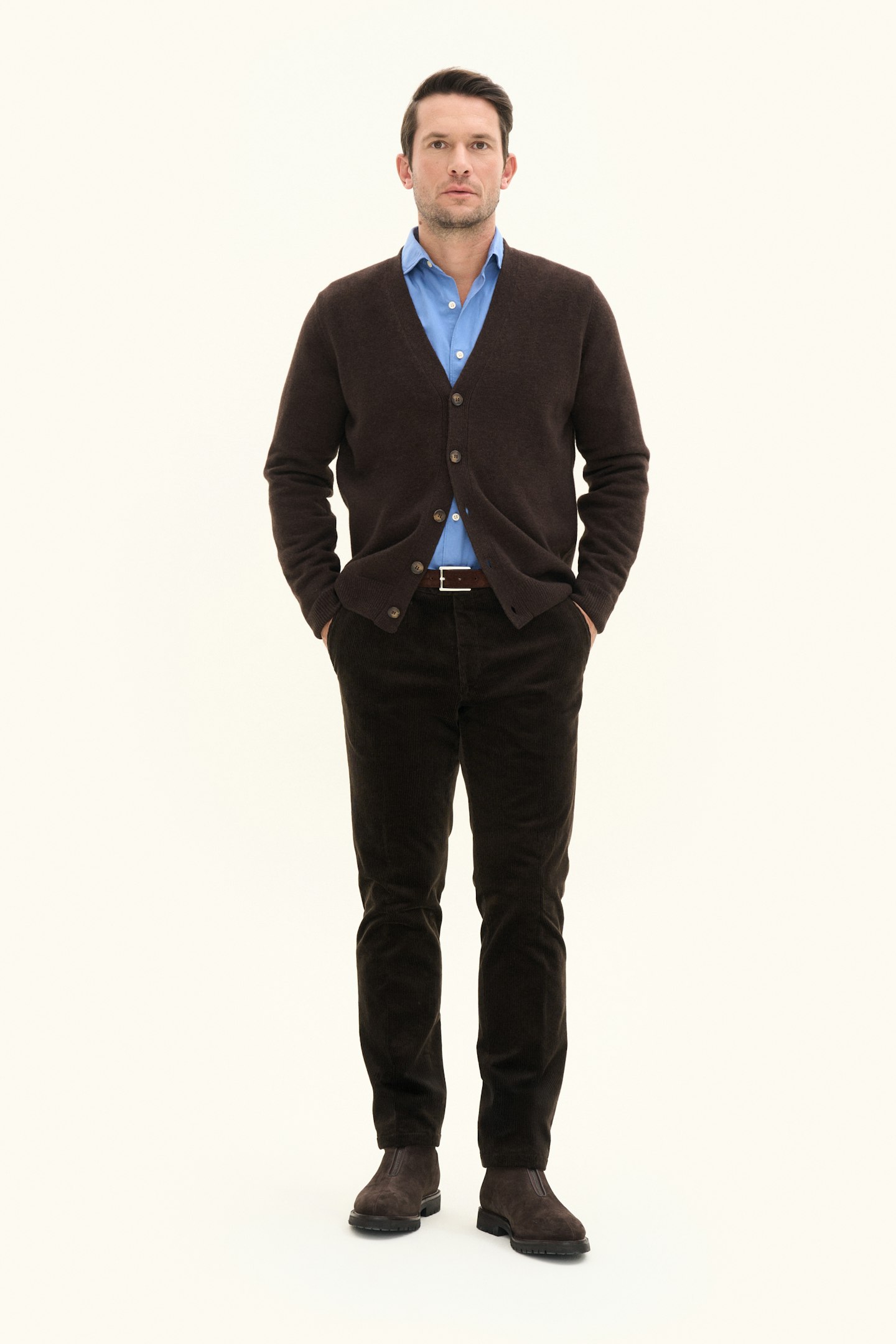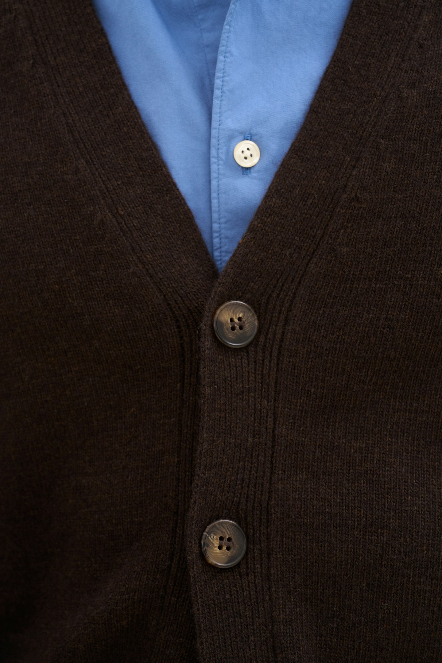 Classic cardigan style with brown buttons down the front. Traditional 1x1 ribbing at the cuffs and hem. Regular fit, making it perfect for wearing over a shirt or T-shirt. Knitted in 7gg in a soft and fine blend of lambswool.