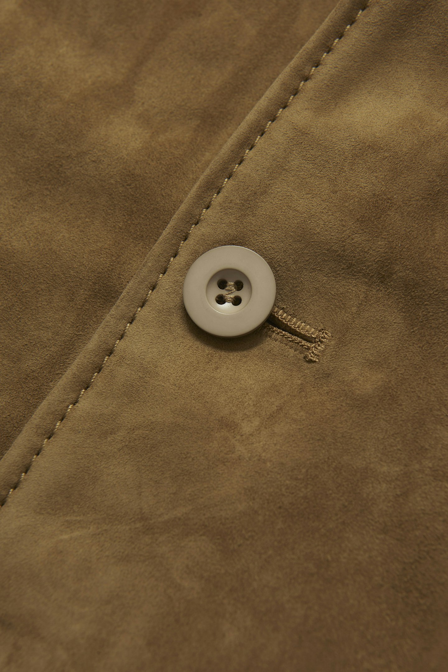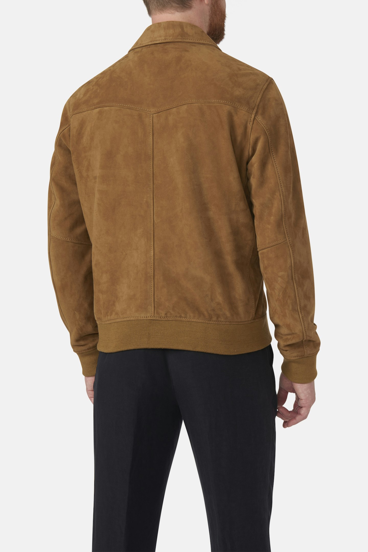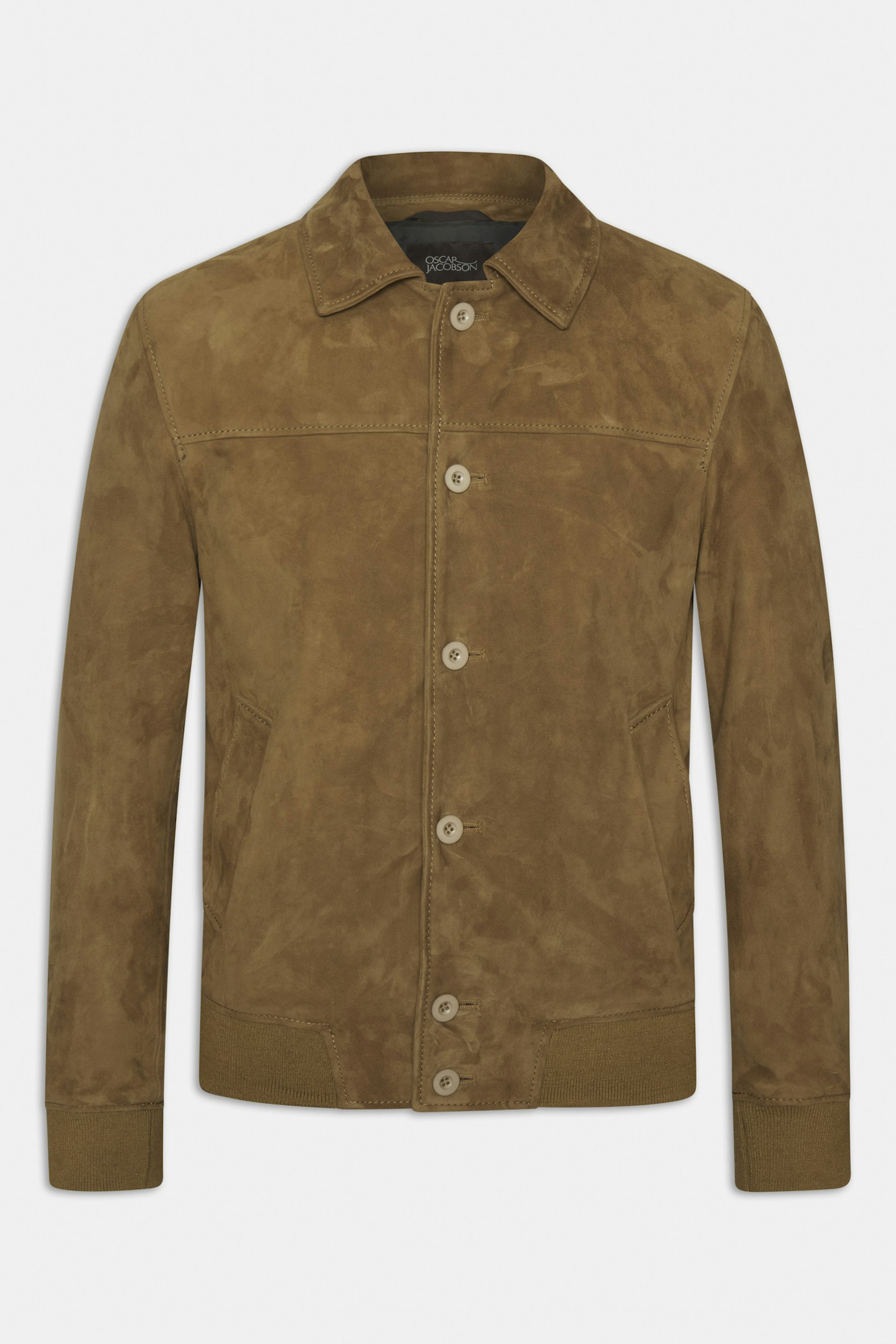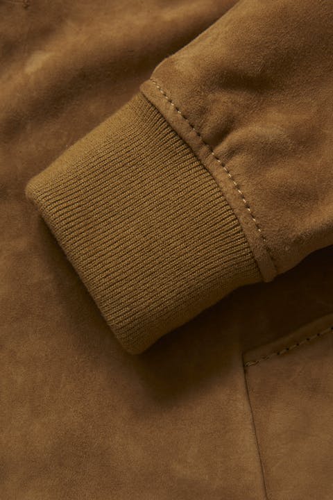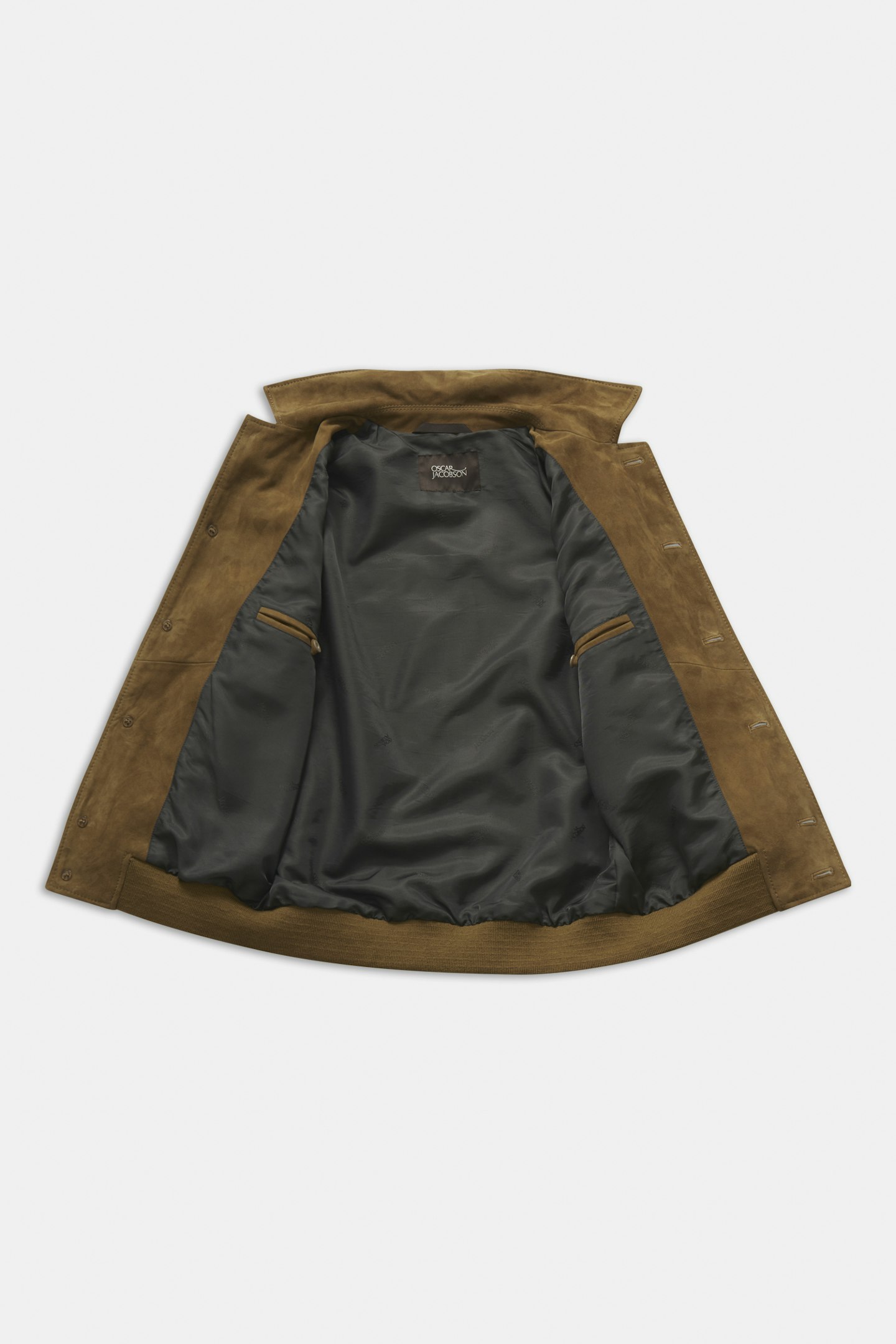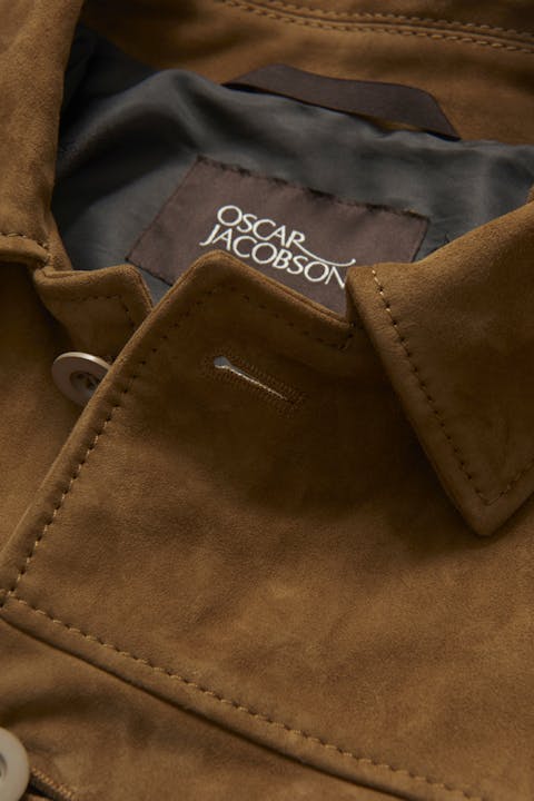 Semsket skinnjakke med elastiske mansjetter nederst på jakken, og ved mansjettene. Utstyrt med praktiske sidelommer, doble innerlommer og et tynt fôr av viskose. Vi anbefaler å gå opp en størrelse, da jakken er litt liten i størrelsen.