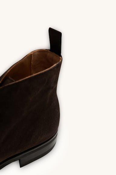 Goodyear-randsydde Chukka-støvler i eksklusiv italiensk mocka, som tilpasser seg fotens form. Håndlaget i Spania. Dainite gummisåle for bedre grep, slitestyrke og vanntetthet i utfordrende værforhold. En myk dempende innersåle i memory foam som former seg etter foten. Konstruksjonen gjør det mulig å bytte såle i fremtiden, slik at du kan ha skoene lenge, og med vår nye bindsåle i skinn tåler skoene enda flere sålebytter.