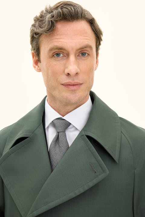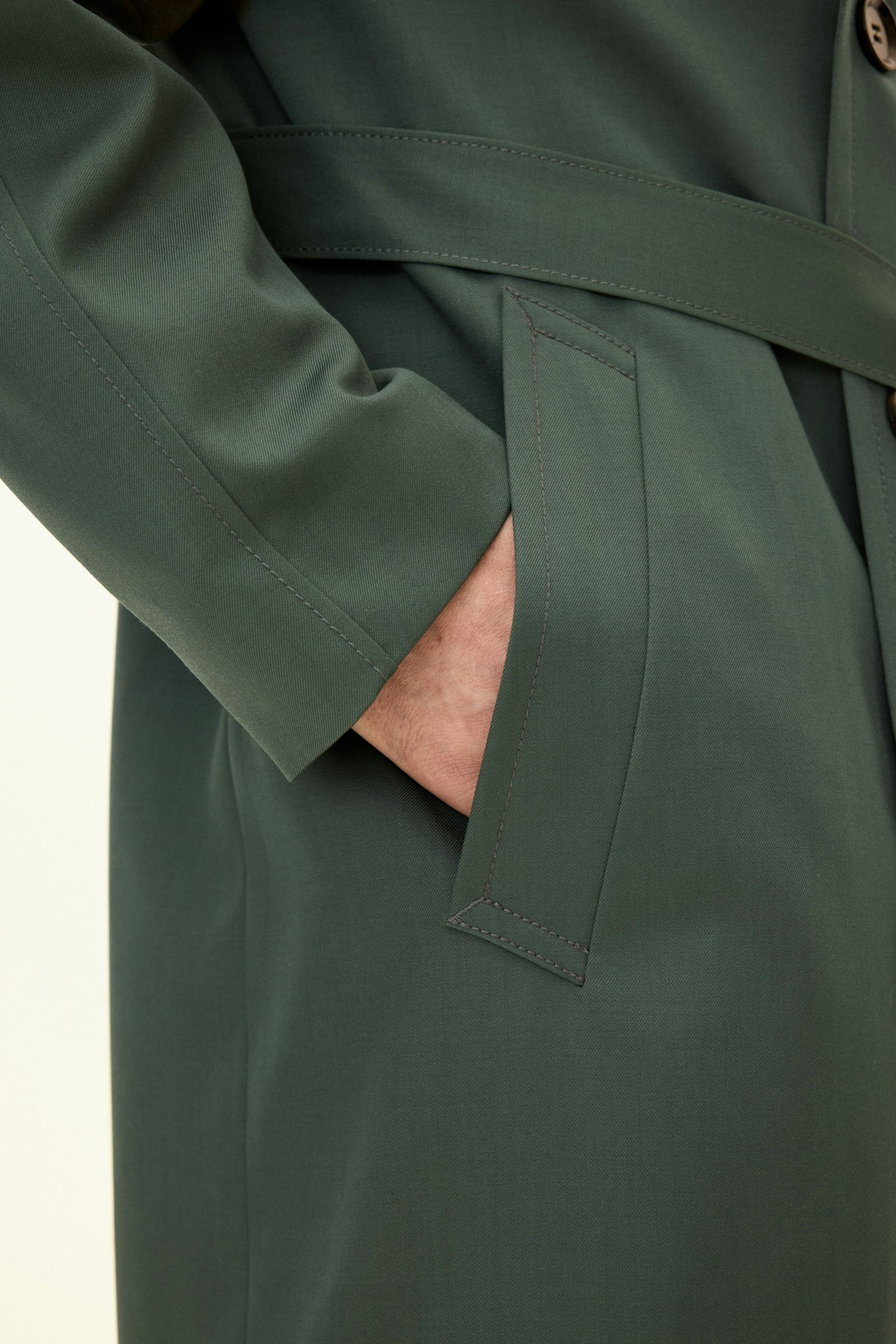 En dobbeltspent kåpe i gabardinvevd ull med raglanærmer som gir den et mykt og naturlig fall. Det rene designet og den klassiske silhuetten gjør denne modellen til et tidløst ytterplagg for kjøligere årstider.