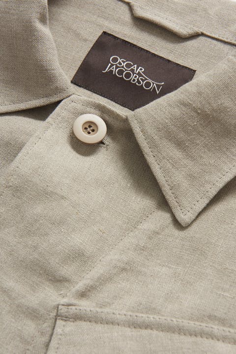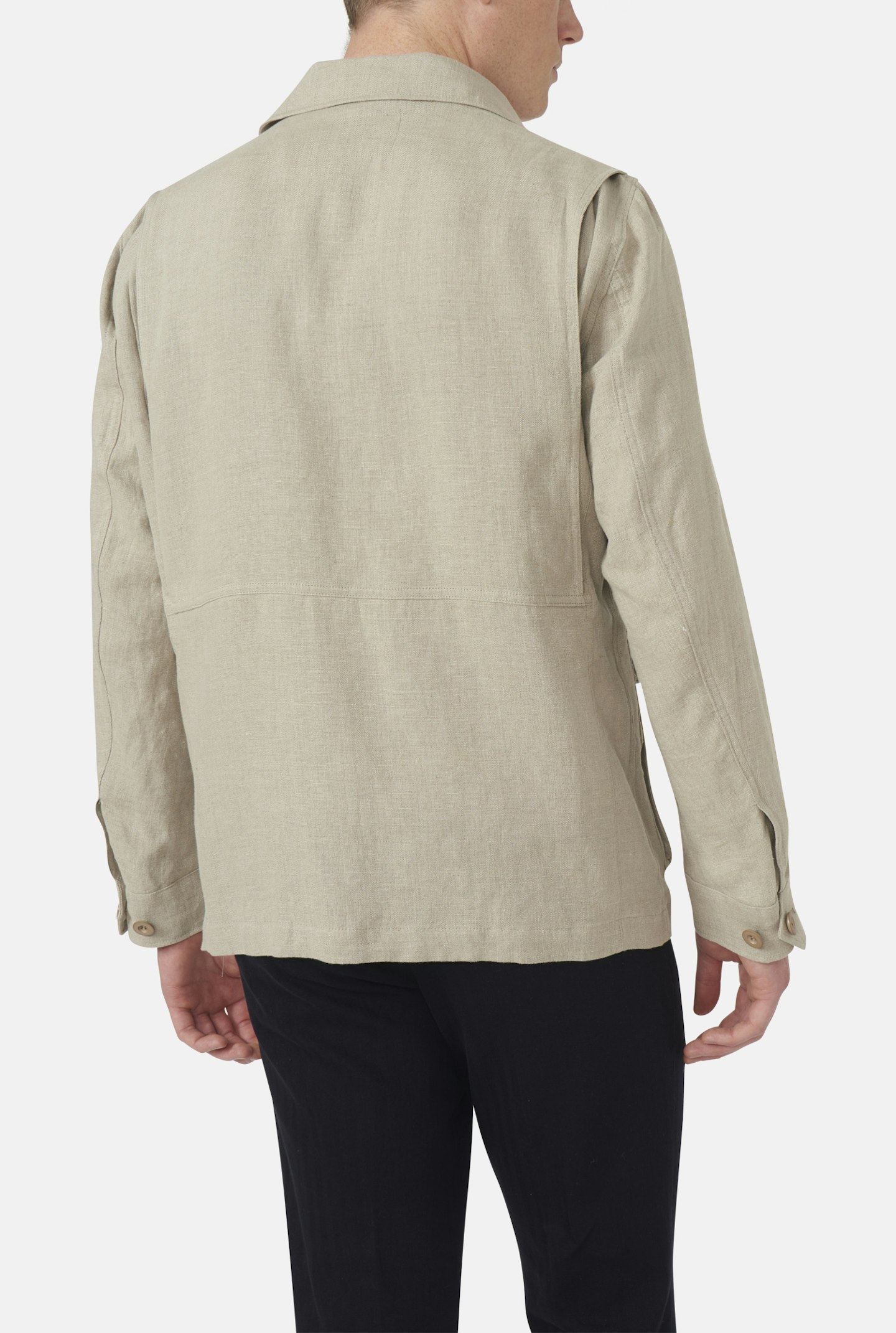 Jakke i safaristil med detaljer inspirert av arbeidsklær. Jakken er laget med doble midje- og brystlommer, utstyrt med skjult knappelukking. Her presentert i et robust linmateriale med et vasket utseende.