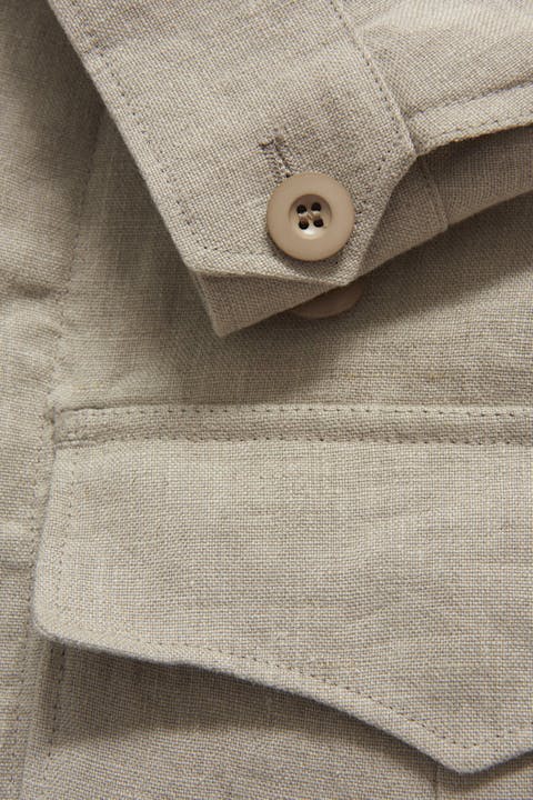 Jakke i safaristil med detaljer inspirert av arbeidsklær. Jakken er laget med doble midje- og brystlommer, utstyrt med skjult knappelukking. Her presentert i et robust linmateriale med et vasket utseende.