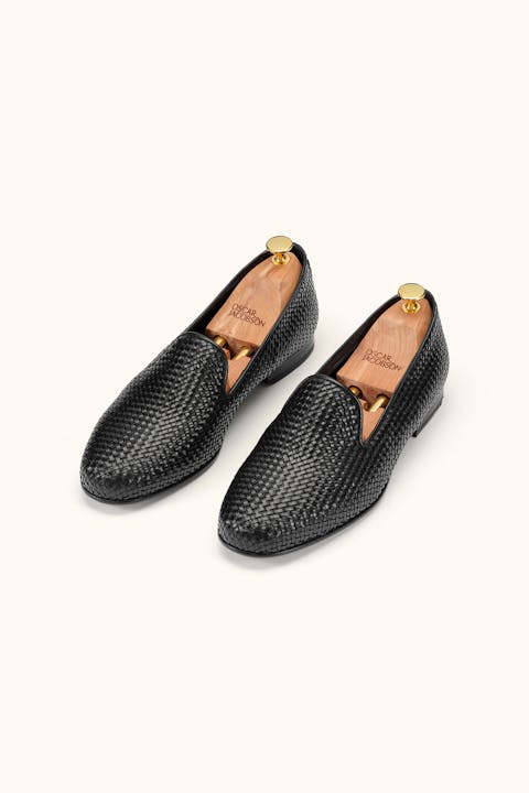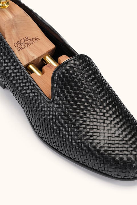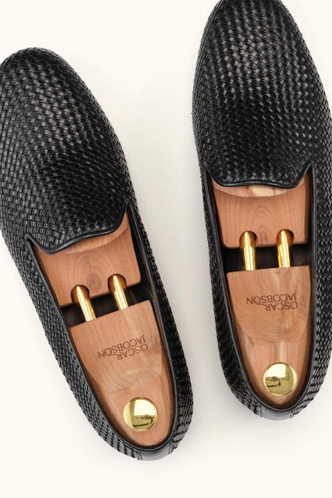 Elegant smokingtøffel laget i flettet kalveskinn med overdel i luksuriøs fløyel. Den klassiske silhuetten kombinerer komfort med et sofistikert uttrykk, perfekt for formelle anledninger. Glatt skinnsåle og diskrete detaljer gir et stilrent inntrykk.