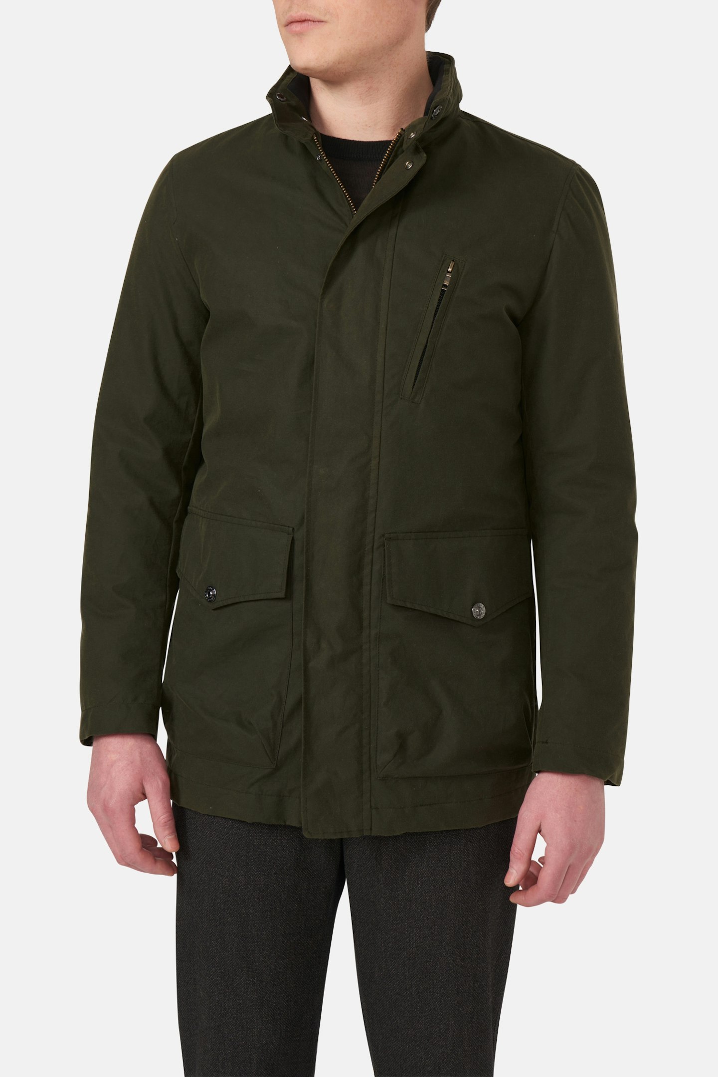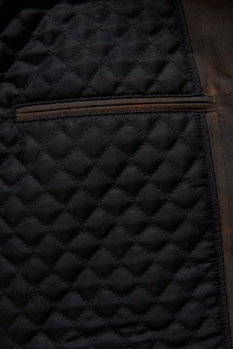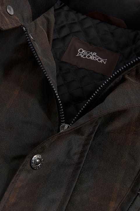 Klassisk jakke av et vokset bomullsstoff fra et veletablert engelsk veveri. Den voksede overflaten har en lang tradisjon, som begynte med behovet av å gjøre bomullsvev vanntett. Etter en tids bruk skapes en unik patina etter bærerens bruksmønster. Voksen er en ferskvare og kommer til å trenge et nytt vokslag etter en stund. Utstyrt med doble innerlommer, samt vattert varmende fôr og ståkrage.