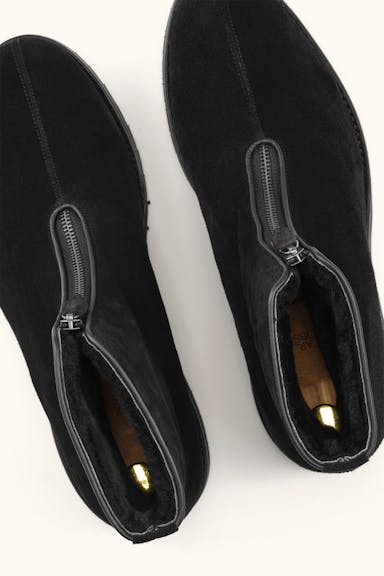 Goodyear-sydde Mountain Boots laget i eksklusivt Italiensk semsket skinn som tilpasser seg foten. Håndlaget i Spania. Skoen kommer med en Commando-såle i gummi for optimalt grep, slitestyrke og vannbestandighet i utfordrende vær. Sålen er festet med en Storm Welt rundt sålekanten for å bedre beskytte konstruksjonen fra fukt, og skoen er pelsfôret for å holde føttene varme i vinterkulden. Skoen har en mykt dempende innersåle i memory foam som former seg etter foten. Konstruksjonen muliggjør fremtidig omsåling, og med vår nye binnsåle i lær tåler skoen enda flere sålebytter.