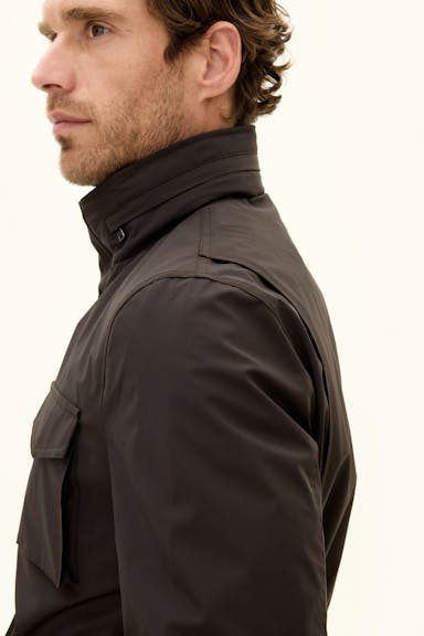 Our Field Jacket in Nylon Shell is a stylish and functional version of the classic M-65 jacket designed to complement both a blazer or a more casual knit sweater. With six external pockets and three inner pockets, you have space for everything you need to carry, and the option to protect your hands in tough weather conditions. The back is designed with an “action back” to give you additional mobility in the garment, and the waist is marked with adjustable drawstrings for a personalized fit. The inside is lined with ripstop fabric and includes buttons for attaching our liner vest. Nylon Shell is our three-layer outer shell material, developed to provide protection against weather and wind without compromising on mobility, breathability, or style.